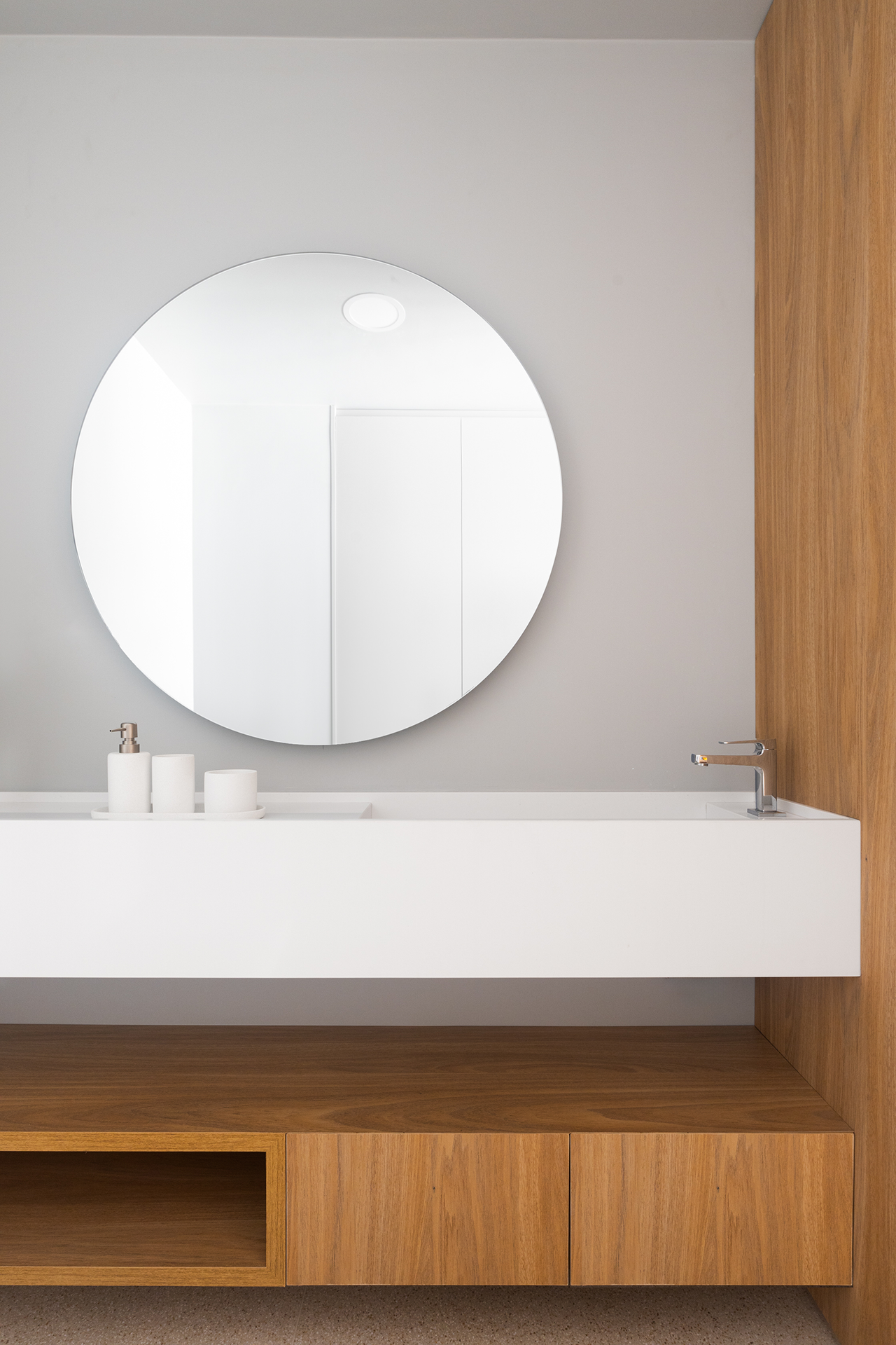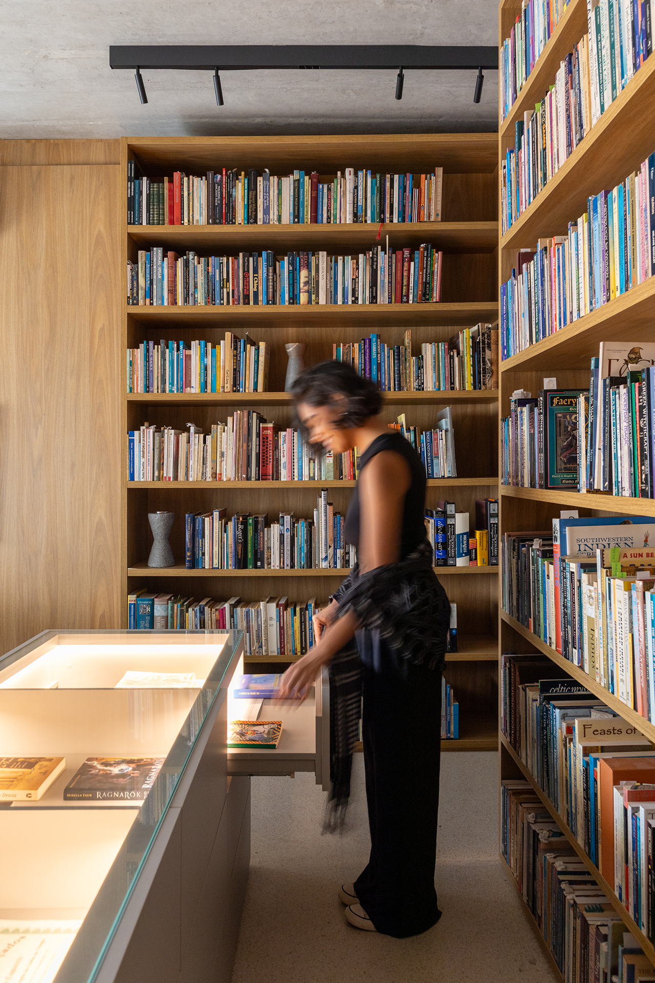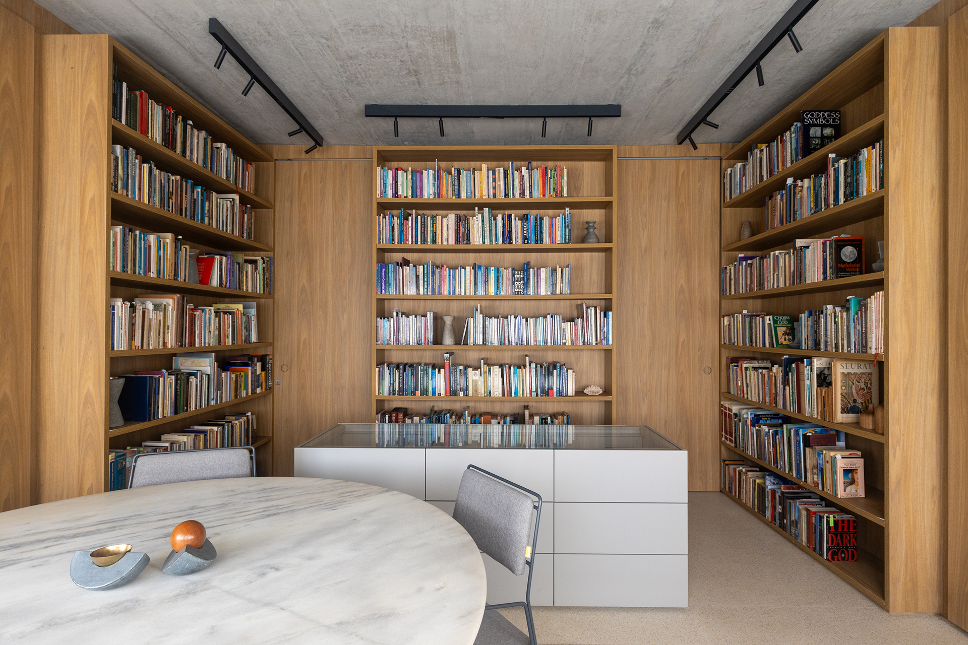 Destaca-se a ilha funcional, projetada para a exposição de certificados e livros importantes, além de servir como apoio de armazenamento. Este elemento combina uma função prática com uma presença estética, reforçando o caráter contemplativo do espaço.