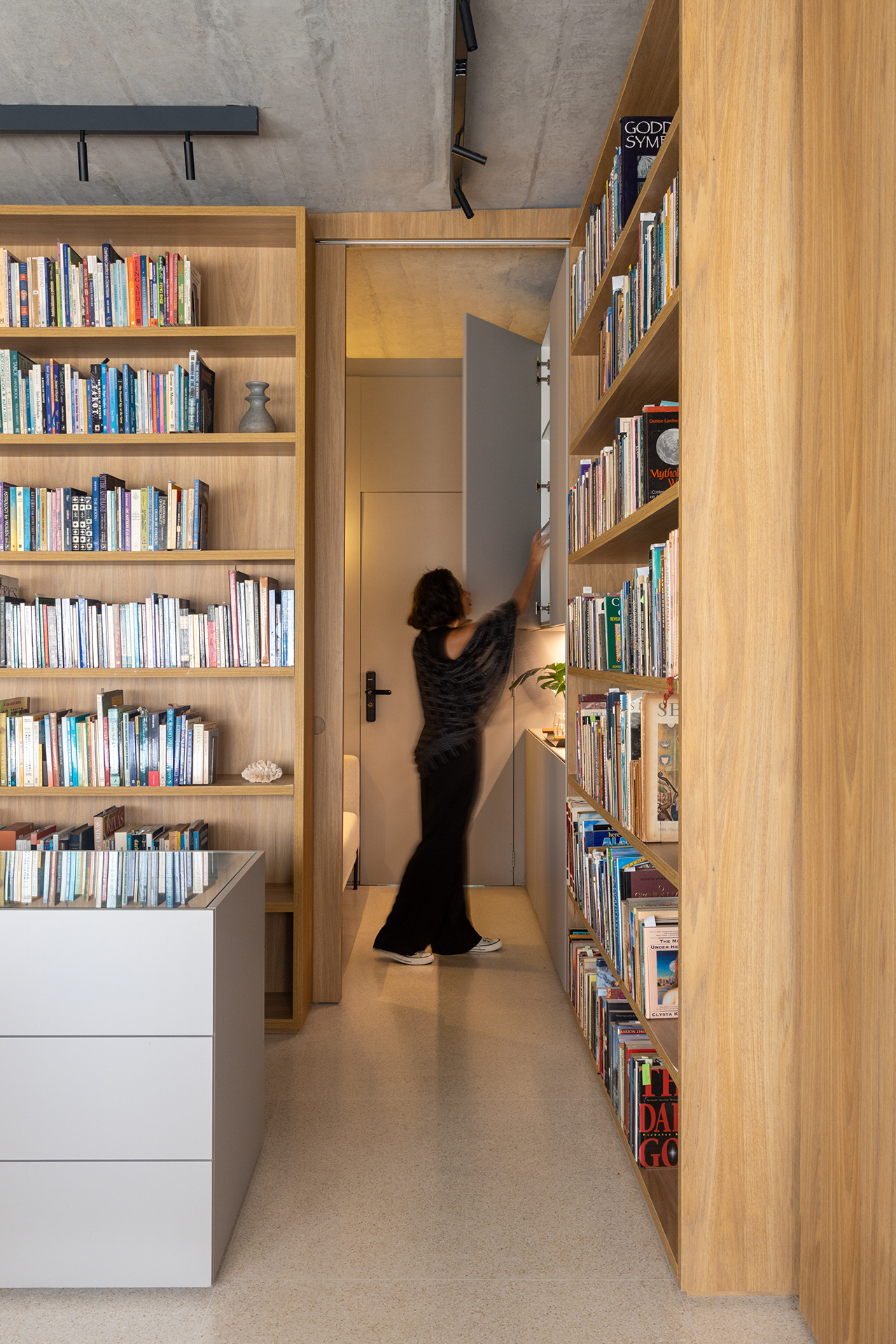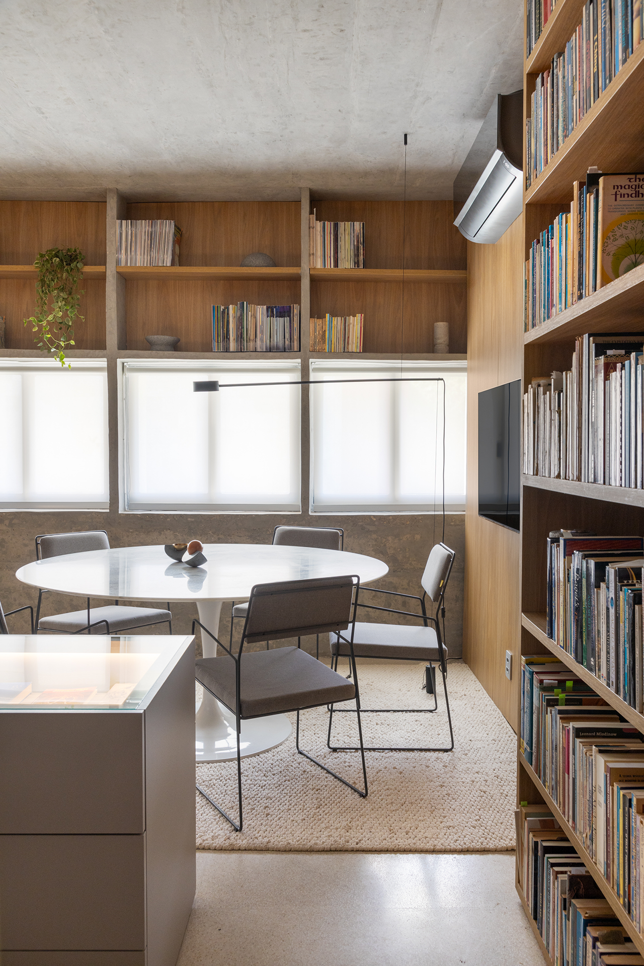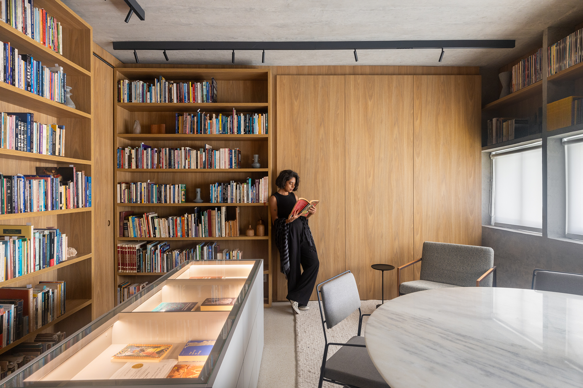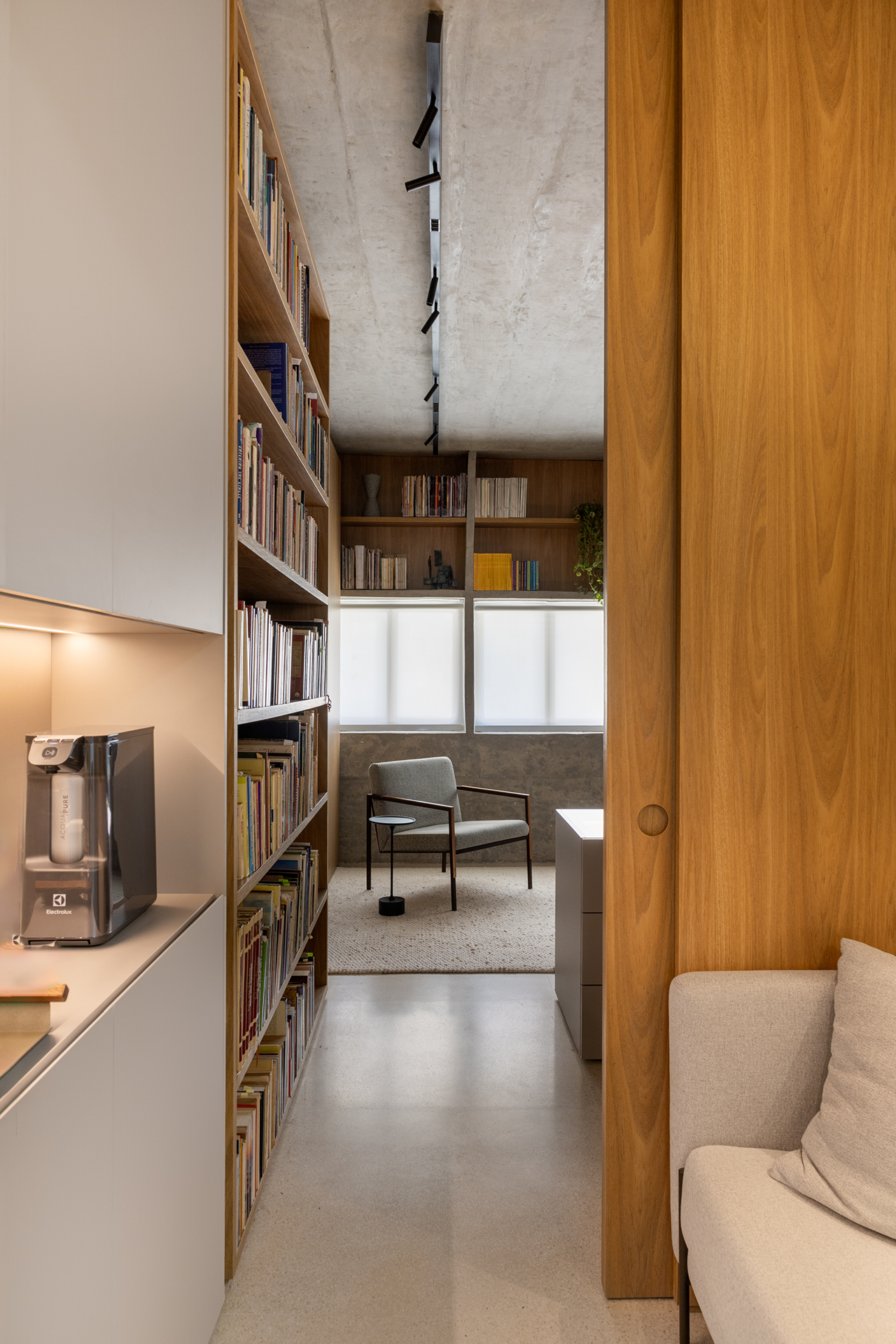 O projeto inclui uma área de entrada, uma área de acervo bibliotecário e um banheiro. As estantes de piso a teto, que organizam os livros, integram-se harmoniosamente com as portas que dão acesso ao banheiro e à entrada da sala, criando uma sensação de continuidade e unidade no ambiente. O banheiro, com sua marcenaria planejada, une estética e funcionalidade, acomodando itens pessoais e de manutenção da sala. O peitoril contribui para uma atmosfera acolhedora e oferecem um suporte para a contemplação da vista da sala.