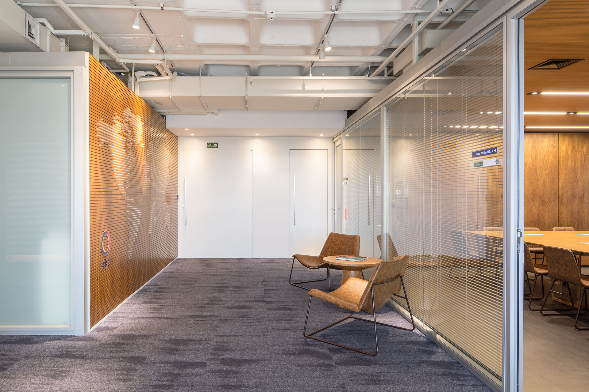 Outro destaque do projeto vai para o conforto acústico, pensado durante a escolha de todos os materiais. Em todas as salas de trabalho, foi especificado um forro com placas acústicas minerais removíveis (Sonex) e divisórias com preenchimento acústico (lã de garrafas pets). O forro das salas de reunião foi revestido com painel ripado Nexacustic, tal qual as paredes, visando o destaque material desses ambientes e garantindo um bom isolamento sonoro durante as reuniões. Os carpetes utilizados, nas áreas comuns (azul cobalto) e salas de trabalho (cinza), também colaboram para a diminuição dos ruídos.