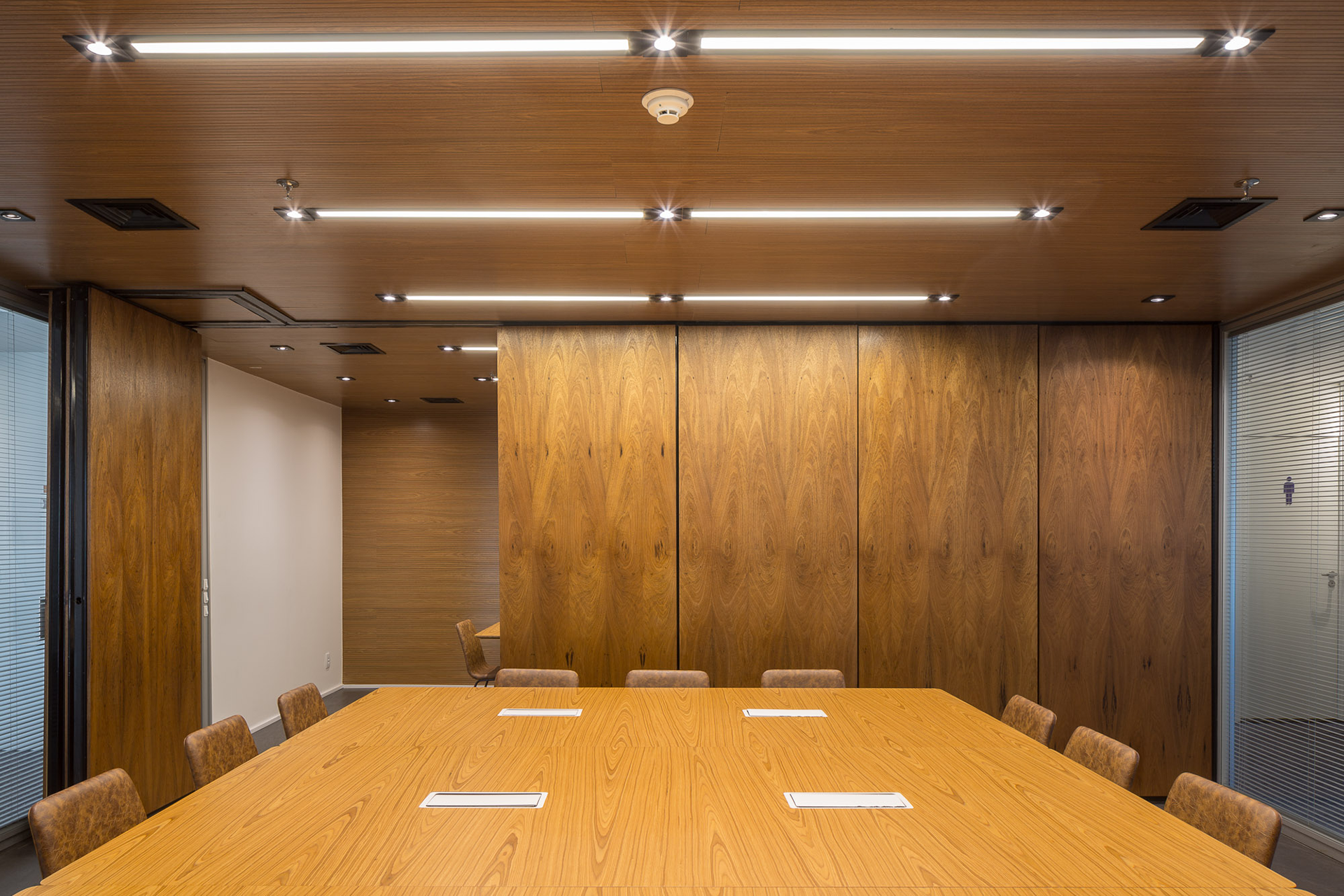 A sala de reunião possui local de destaque no projeto e soluções versáteis para atender a todas as demandas da Agência. O espaço possui layout flexível devido ao uso de uma divisória retrátil que permite a separação em duas salas de reunião menores ou sua integração para eventos de maior porte. Para tanto, especificamos todas as mesas com a mesma dimensão (incluindo a da copa), de forma a permitir arranjos variados internamente.
