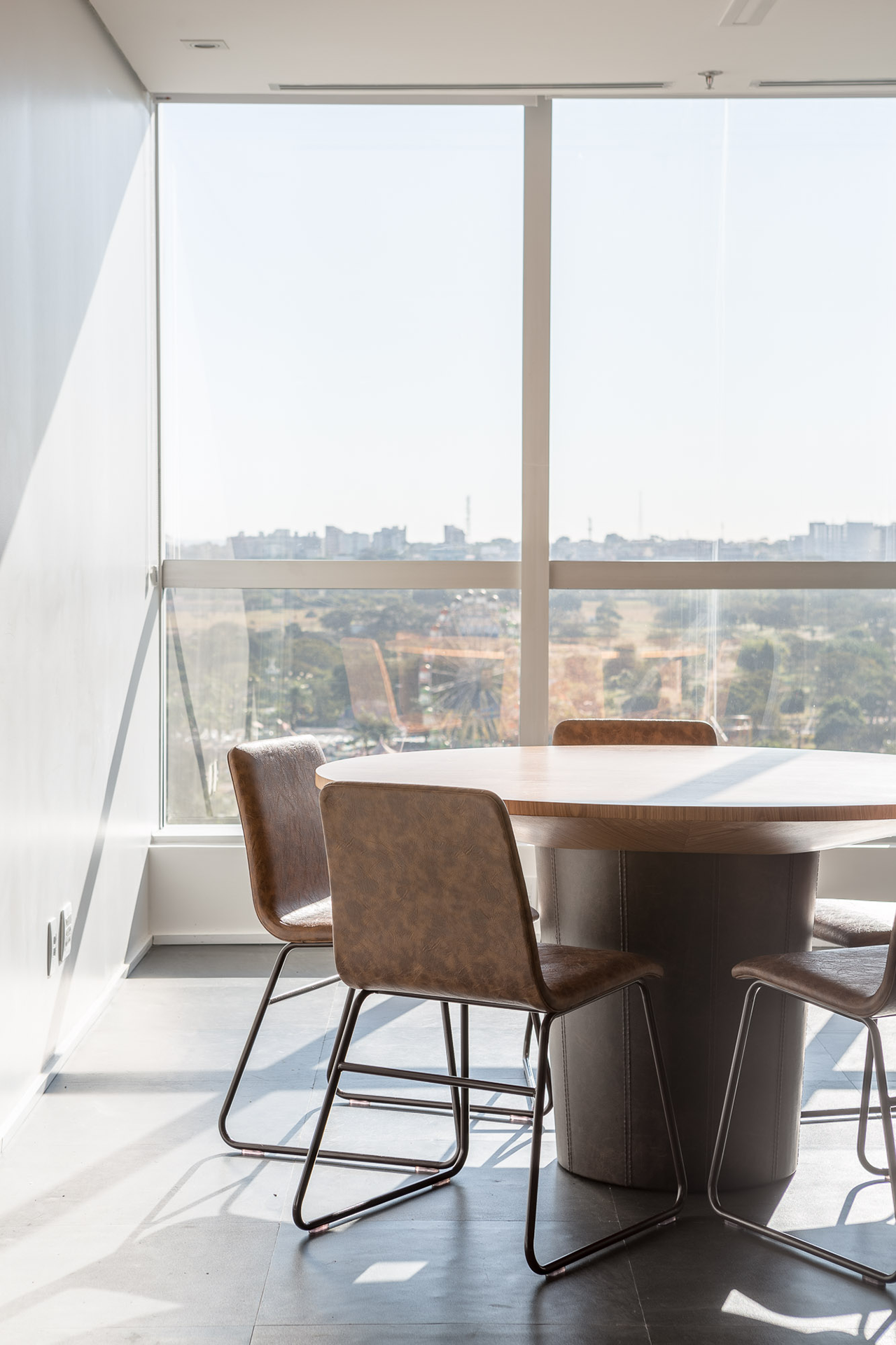 Os demais móveis escolhidos são da Doimo Brasil, fábrica moveleira de Ribeirão das Neves. De lá, especificamos as mesas da sala de passagem (Joy, freijó e couro caramelo) de reunião e copa (Slim, Freijó), mesas laterais dos espaços de estar (Eclipse, Freijó), poltronas de estar da recepção (Evo, couro caramelo) e da diretoria (Mito, couro caramelo), as cadeiras de reunião e copa (Presto, couro caramelo), e as banquetas do café (Presto, couro caramelo).