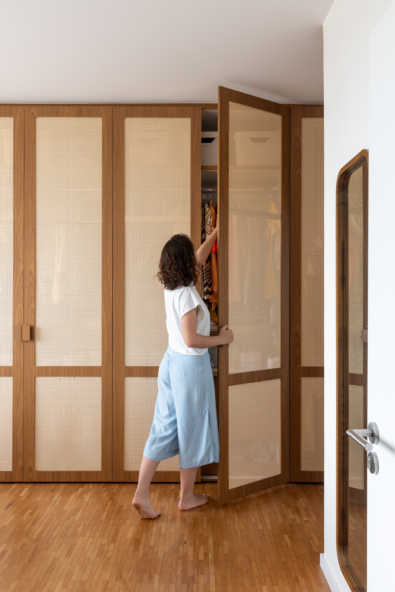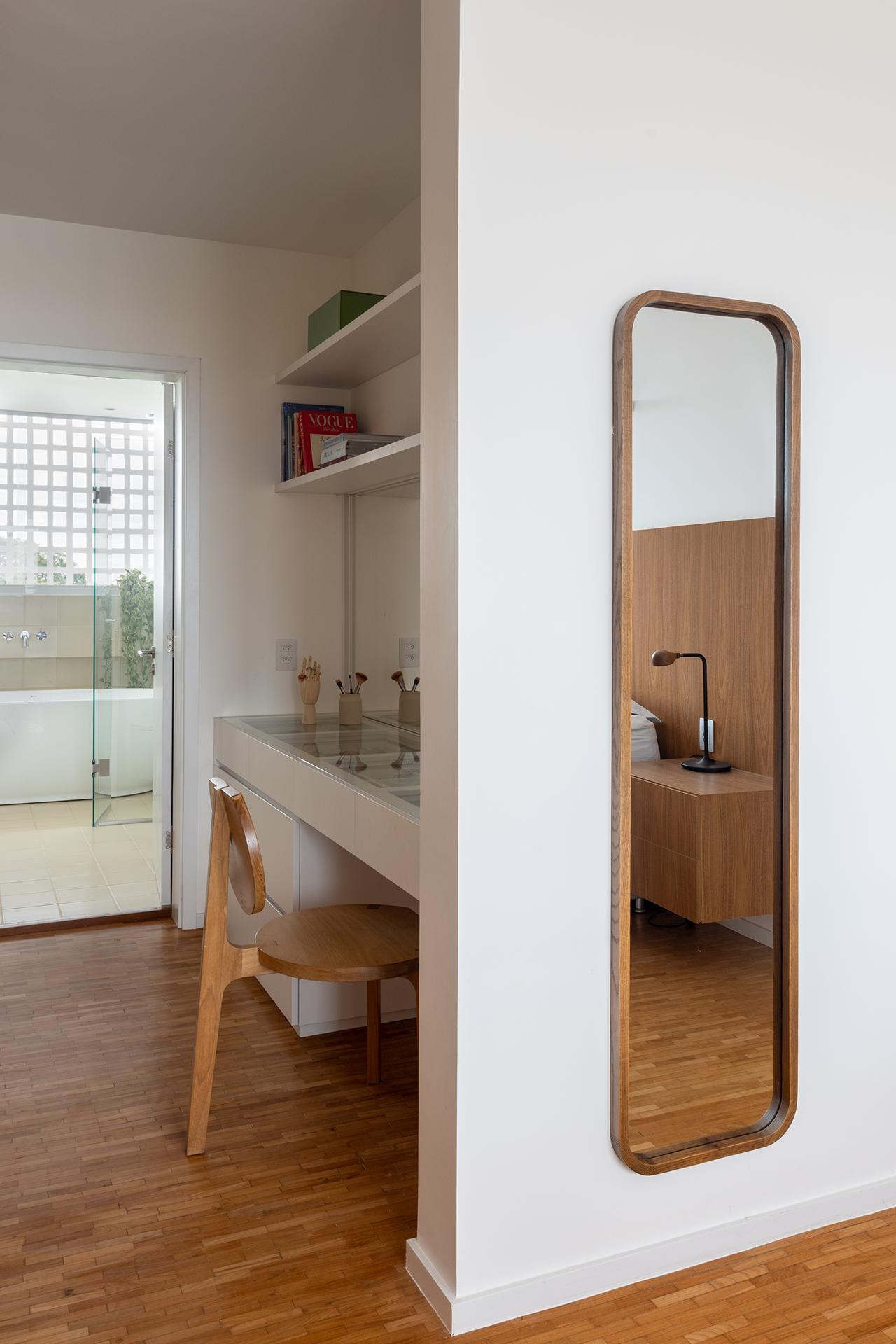 Nos quartos infantis, o mobiliário foi cuidadosamente planejado para acompanhar o crescimento das crianças, com camas que possuem gavetões amplos e nichos para livros, proporcionando praticidade e organização. O banheiro infantil, com seu design lúdico, utiliza cores vibrantes e formas hexagonais para criar um espaço alegre e convidativo. Na suíte principal, o destaque é o grande armário de madeira com detalhes em palhinha, complementado por uma penteadeira. O banheiro da suíte, espaçoso e equipado com uma banheira, oferece um ambiente de relaxamento e conforto.