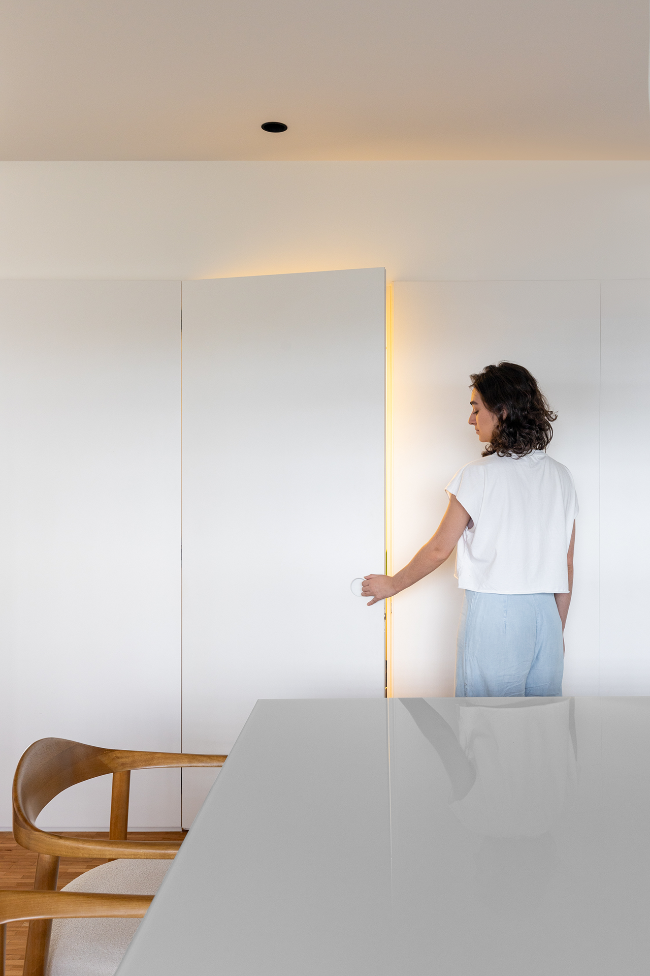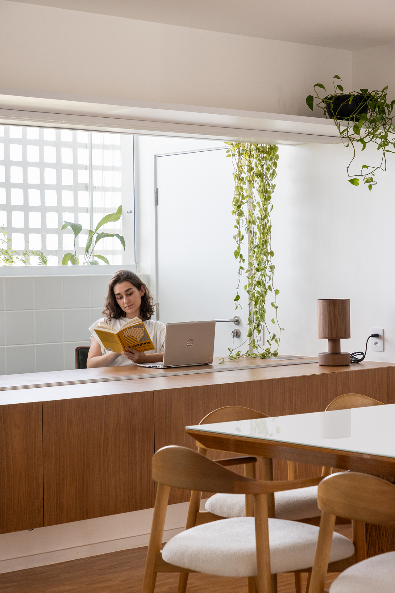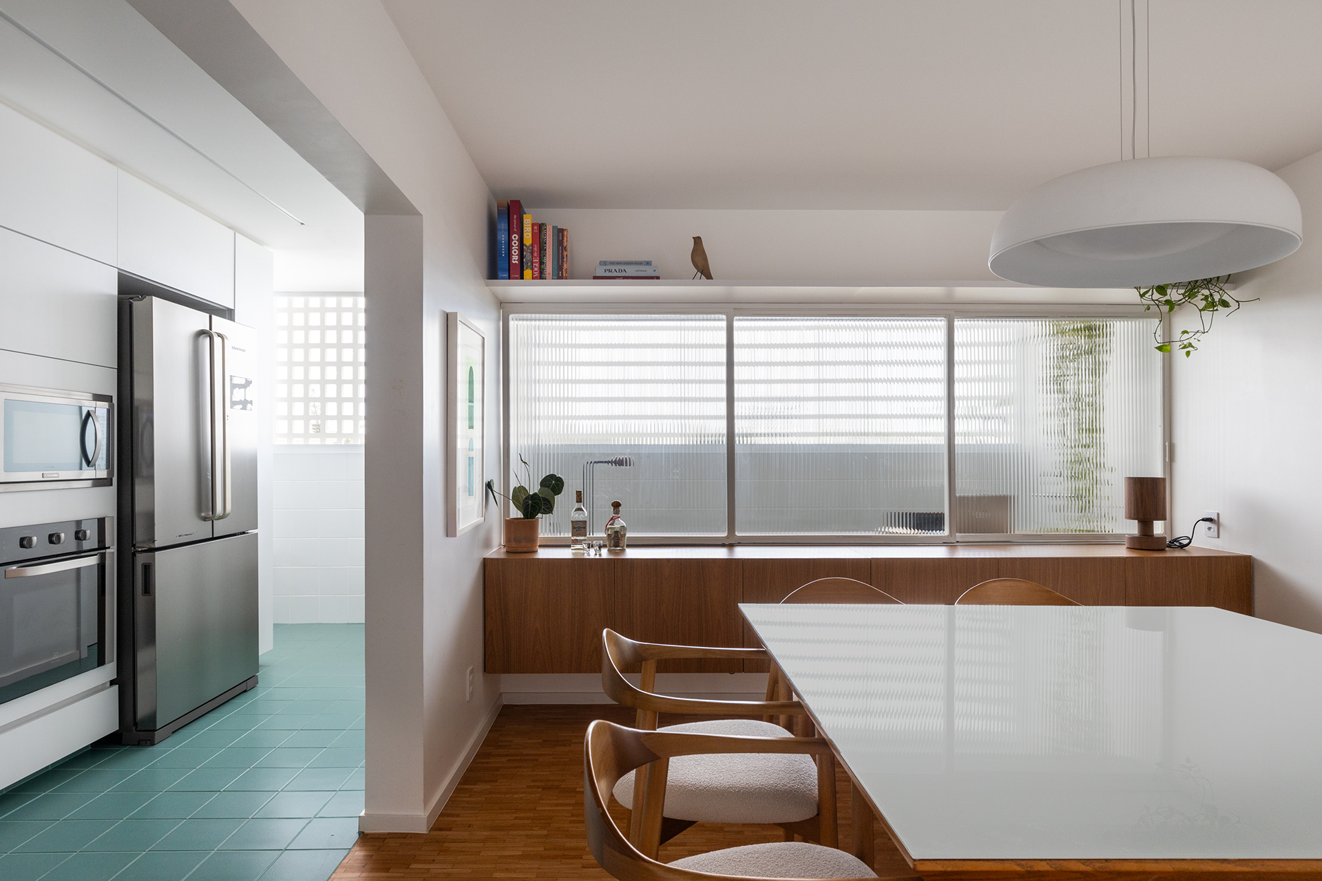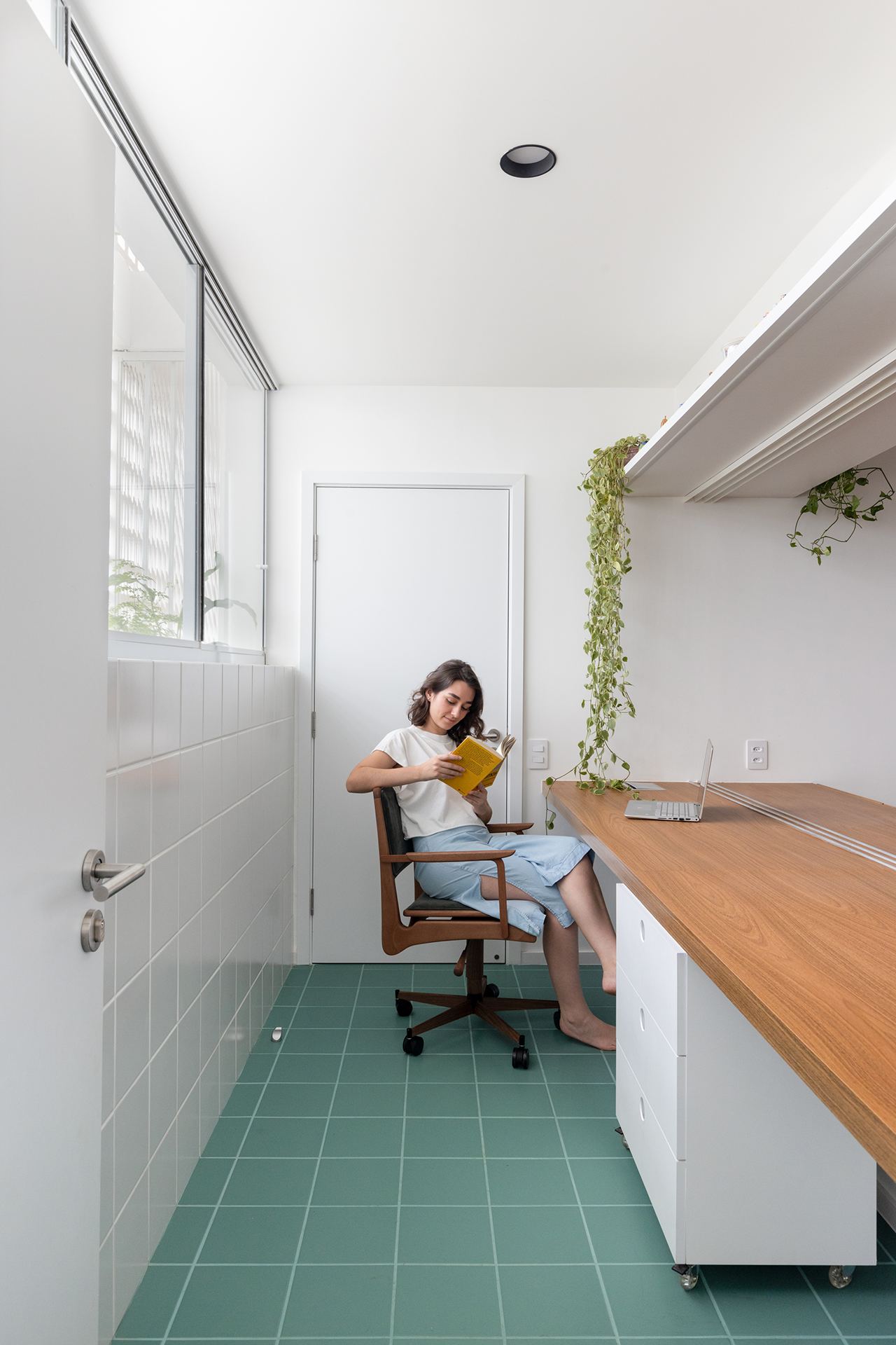 A cozinha, embora integrada à sala de jantar, é claramente demarcada pelo revestimento verde, definindo o espaço sem comprometer a fluidez do ambiente. A conexão entre a sala de jantar, a cozinha e o escritório cria um espaço contínuo, permitindo a entrada de luz natural e reforçando a sensação de amplitude. O escritório oferece a flexibilidade de se integrar ou se isolar da sala de jantar, conforme a necessidade, garantindo tanto interação quanto privacidade.