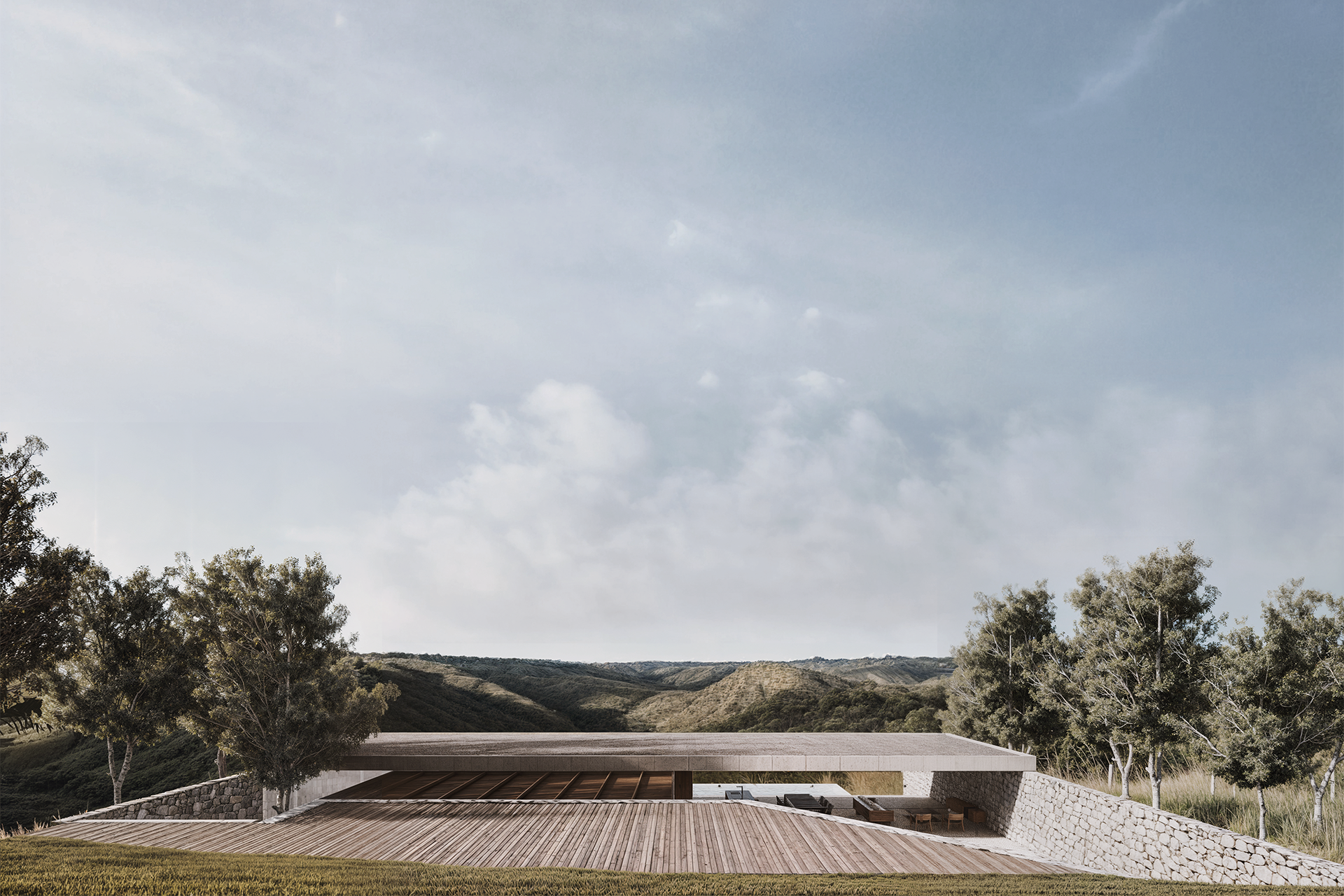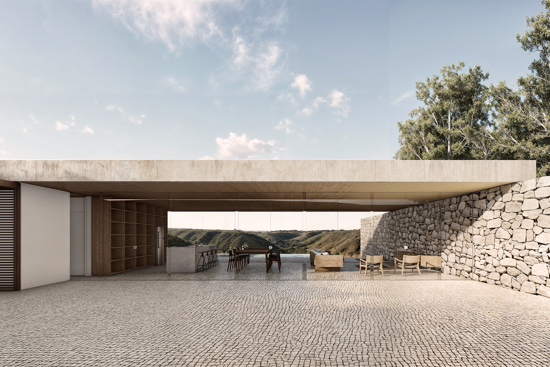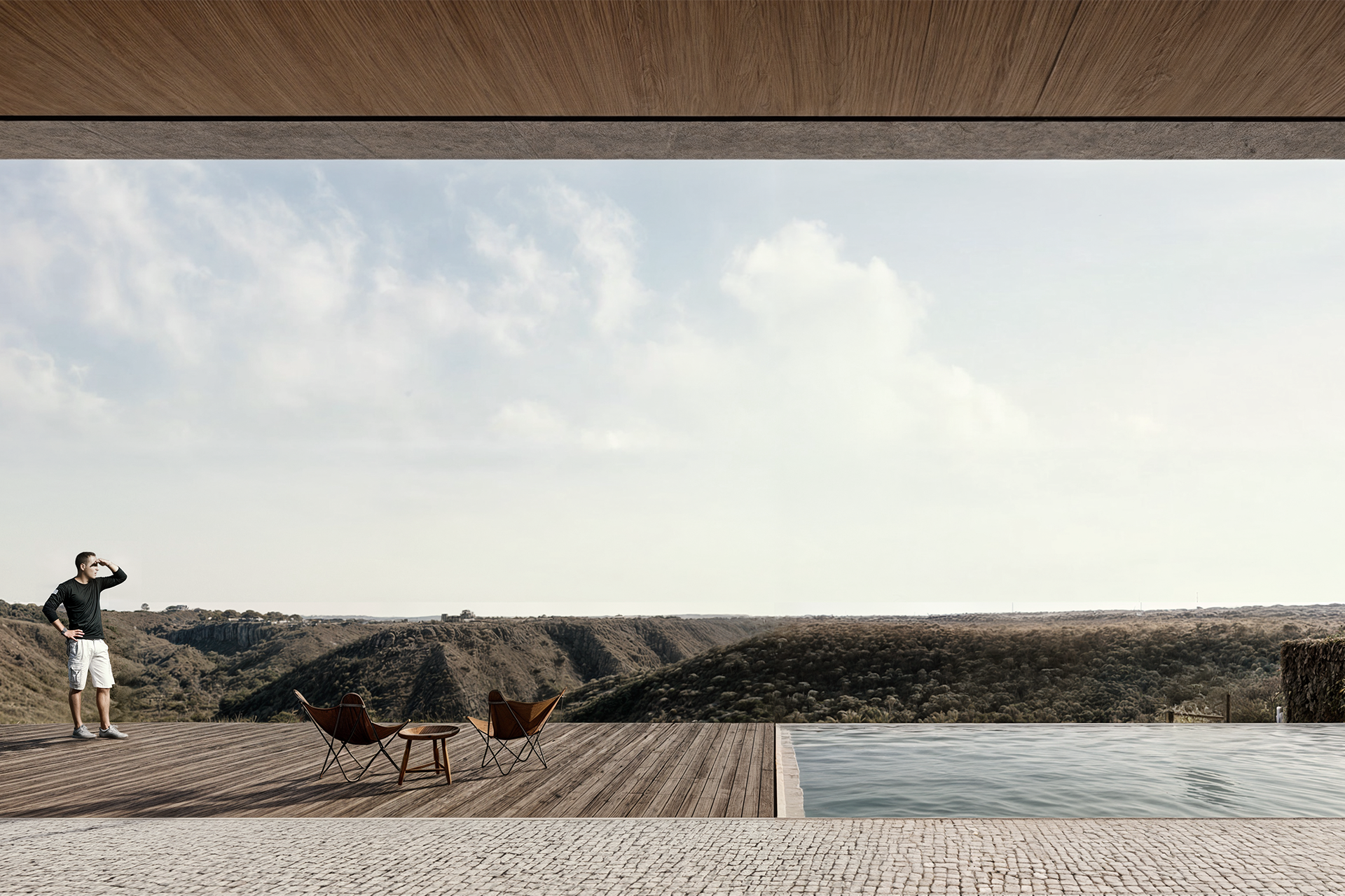A chegada do lote acontece por uma cota superior, junto a um patamar descoberto posicionado acima da cobertura da casa. Em seguida, desce-se acompanhando a declividade topográfica e chega-se ao nível da casa em si, onde a paisagem é emoldurada através das salas de estar e jantar. O programa é organizado em sequência, do ambiente mais público para o mais reservado, tudo ocorrendo embaixo de uma laje plana de concreto armado. Quartos e escritório foram posicionados para aproveitar a vista e a entrada de luz natural, conectados a garagem coberta e área de serviço pelo corredor central da casa. Uma ampla varanda percorre todos os ambientes e, a partir de um certo ponto, se afasta das paredes e abriga o deck de madeira e a piscina, já no limite da edificação.