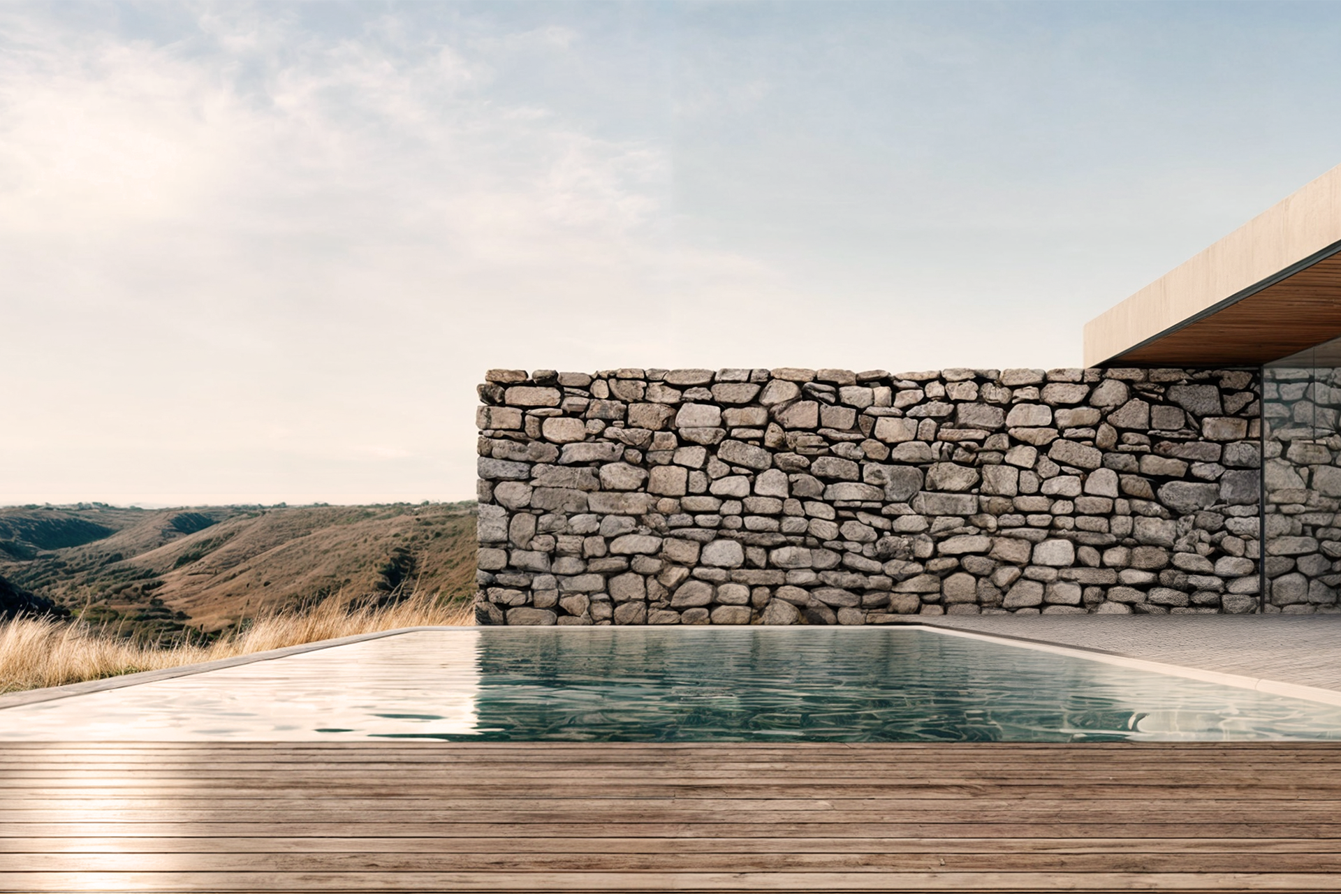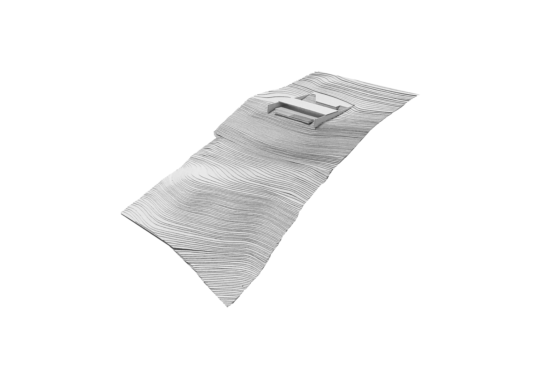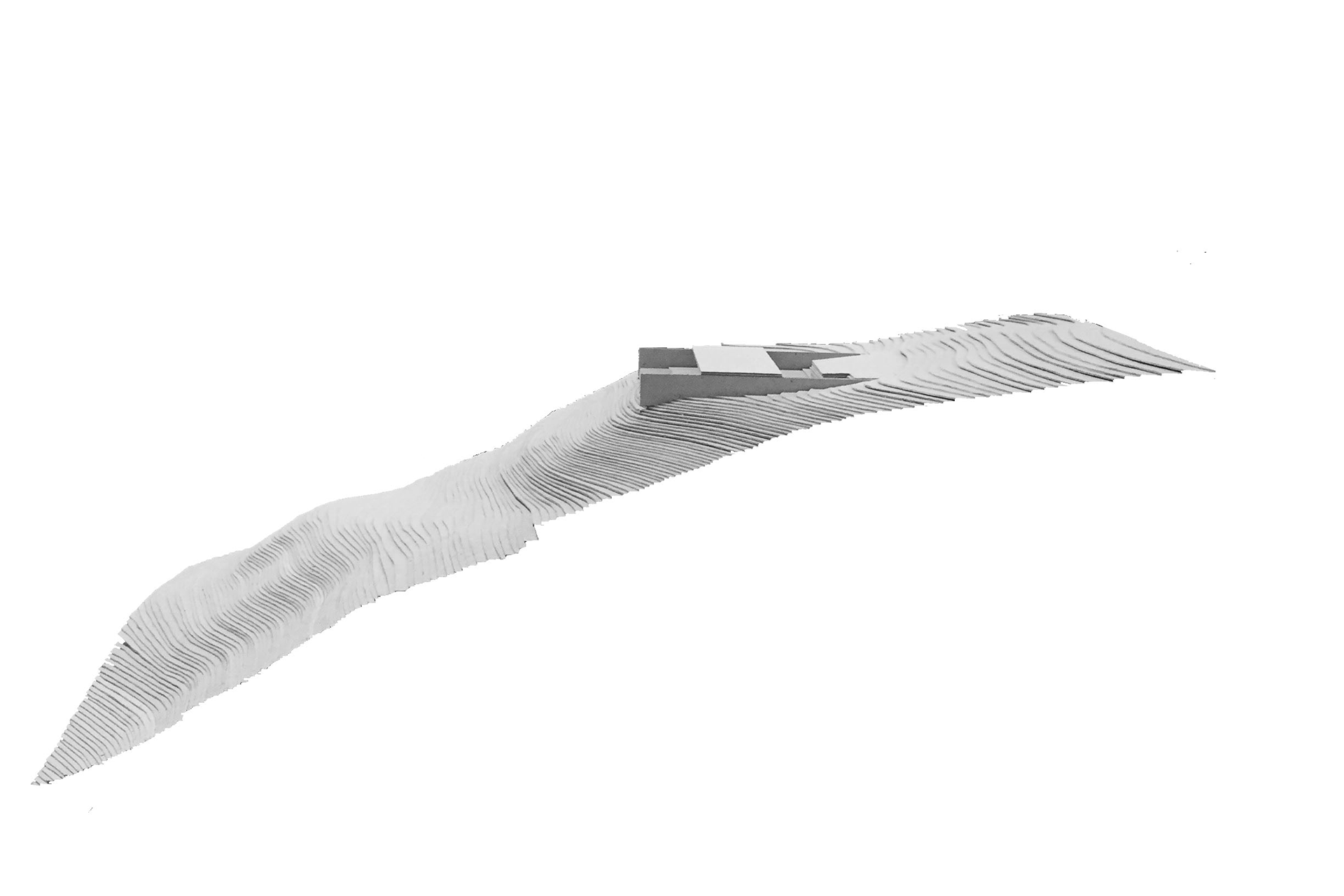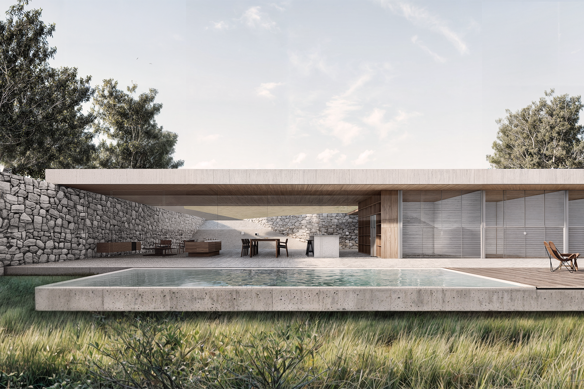 A chegada do lote acontece por uma cota superior, junto a um patamar descoberto posicionado acima da cobertura da casa. Em seguida, desce-se acompanhando a declividade topográfica e chega-se ao nível da casa em si, onde a paisagem é emoldurada através das salas de estar e jantar. O programa é organizado em sequência, do ambiente mais público para o mais reservado, tudo ocorrendo embaixo de uma laje plana de concreto armado. Quartos e escritório foram posicionados para aproveitar a vista e a entrada de luz natural, conectados a garagem coberta e área de serviço pelo corredor central da casa. Uma ampla varanda percorre todos os ambientes e, a partir de um certo ponto, se afasta das paredes e abriga o deck de madeira e a piscina, já no limite da edificação.