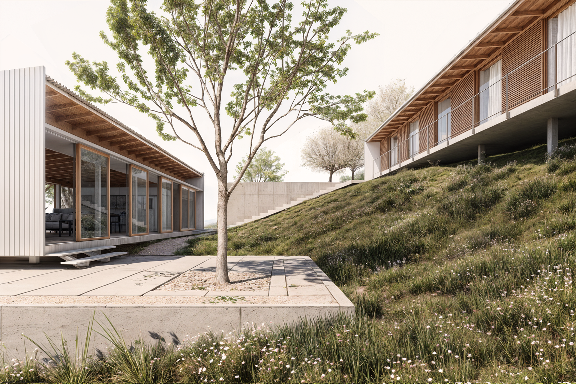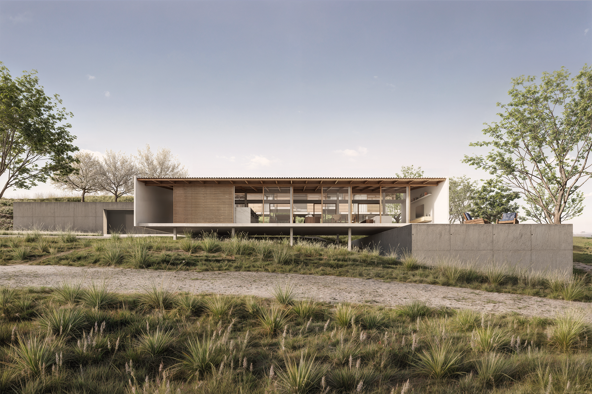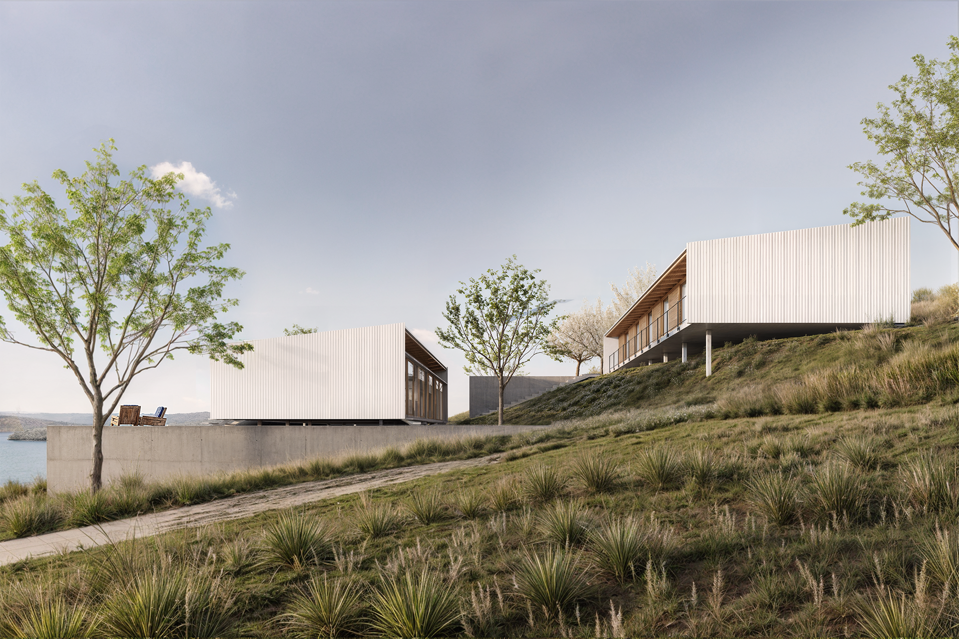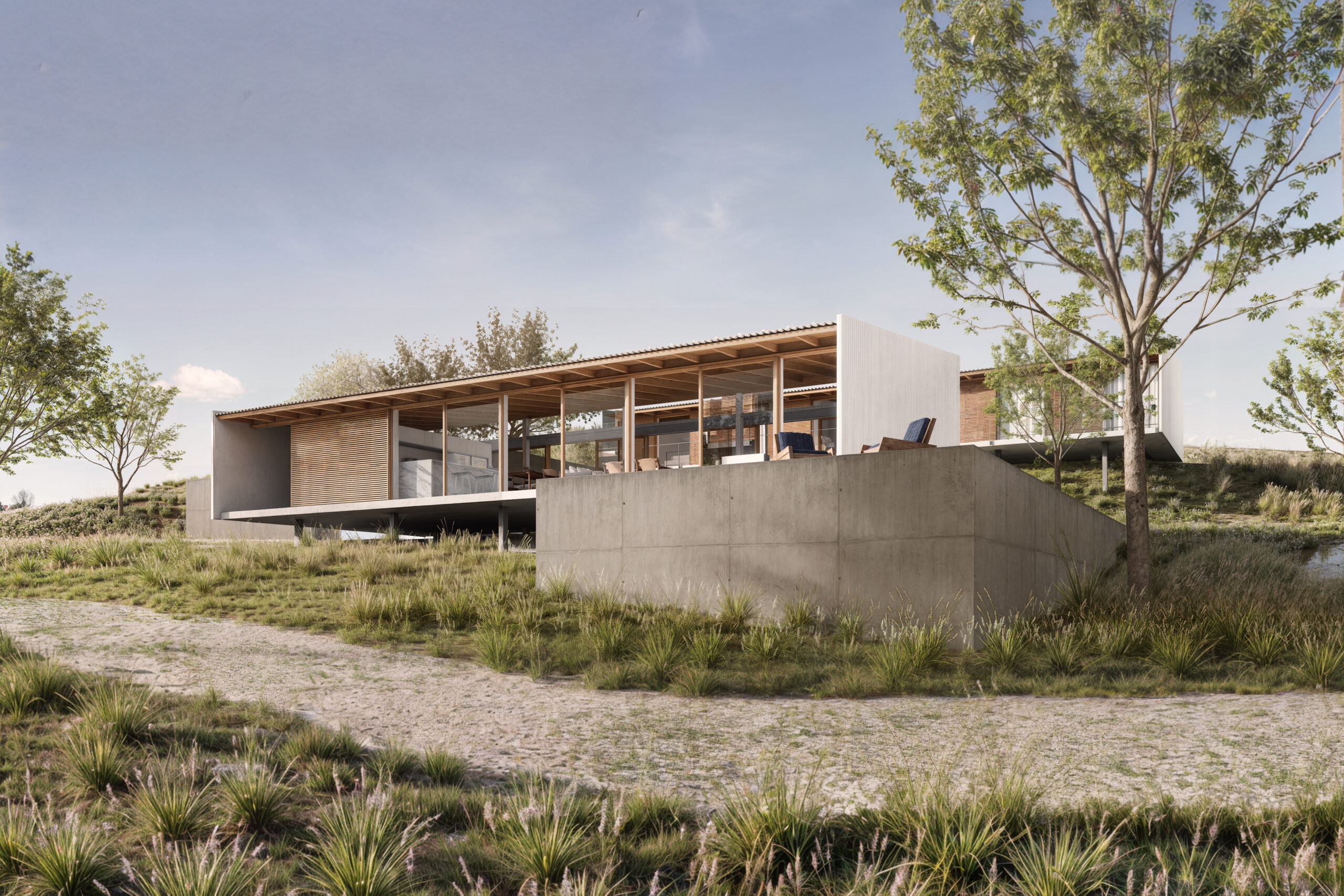Posteriormente, uma segunda edificação com as suítes e sala de TV, de mesma lógica estrutural que a primeira, porém, ligeiramente mais comprida, está elevada três metros acima para possibilitar a vista do lago em todos os cômodos. Um volume de concreto posicionado mais ao norte, articula as edificações através de duas escadas – uma interna e outra externa. Em seu nível superior, o volume comporta outro deck descoberto e a piscina; no inferior, abriga a garagem e a oficina da família.