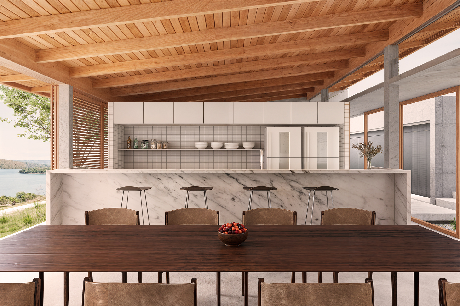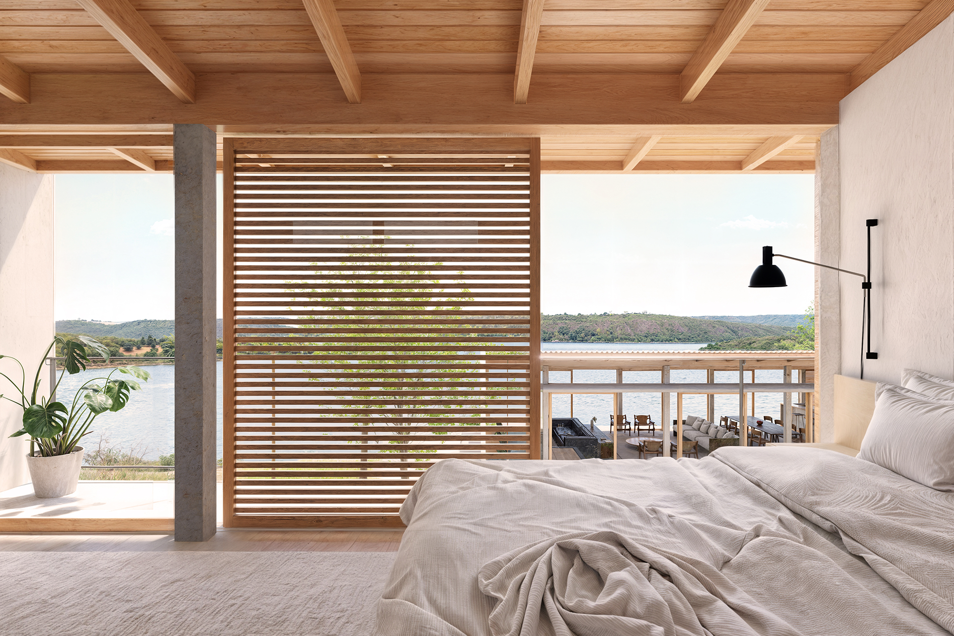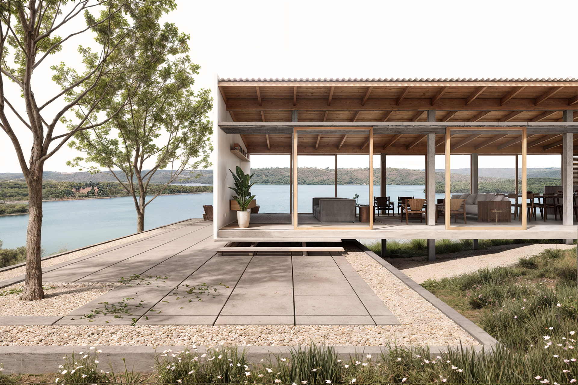 Na beira do Lago Corumbá III, esta residência foi implantada considerando a relação topográfica e a trajetória solar, garantindo conforto térmico e valorizando as vistas da paisagem. O projeto realiza a articulação de duas edificações de estrutura mista (concreto e madeira) e dois volumes de concreto, separando os usos da casa de acordo com o nível de privacidade dos ambientes.