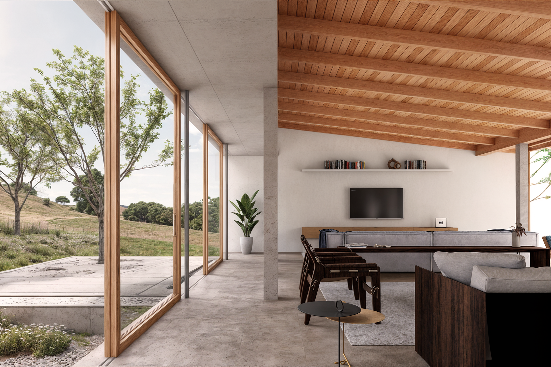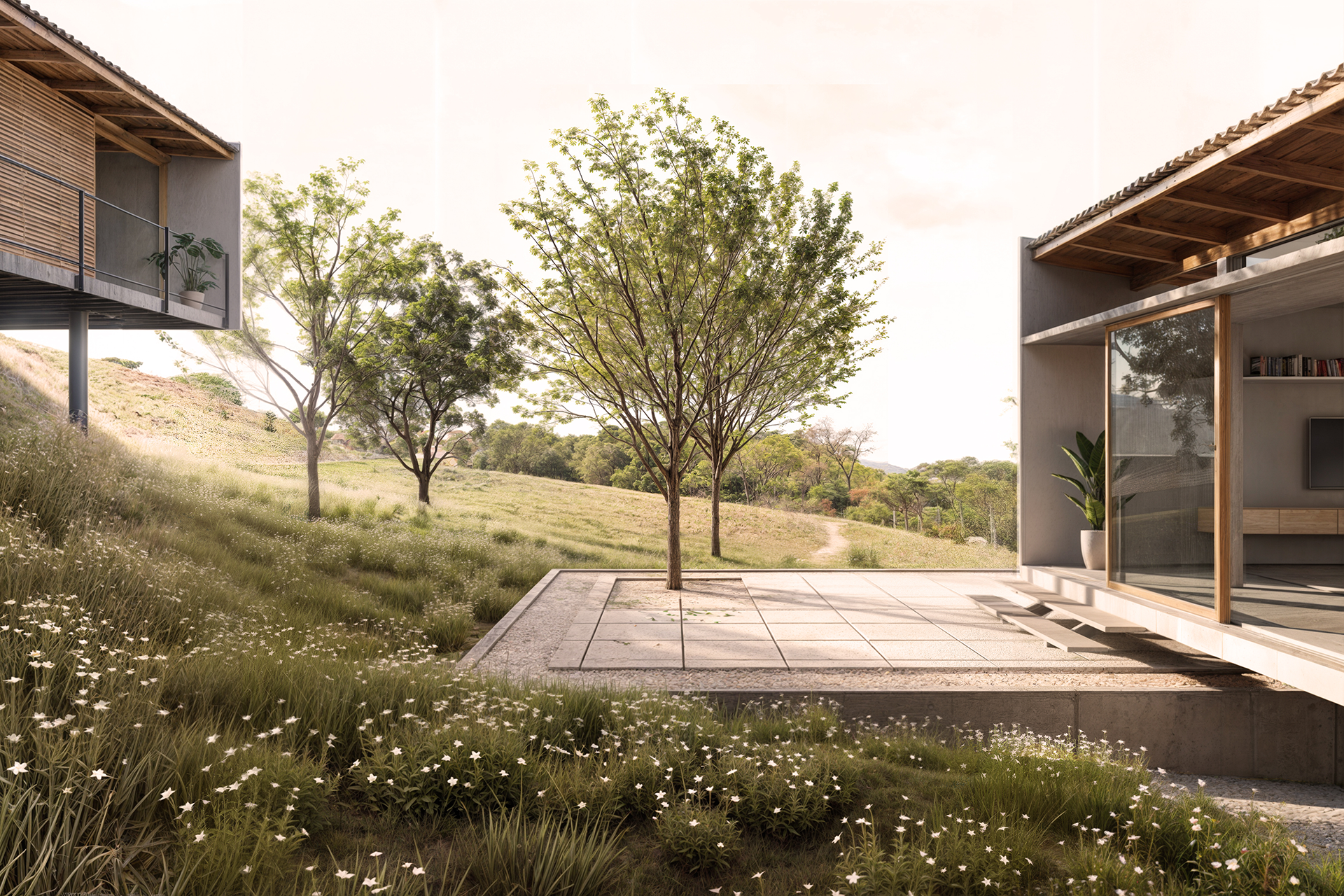 Em um primeiro momento, a edificação que abriga a sala de estar, jantar e cozinha se assenta sobre um dos volumes de concreto, que, por sua vez, configura um deck descoberto e expande a área social desse patamar. O nível da casa é estabelecido pela laje de concreto e pilares que tocam delicadamente o solo original. Estes pilares se prolongam do piso até o encontro com as vigas de madeira cumaru, sustentando a cobertura de uma água em telha termoacústica.