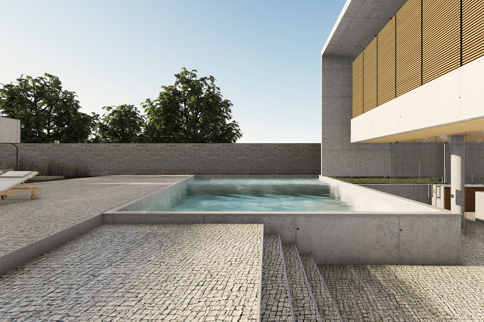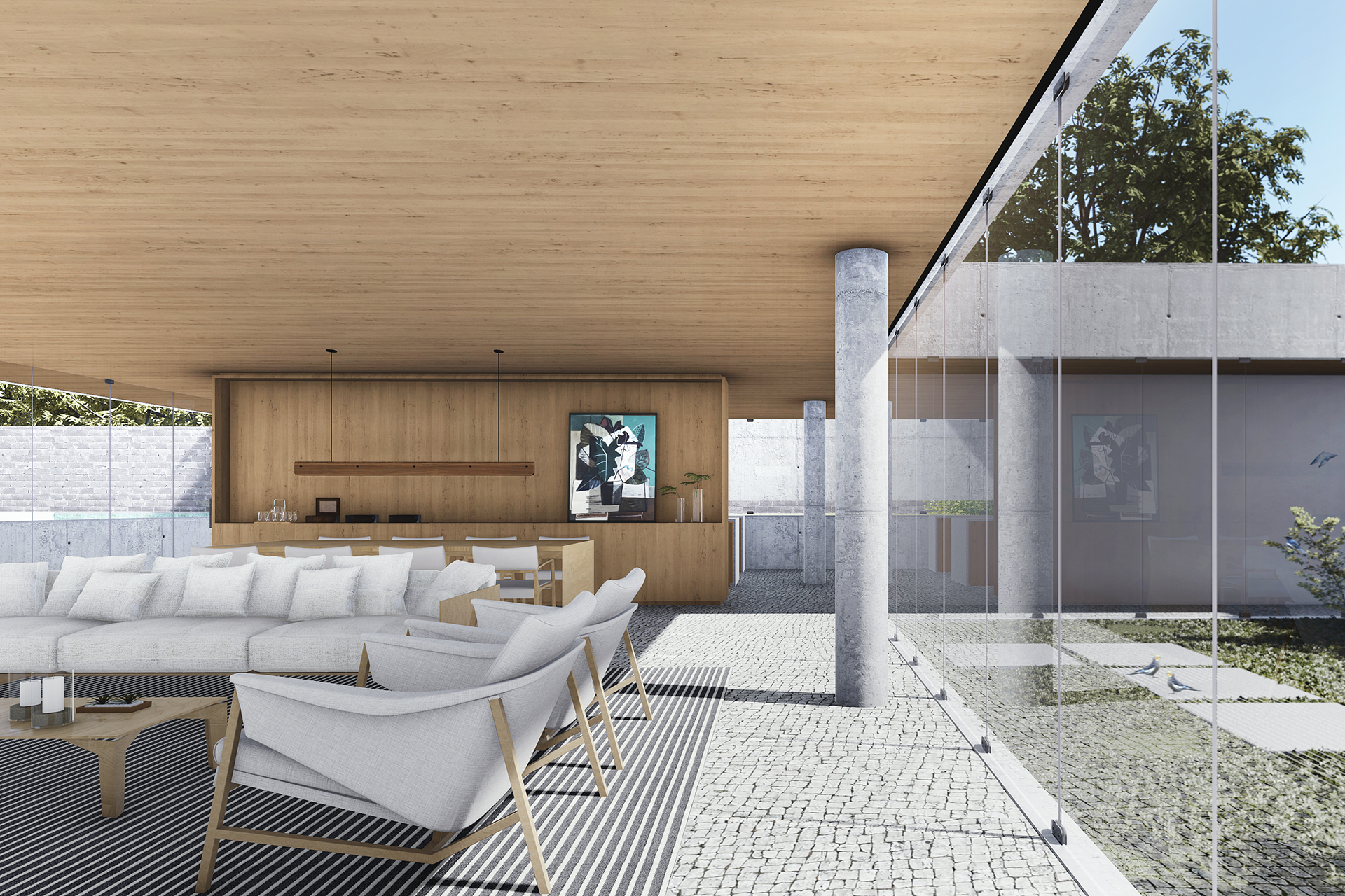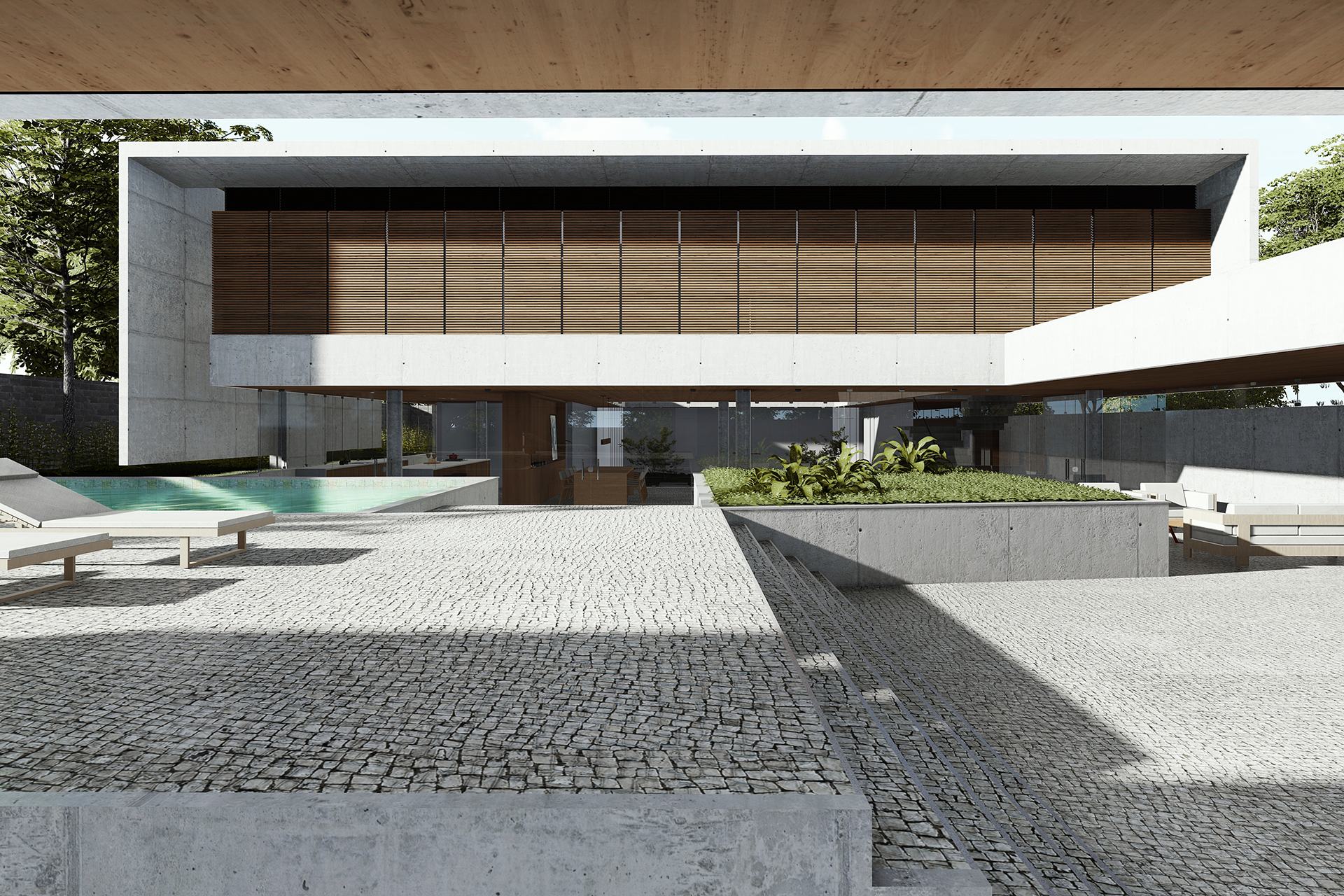 No pavimento térreo, a organização dos espaços articula um equilíbrio entre as áreas abertas e fechadas. De um lado, uma garagem expositiva e o espaço de lazer se conectam diretamente com o deck e a piscina, descobertos no recuo da geometria do plano superior. Do outro, os espaços de serviço circundam o jardim interno e liberam a área entre pátios para abrigar as salas de estar, jantar e a cozinha. Os espaços são dispostos através de um jogo topográfico: ora muro de arrimo; ora talude; ora chão projetado; ora chão escavado.