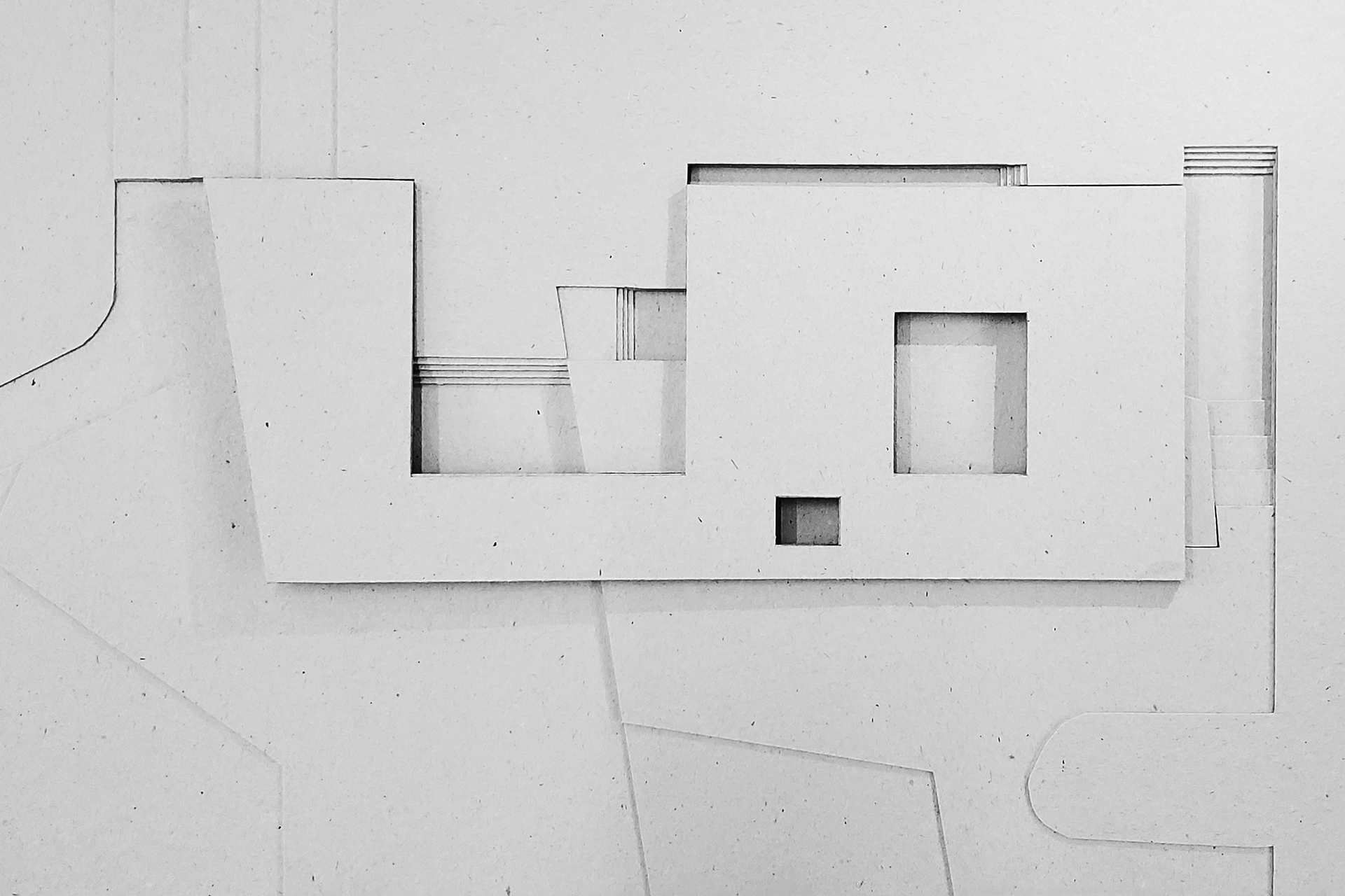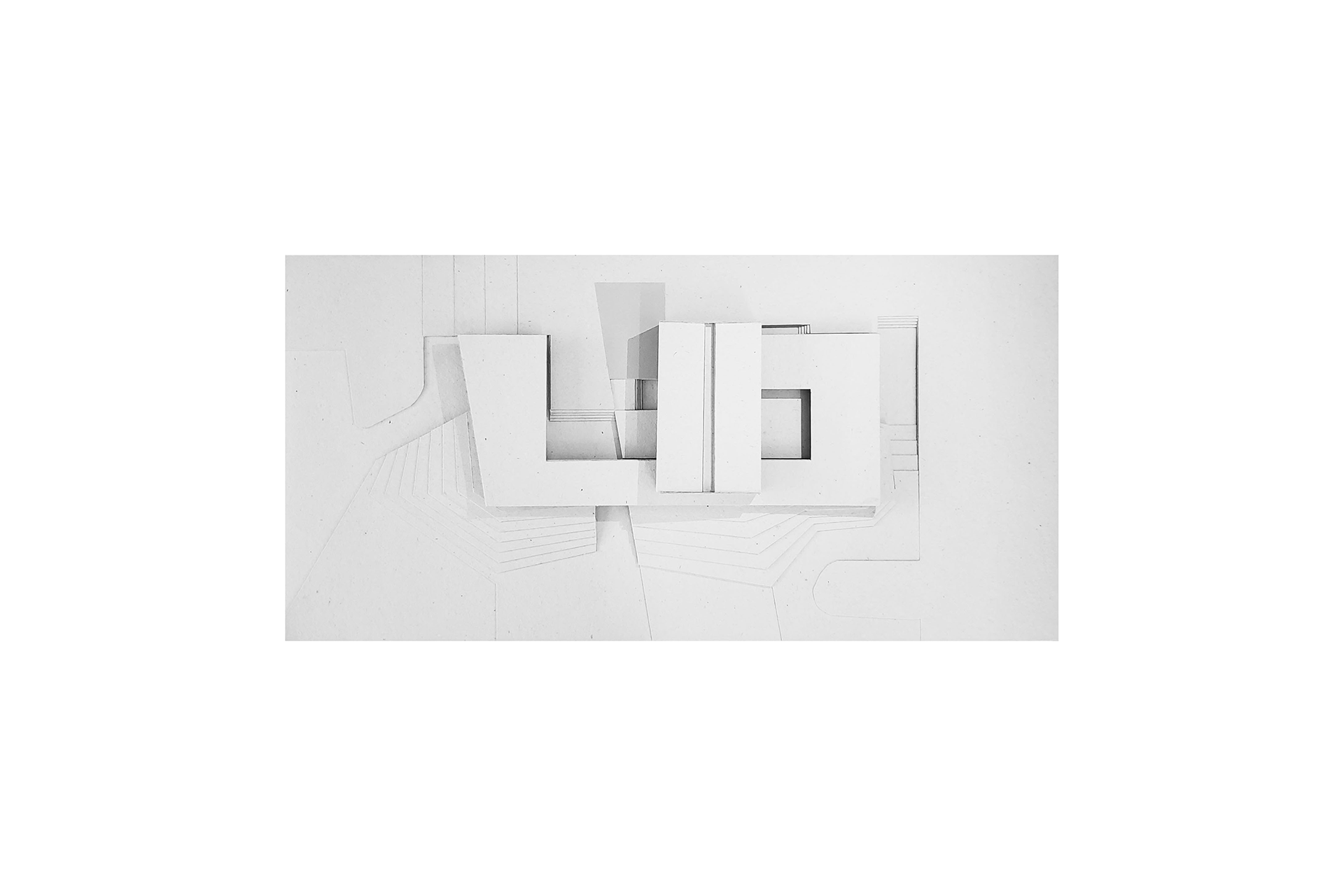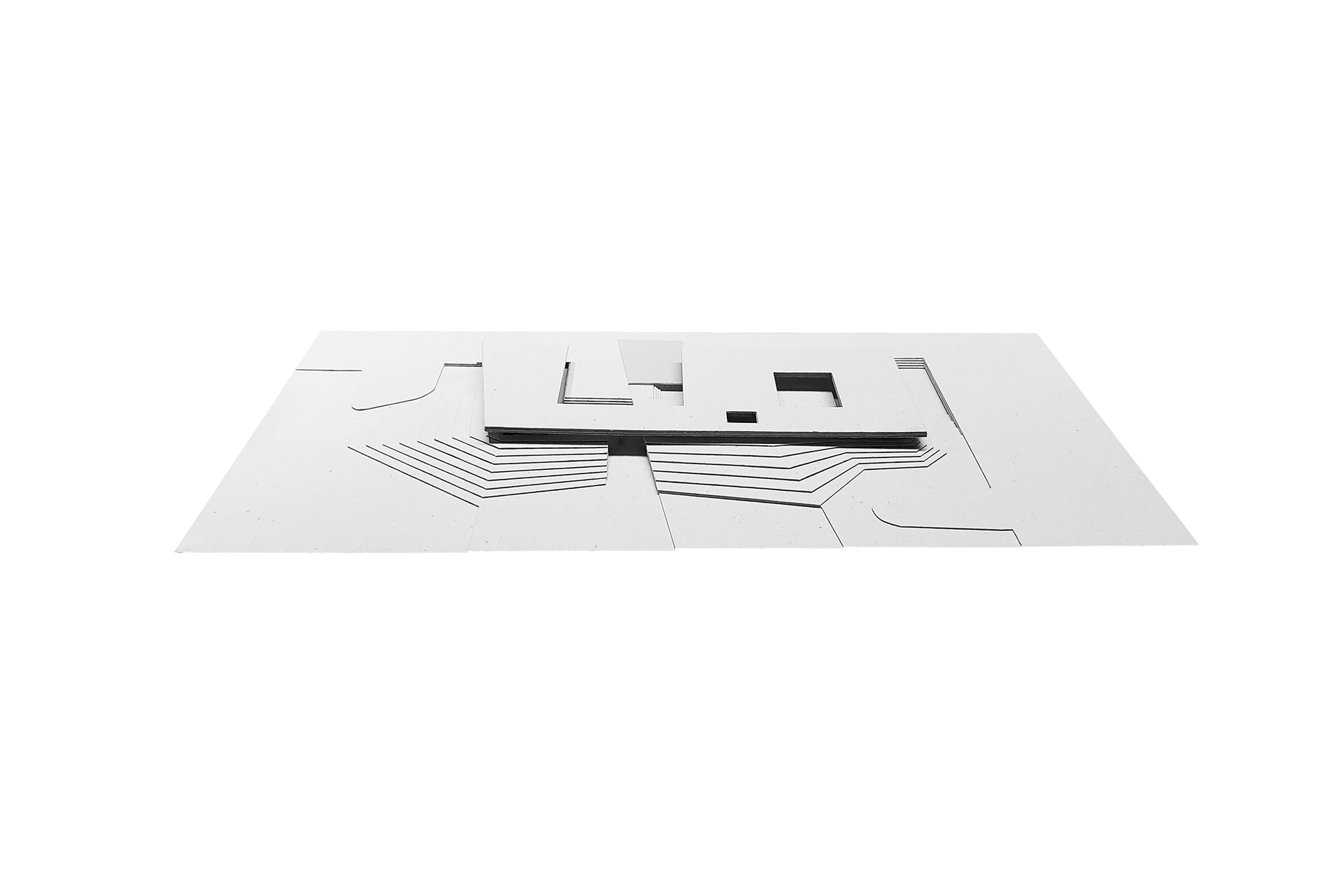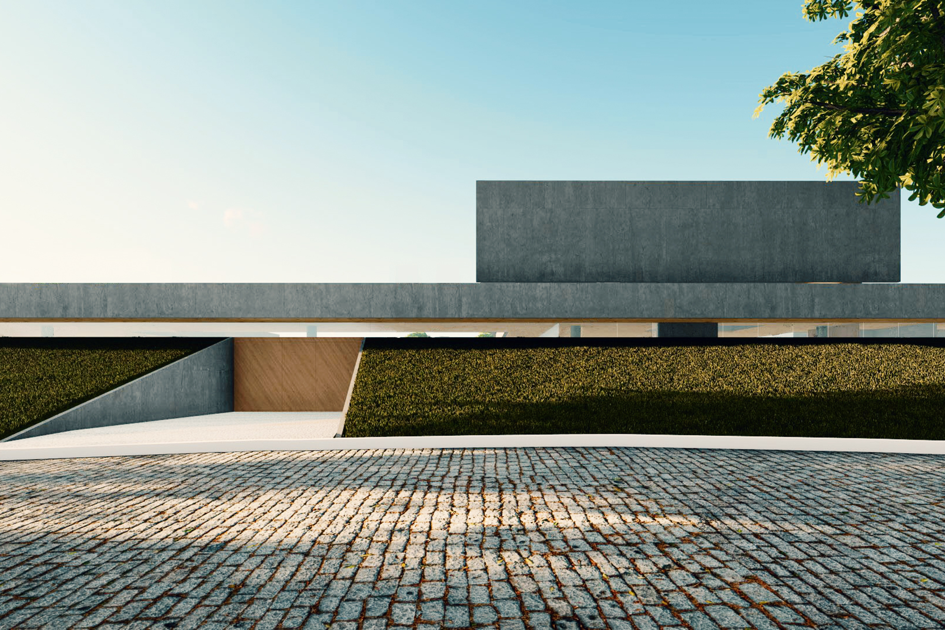 No pavimento térreo, a organização dos espaços articula um equilíbrio entre as áreas abertas e fechadas. De um lado, uma garagem expositiva e o espaço de lazer se conectam diretamente com o deck e a piscina, descobertos no recuo da geometria do plano superior. Do outro, os espaços de serviço circundam o jardim interno e liberam a área entre pátios para abrigar as salas de estar, jantar e a cozinha. Os espaços são dispostos através de um jogo topográfico: ora muro de arrimo; ora talude; ora chão projetado; ora chão escavado.