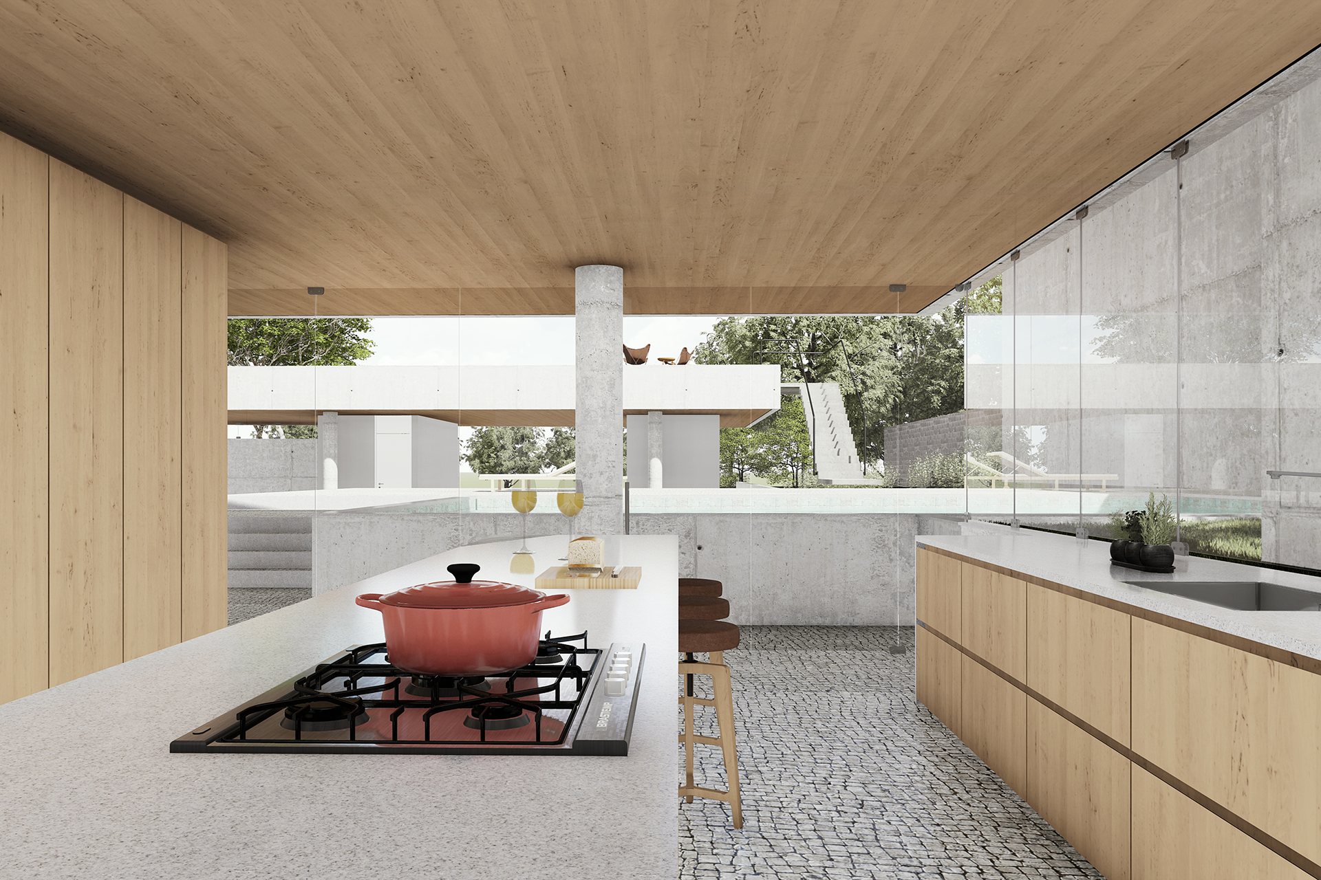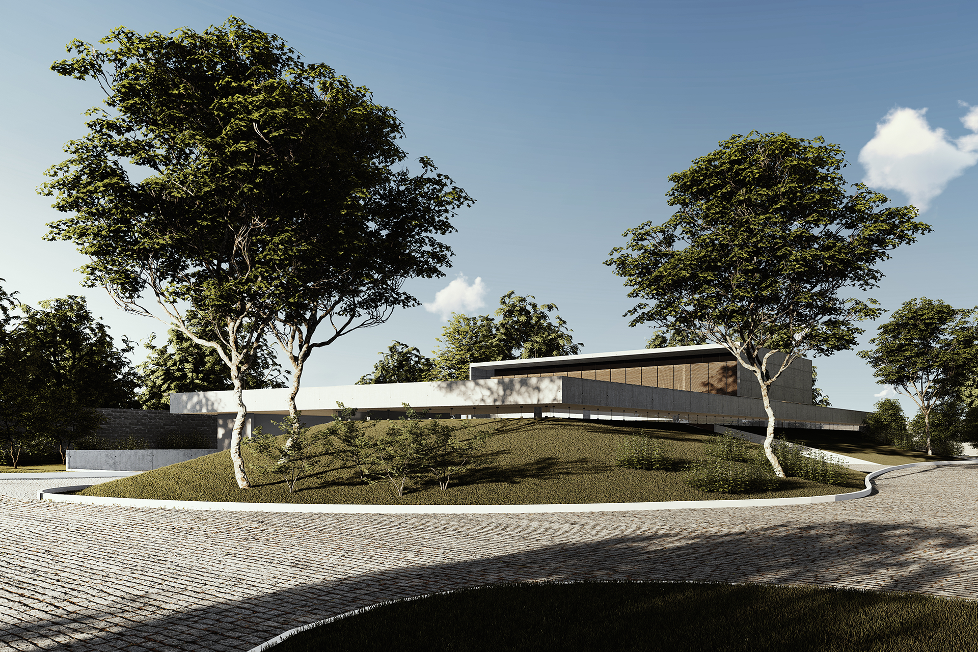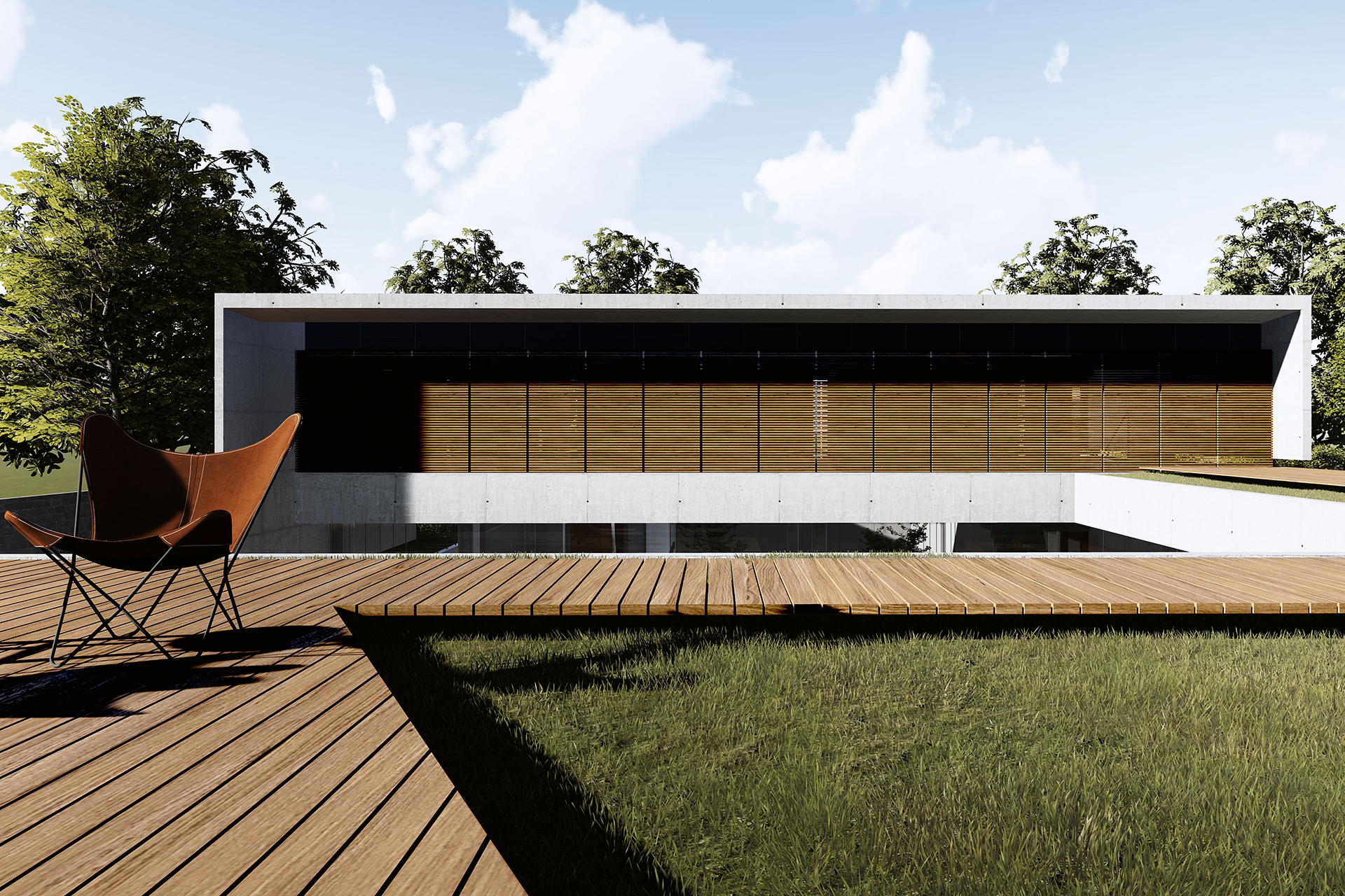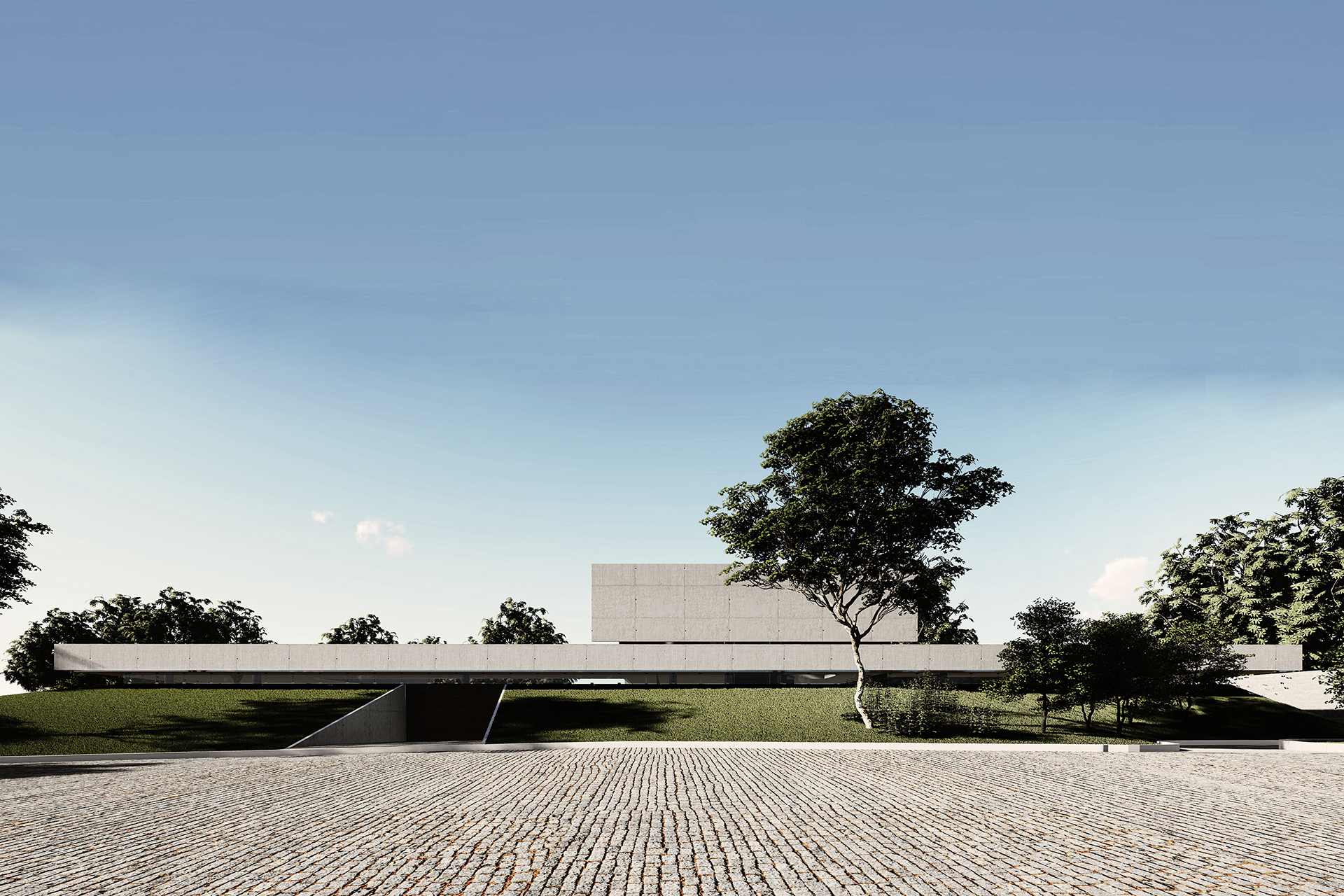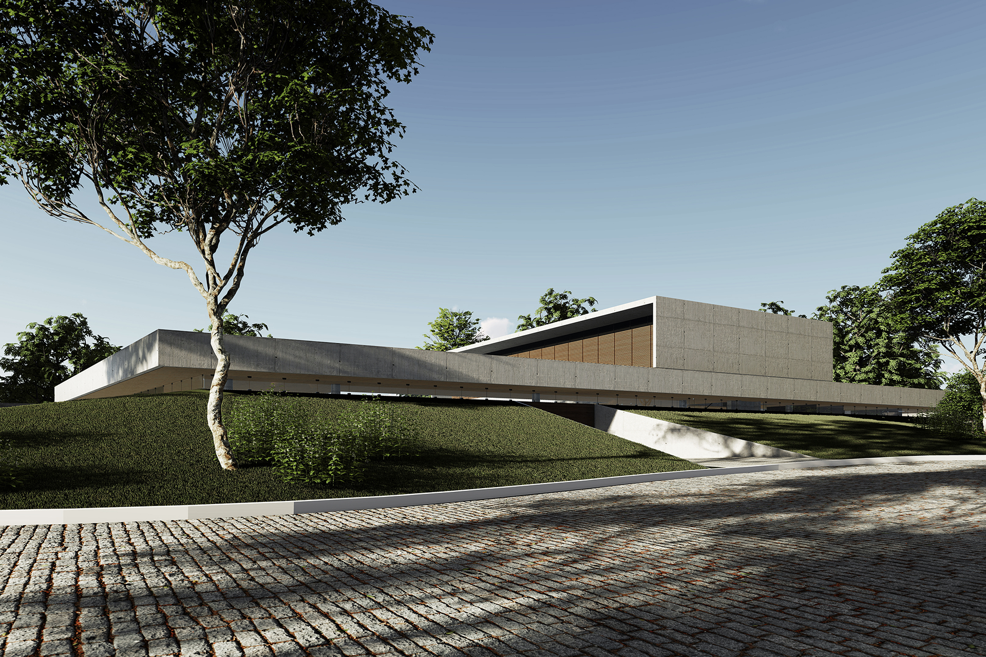 Localizada na esquina de um condomínio no Lago Sul, Brasília, a residência se organiza a partir de um plano de concreto elevado em relação ao terreno, atuando simultaneamente como cobertura do pavimento térreo e como um amplo terraço para o pavimento superior.