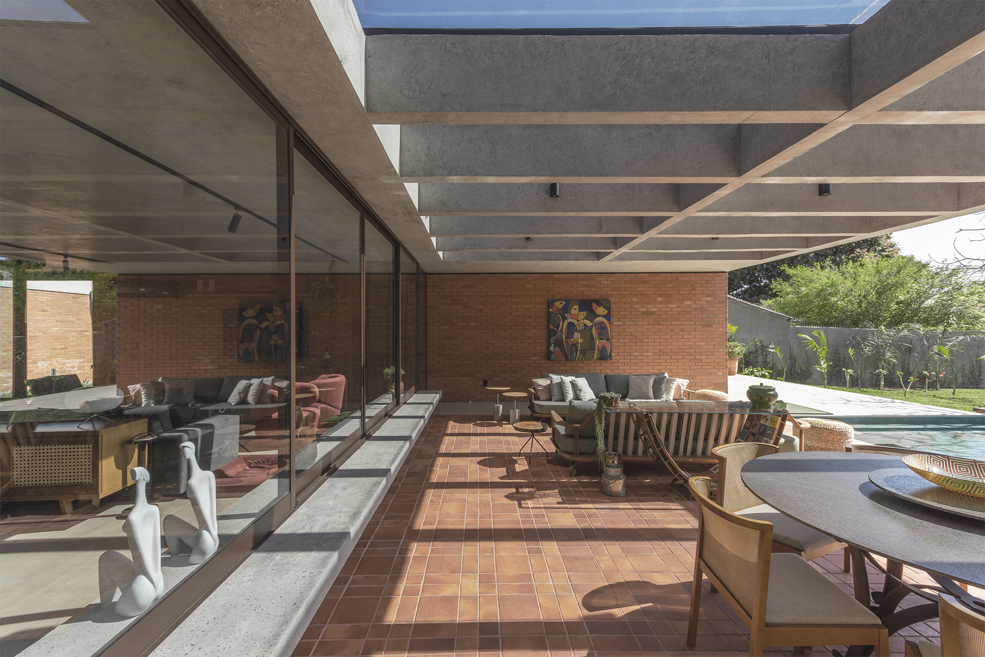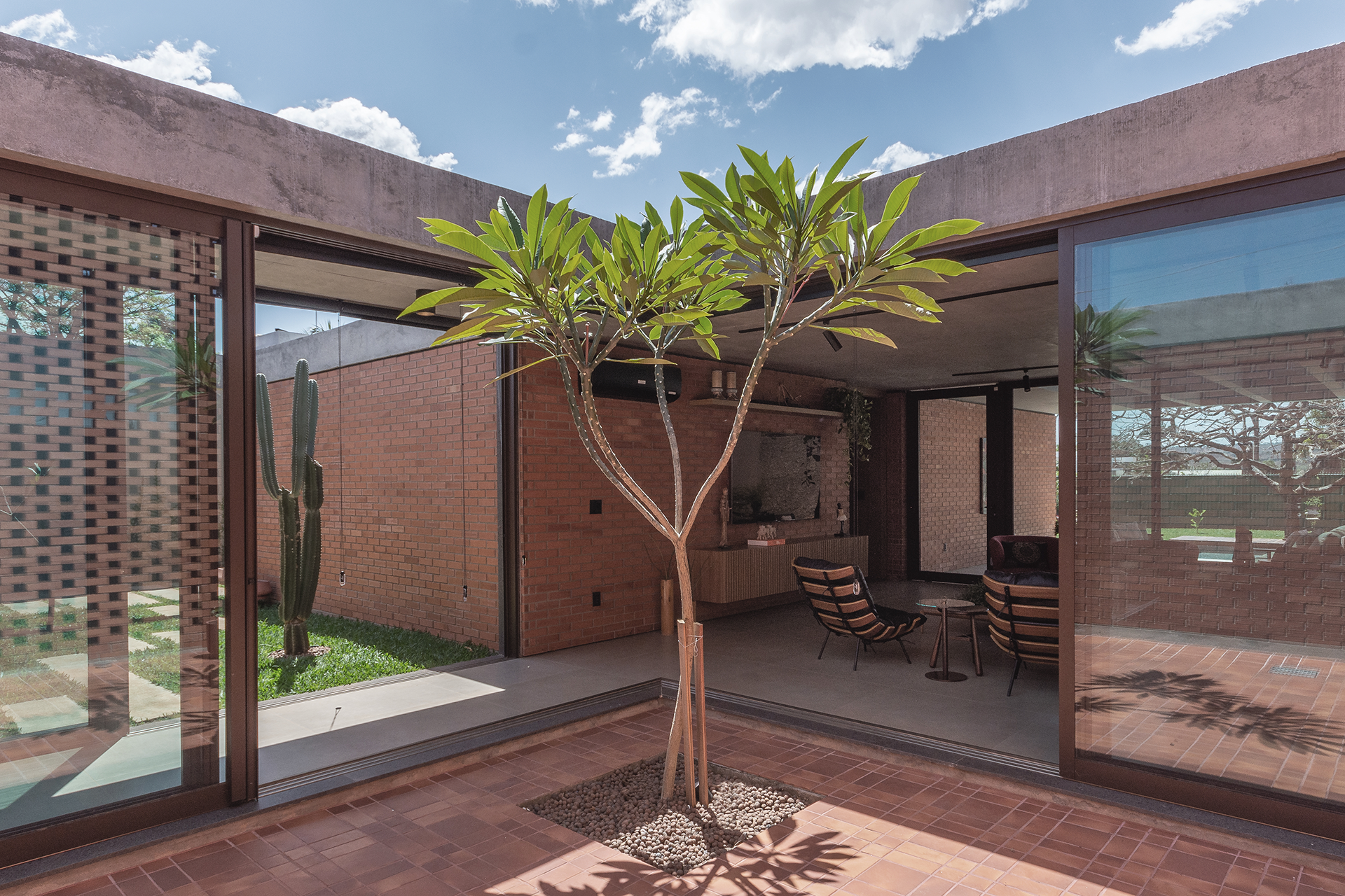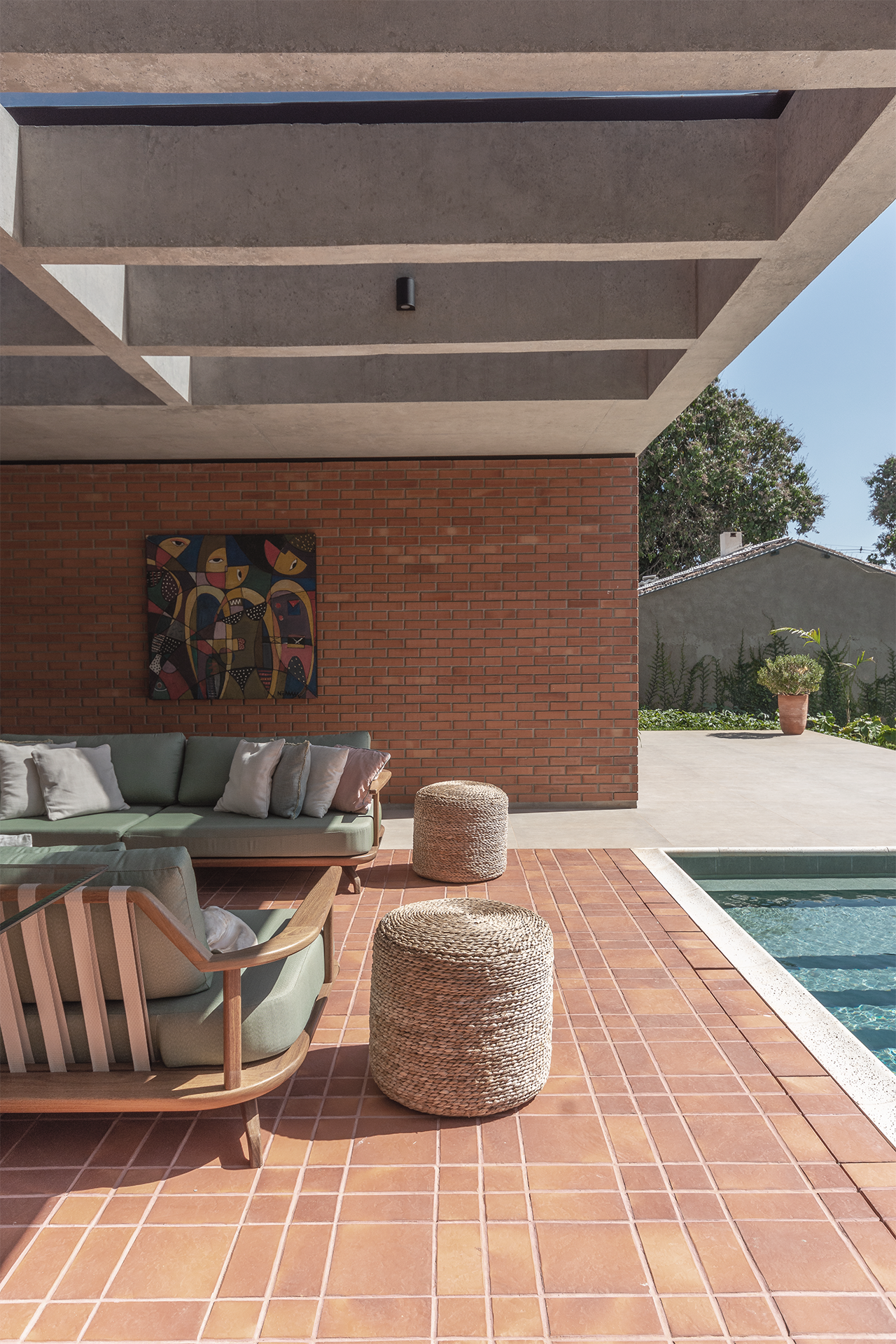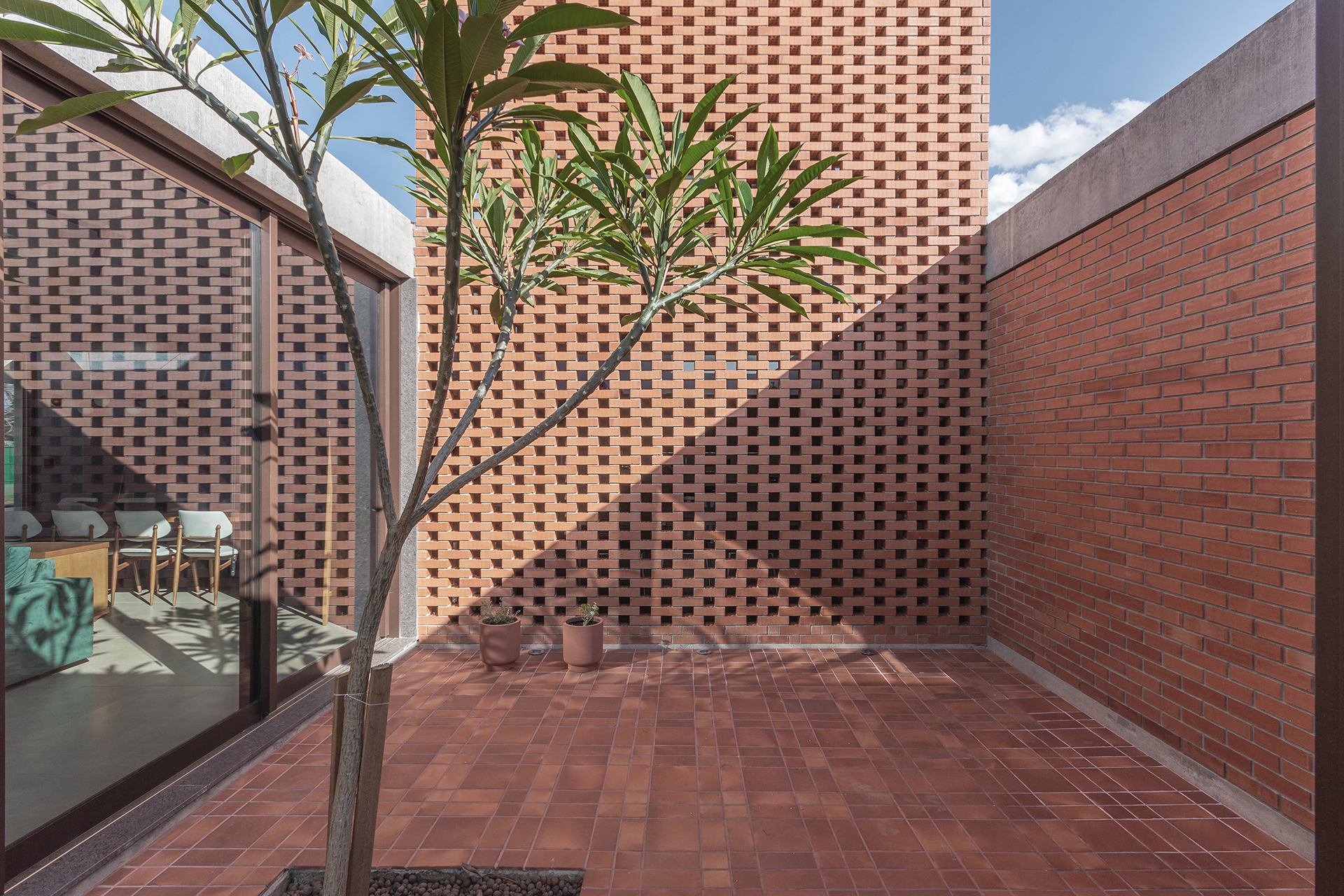 A estrutura em concreto armado, com a laje aparente e as vigas gerando pergolados em dados momentos, dialoga com o revestimento cerâmico, presente tanto nas paredes como nos pisos do pátio e da varanda. Um cobogó verticalizado, com o mesmo revestimento cerâmico, separa o pátio da cozinha no térreo e abriga os espaços das caixas d’água e boiler acima. Em praticamente todo o projeto, caixilhos de alumínio cor bronze mantem o caráter terroso dessa combinação de materiais.