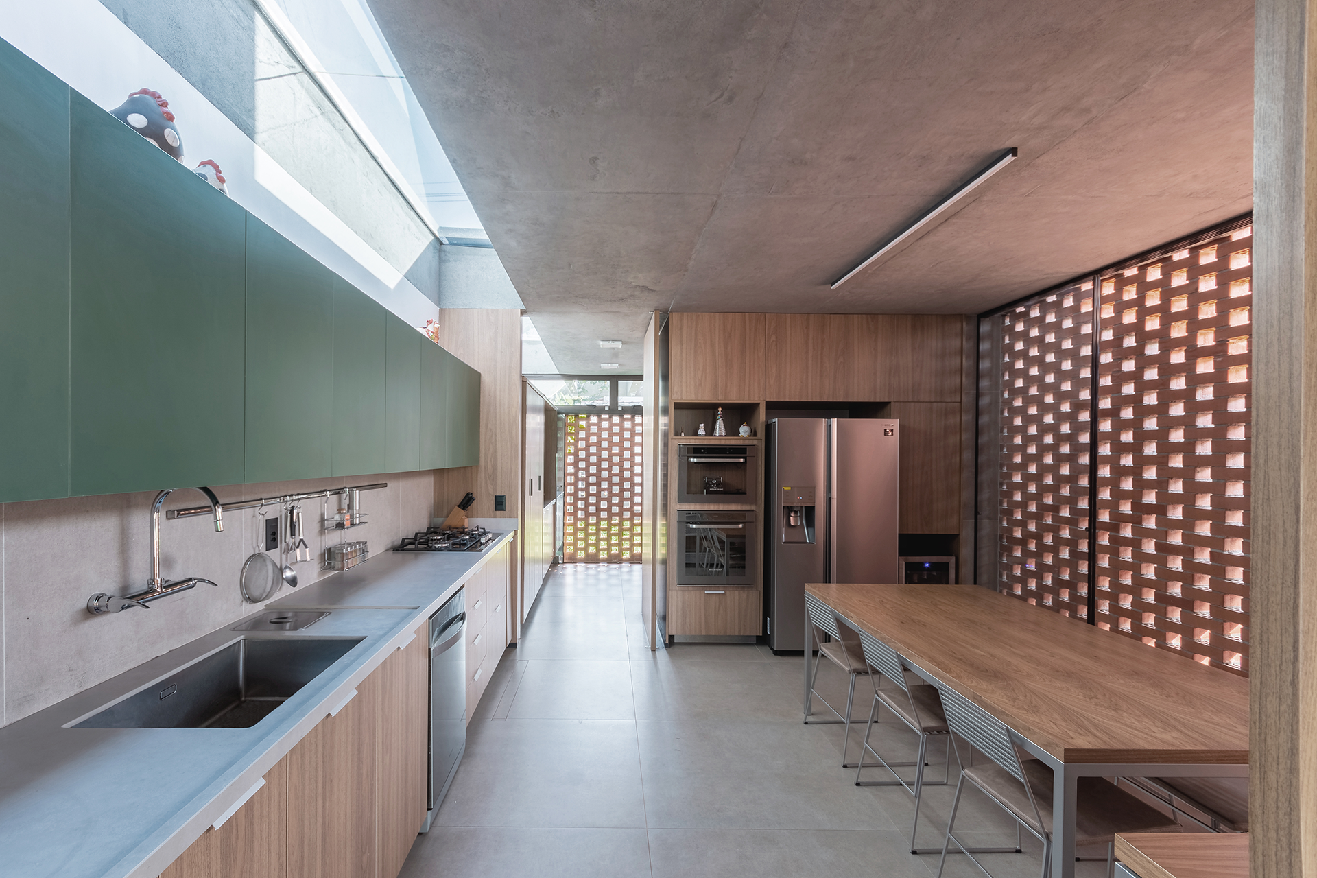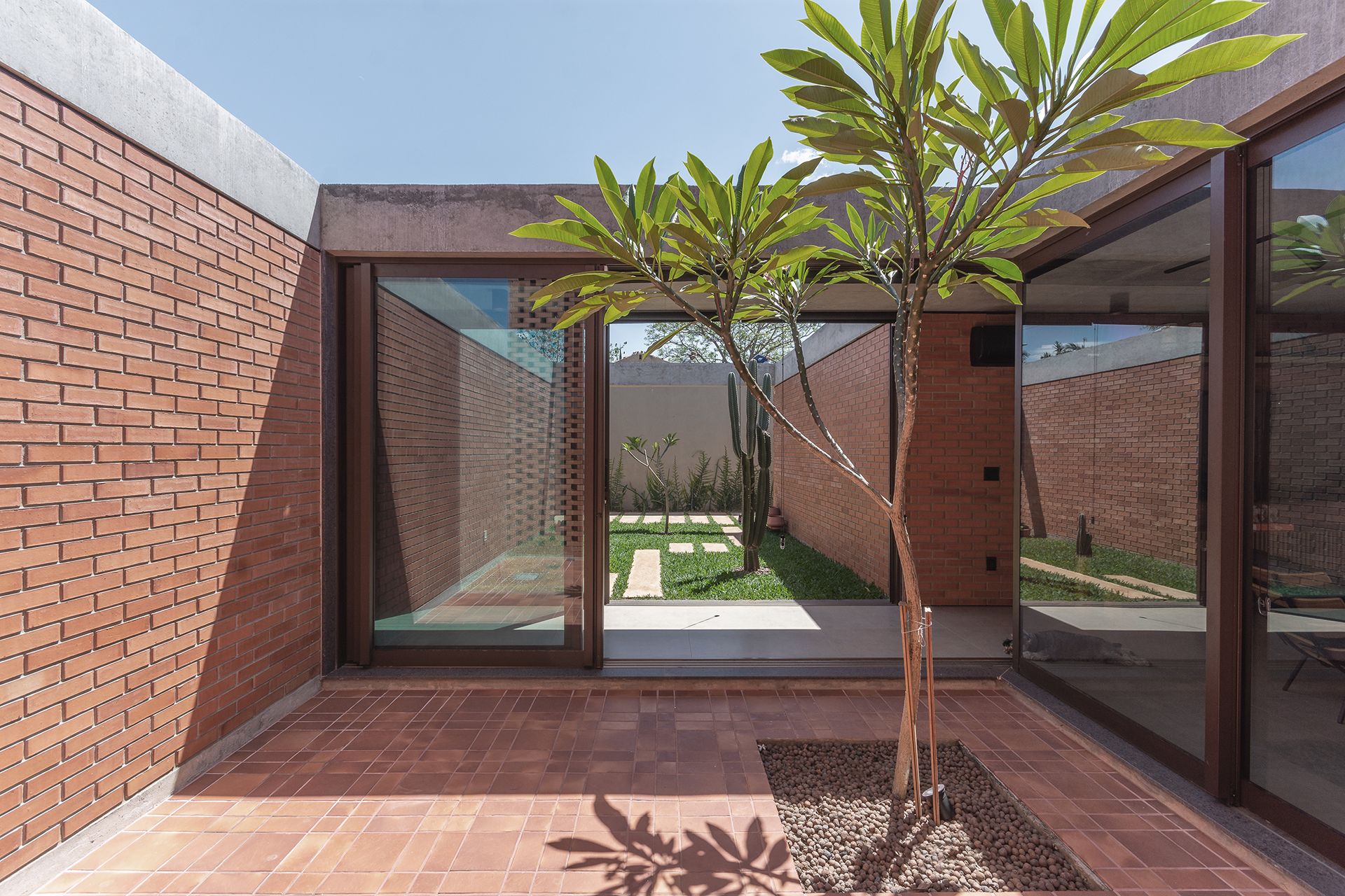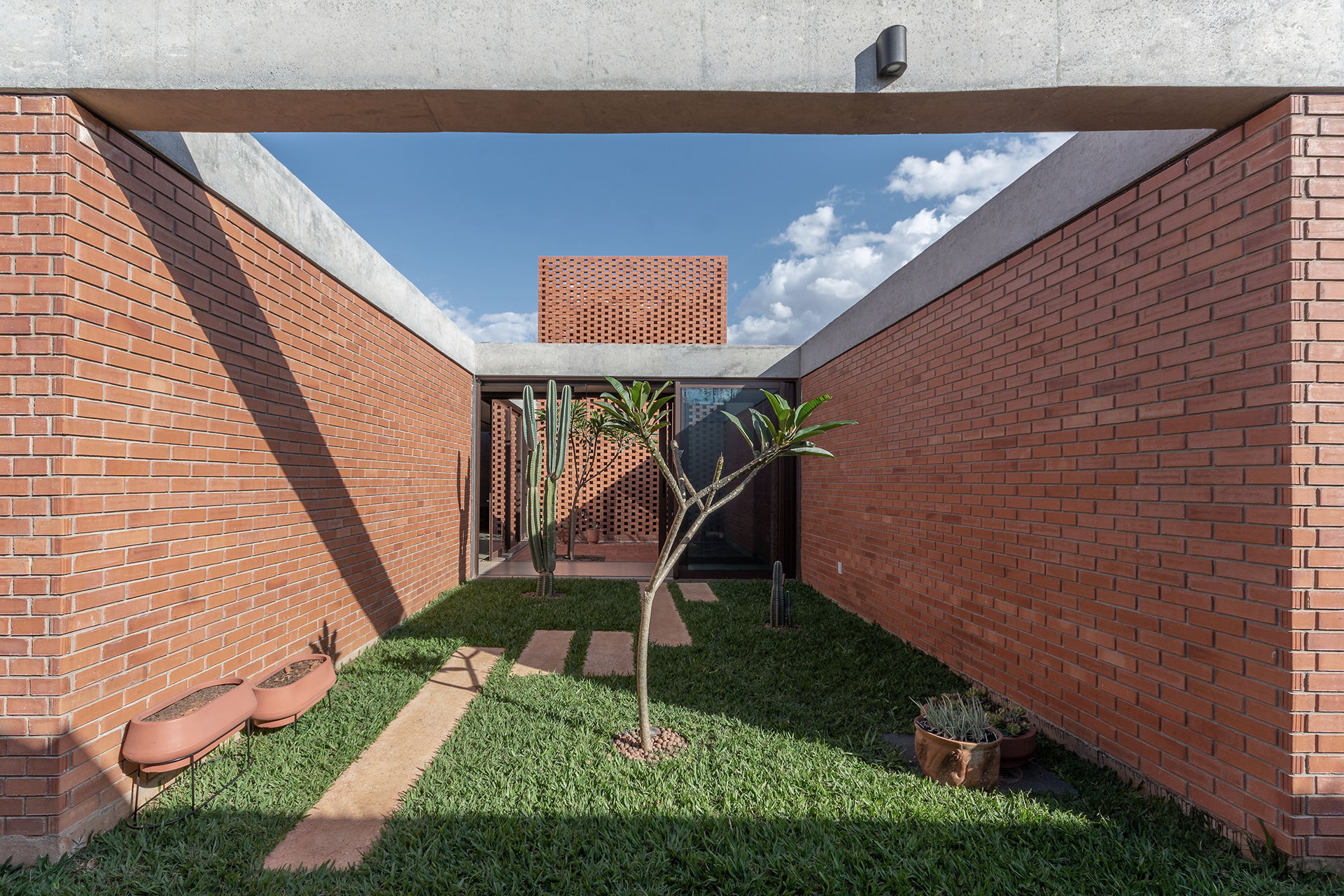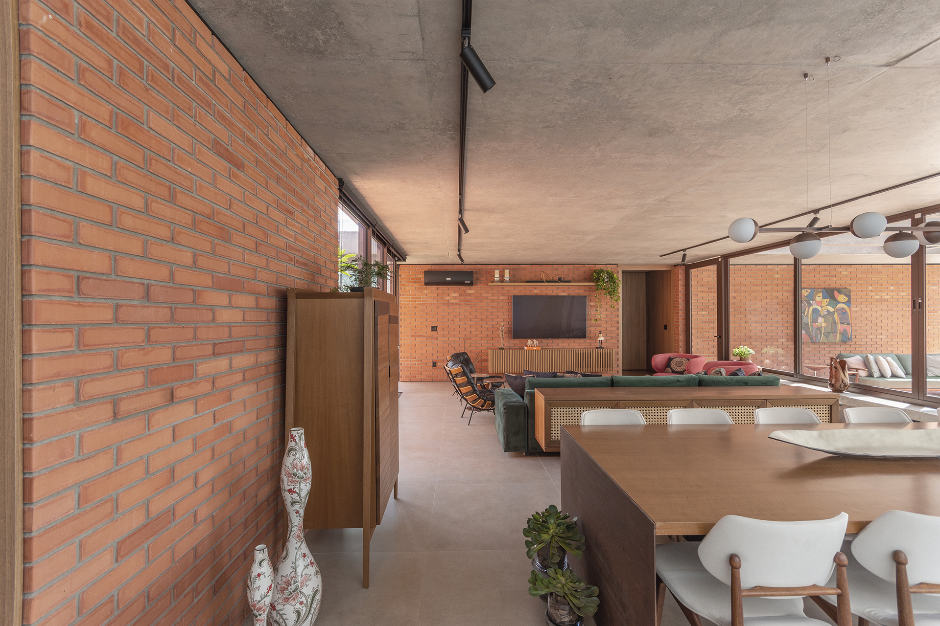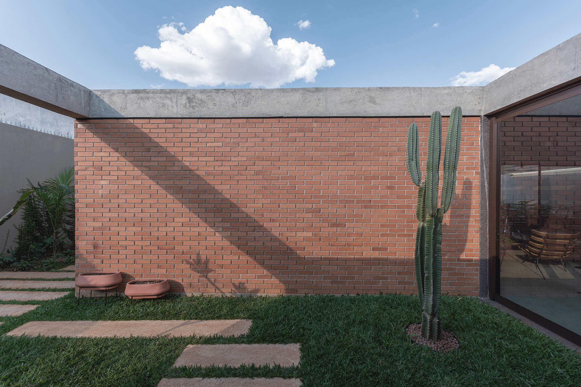 A estrutura em concreto armado, com a laje aparente e as vigas gerando pergolados em dados momentos, dialoga com o revestimento cerâmico, presente tanto nas paredes como nos pisos do pátio e da varanda. Um cobogó verticalizado, com o mesmo revestimento cerâmico, separa o pátio da cozinha no térreo e abriga os espaços das caixas d’água e boiler acima. Em praticamente todo o projeto, caixilhos de alumínio cor bronze mantem o caráter terroso dessa combinação de materiais.