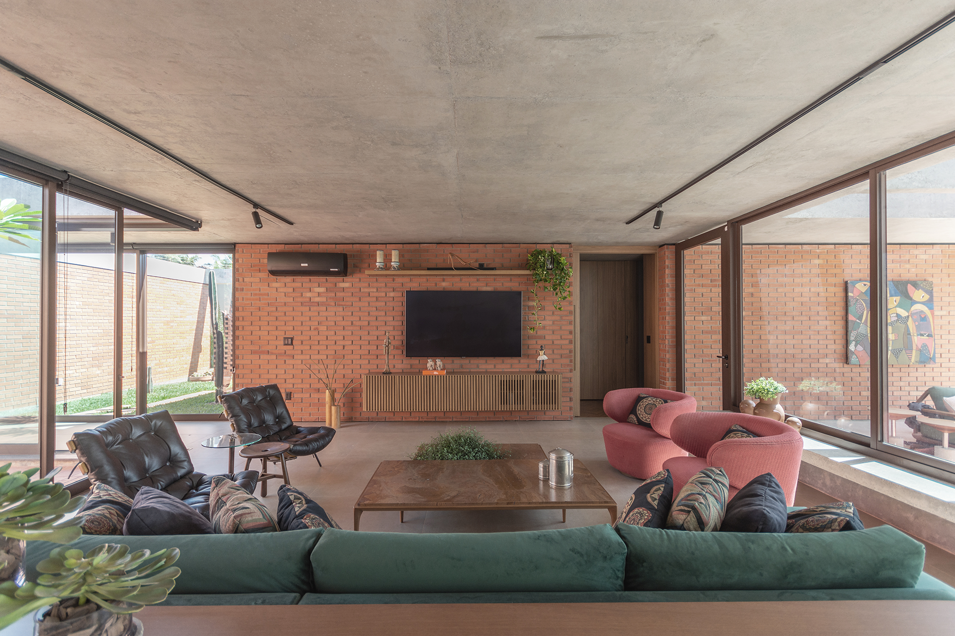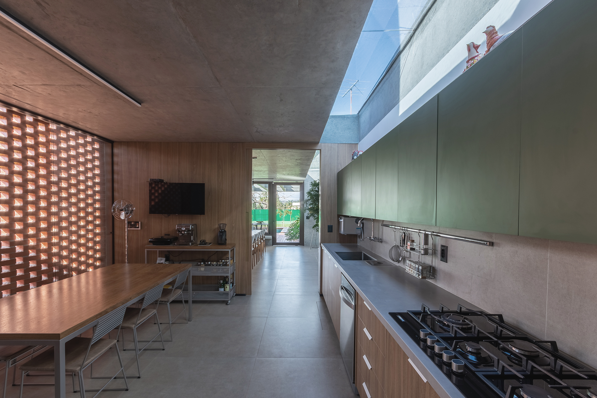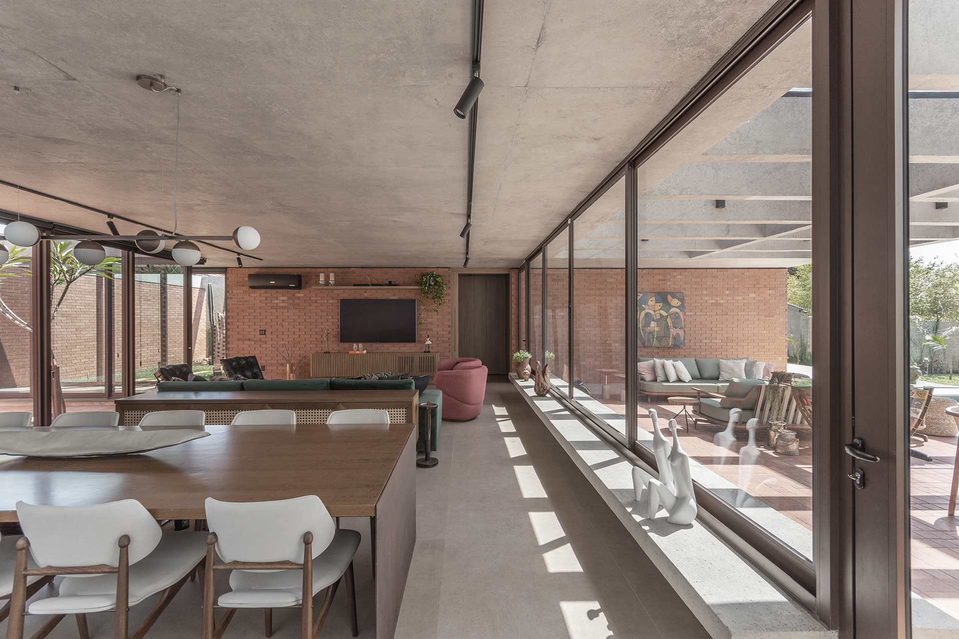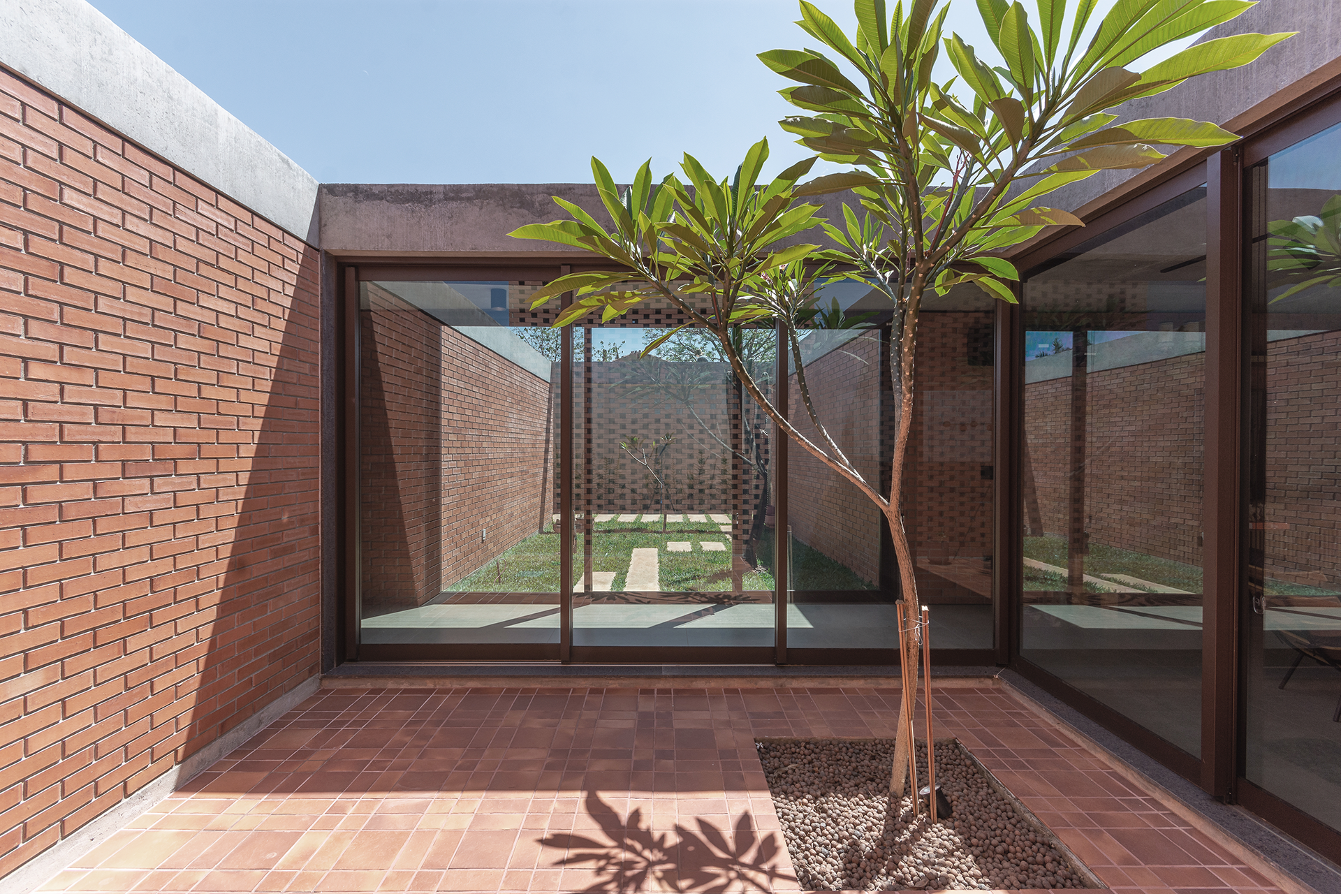 A estrutura em concreto armado, com a laje aparente e as vigas gerando pergolados em dados momentos, dialoga com o revestimento cerâmico, presente tanto nas paredes como nos pisos do pátio e da varanda. Um cobogó verticalizado, com o mesmo revestimento cerâmico, separa o pátio da cozinha no térreo e abriga os espaços das caixas d’água e boiler acima. Em praticamente todo o projeto, caixilhos de alumínio cor bronze mantem o caráter terroso dessa combinação de materiais.