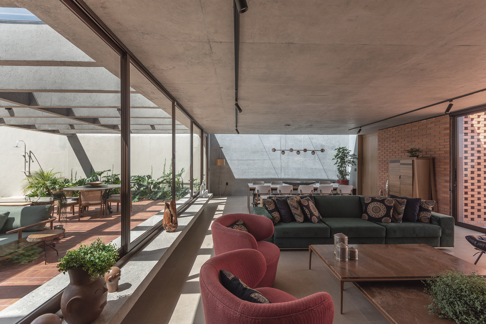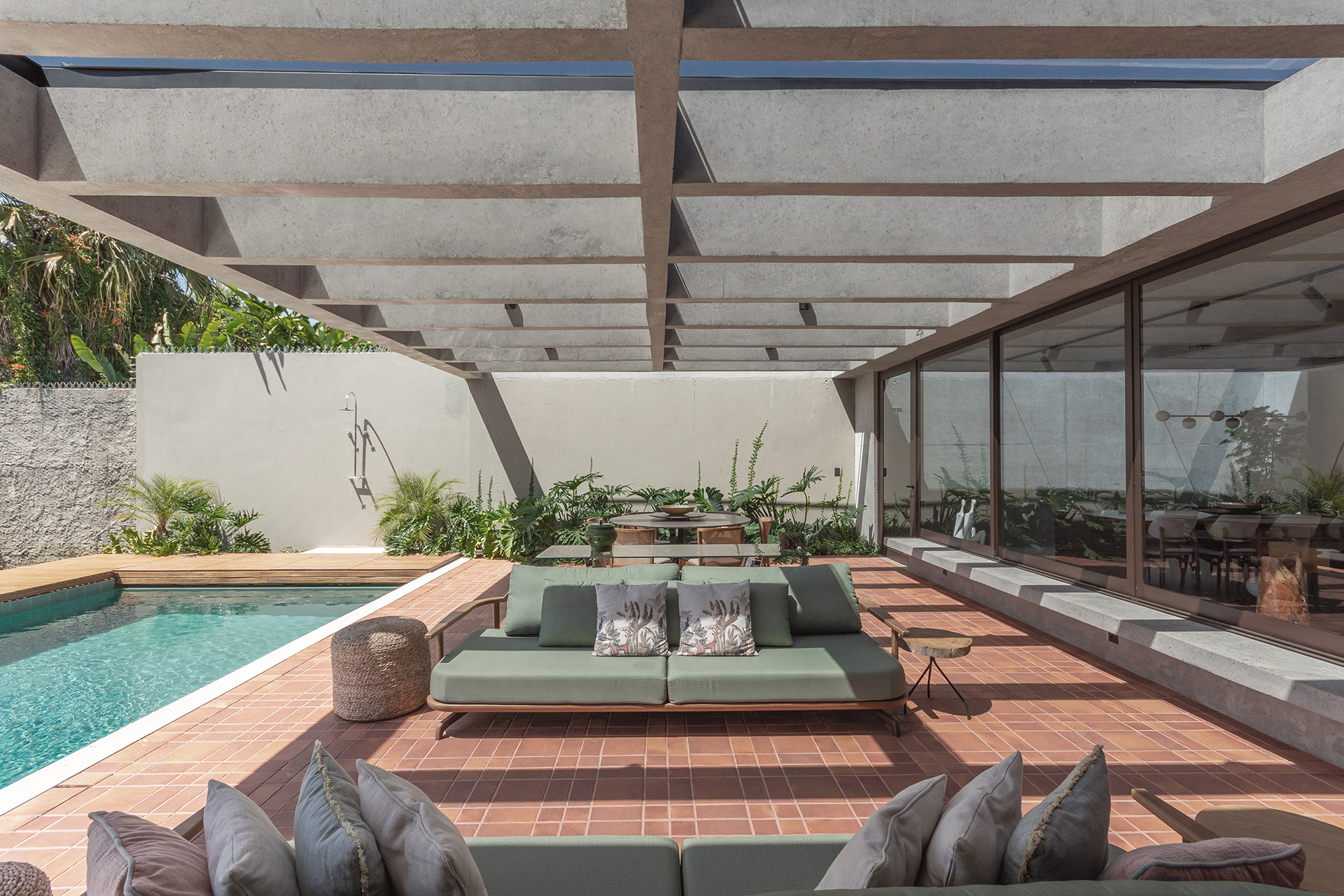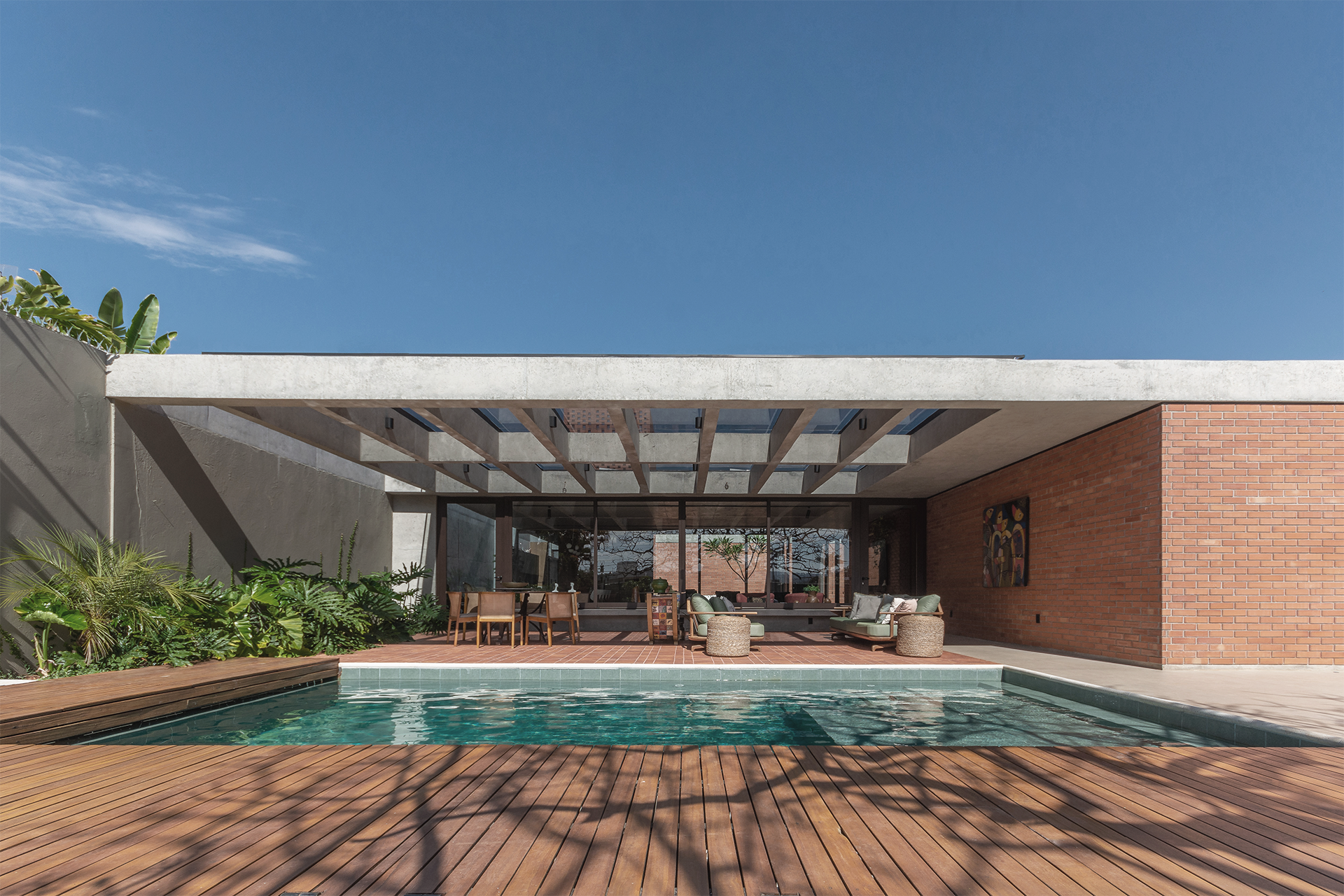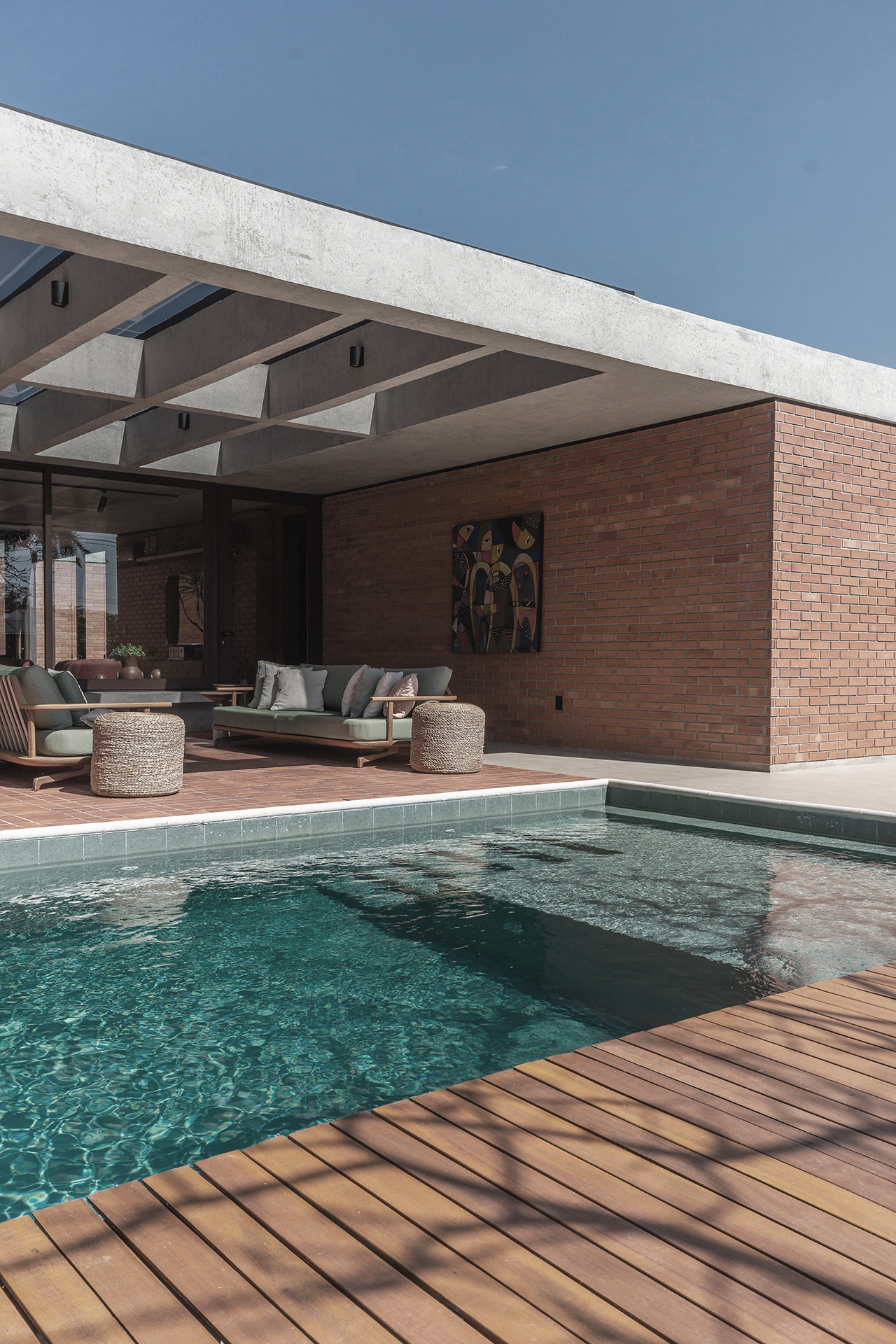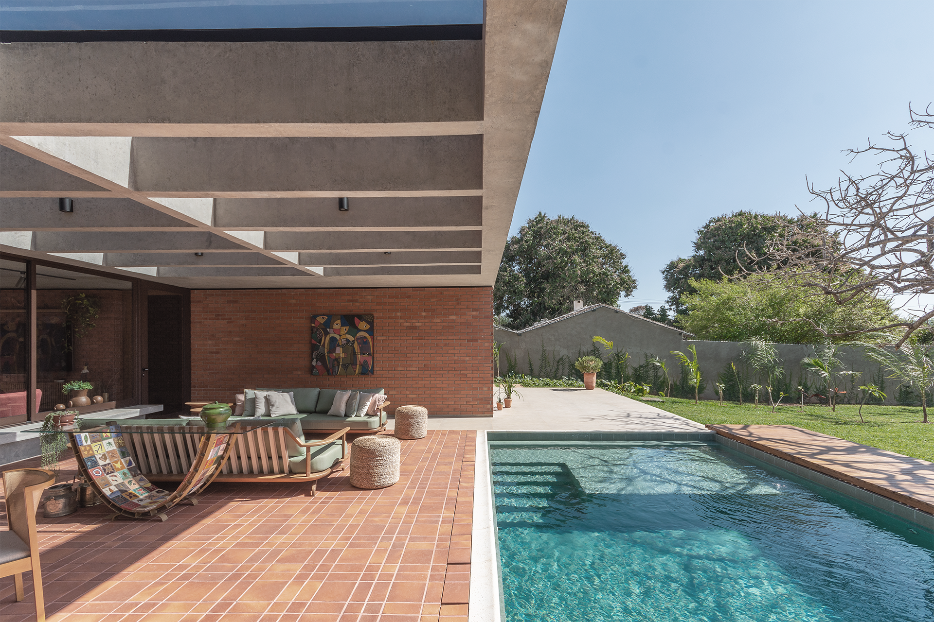 A estrutura em concreto armado, com a laje aparente e as vigas gerando pergolados em dados momentos, dialoga com o revestimento cerâmico, presente tanto nas paredes como nos pisos do pátio e da varanda. Um cobogó verticalizado, com o mesmo revestimento cerâmico, separa o pátio da cozinha no térreo e abriga os espaços das caixas d’água e boiler acima. Em praticamente todo o projeto, caixilhos de alumínio cor bronze mantem o caráter terroso dessa combinação de materiais.