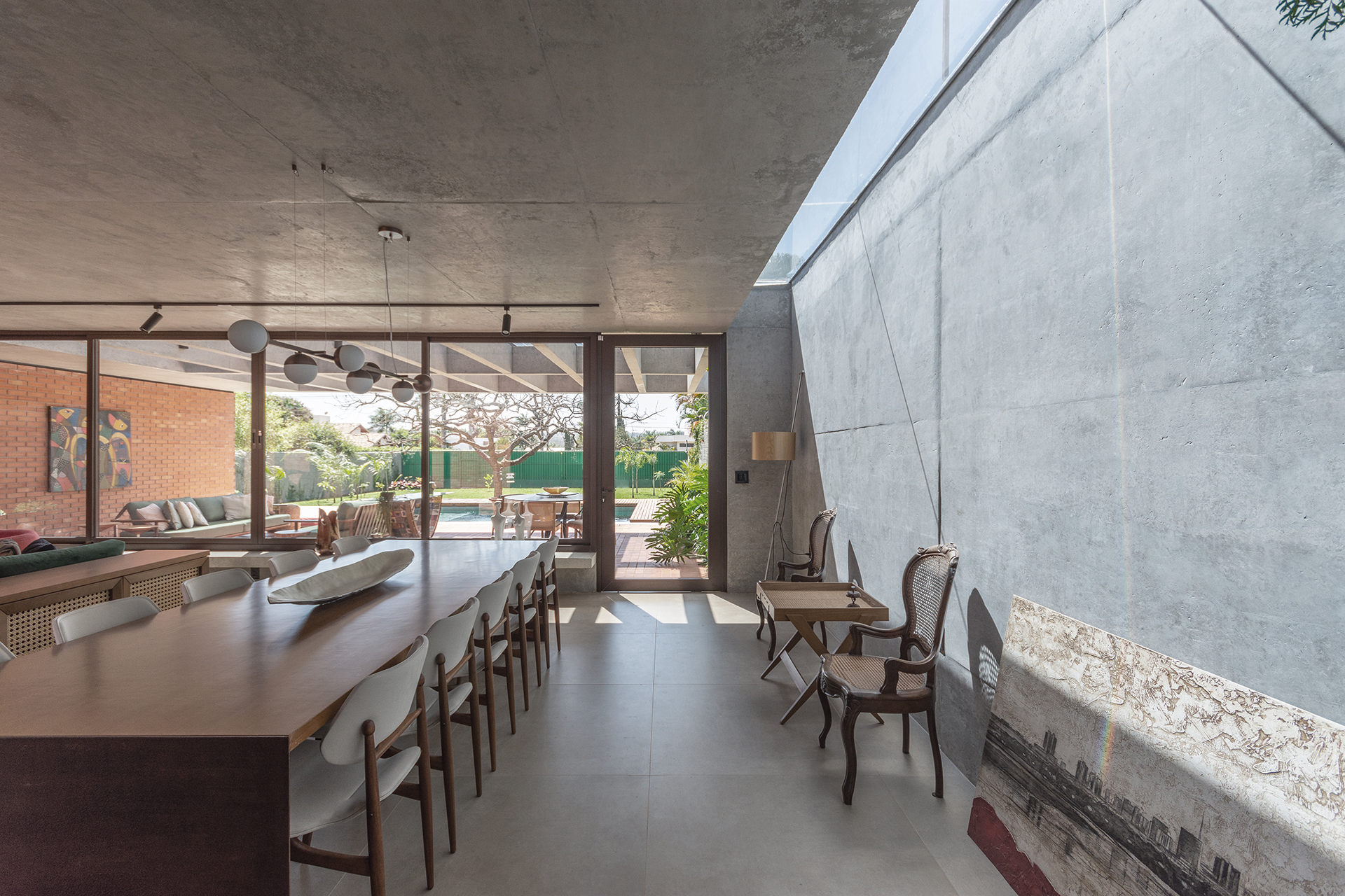 Um eixo único de circulação percorre todo o projeto, ligando a entrada principal até o jardim do fundo. Esse eixo conecta todos os ambientes e, a partir dele, se desenvolve a modulação programática da casa.
