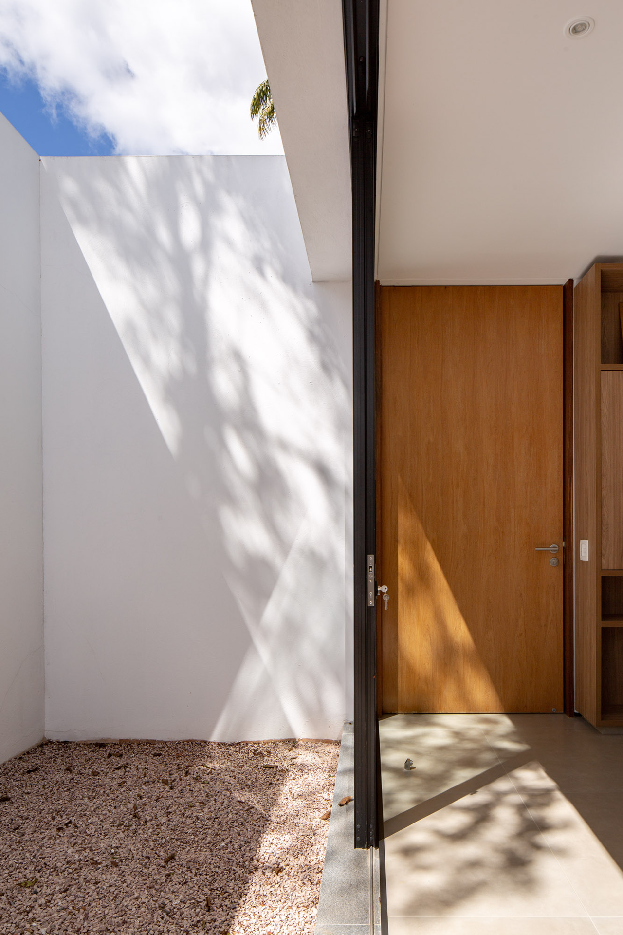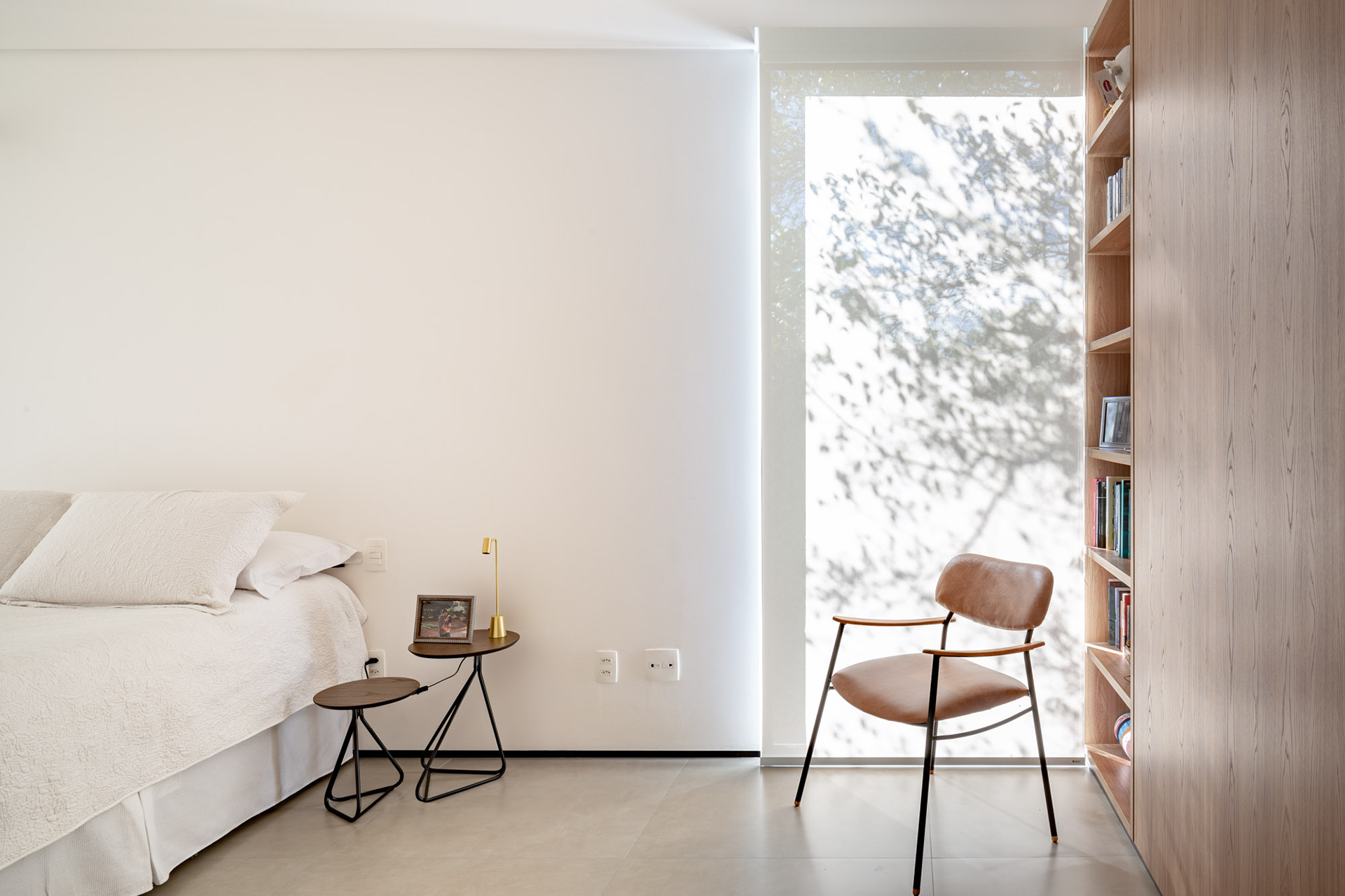 A implantação se dá a partir de um único volume, um prisma retangular, posto próximo à divisa de frente do lote e paralelo à rua. Desta forma promove-se duas relações desejadas, uma com a rua, mais austera e controlada, e outra com a densa arborização existente no fundo do lote, esta, mais generosa e aberta.