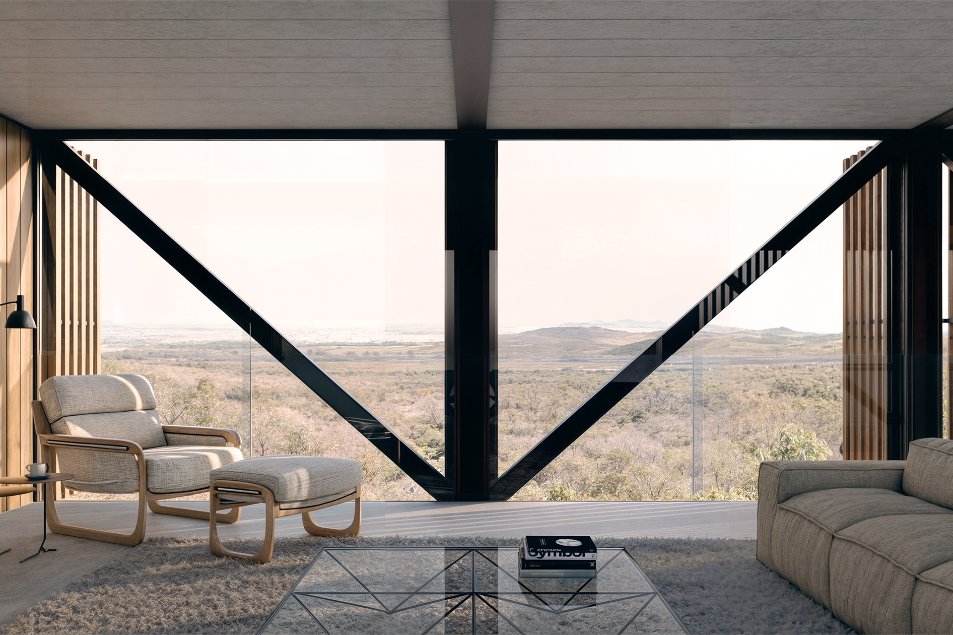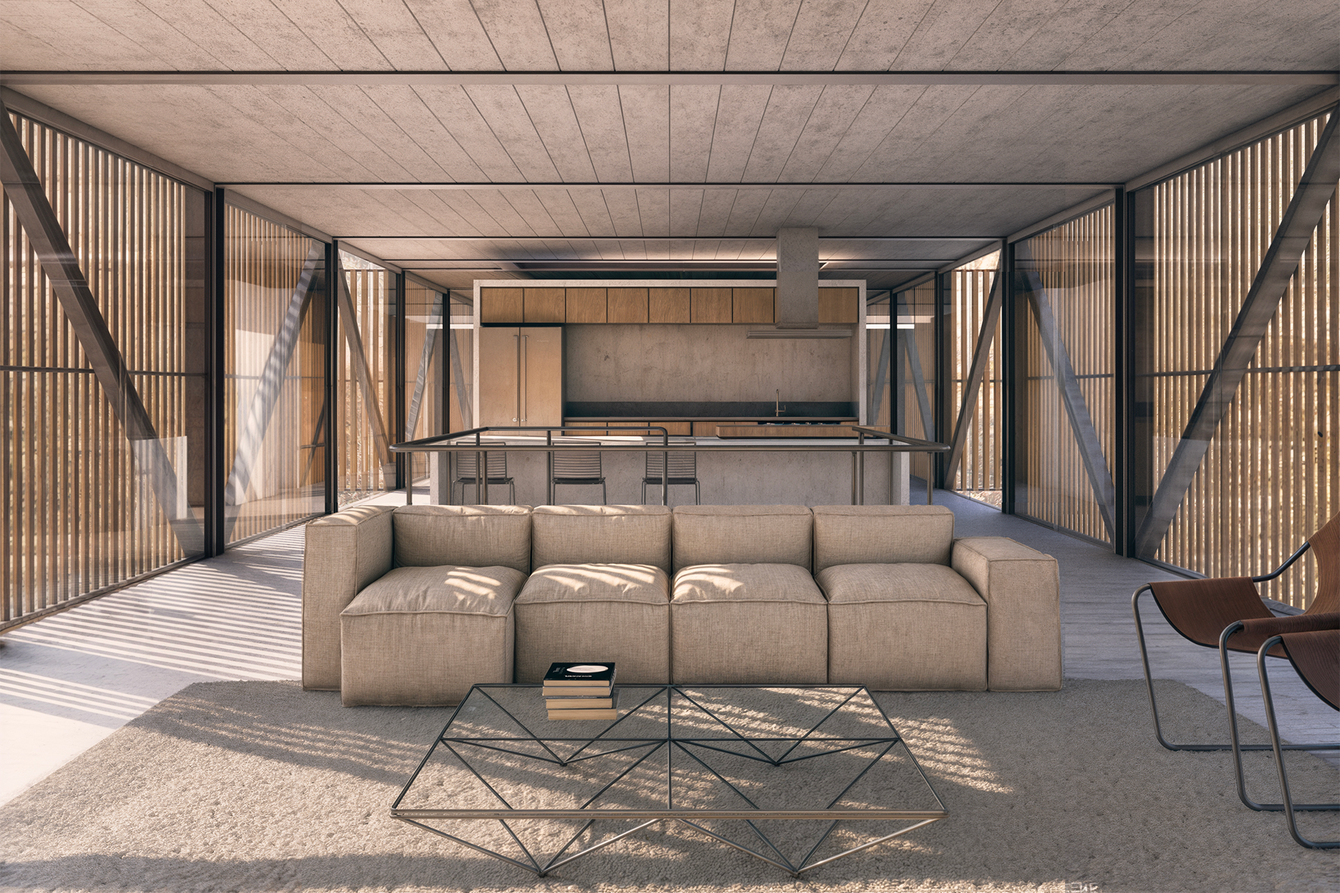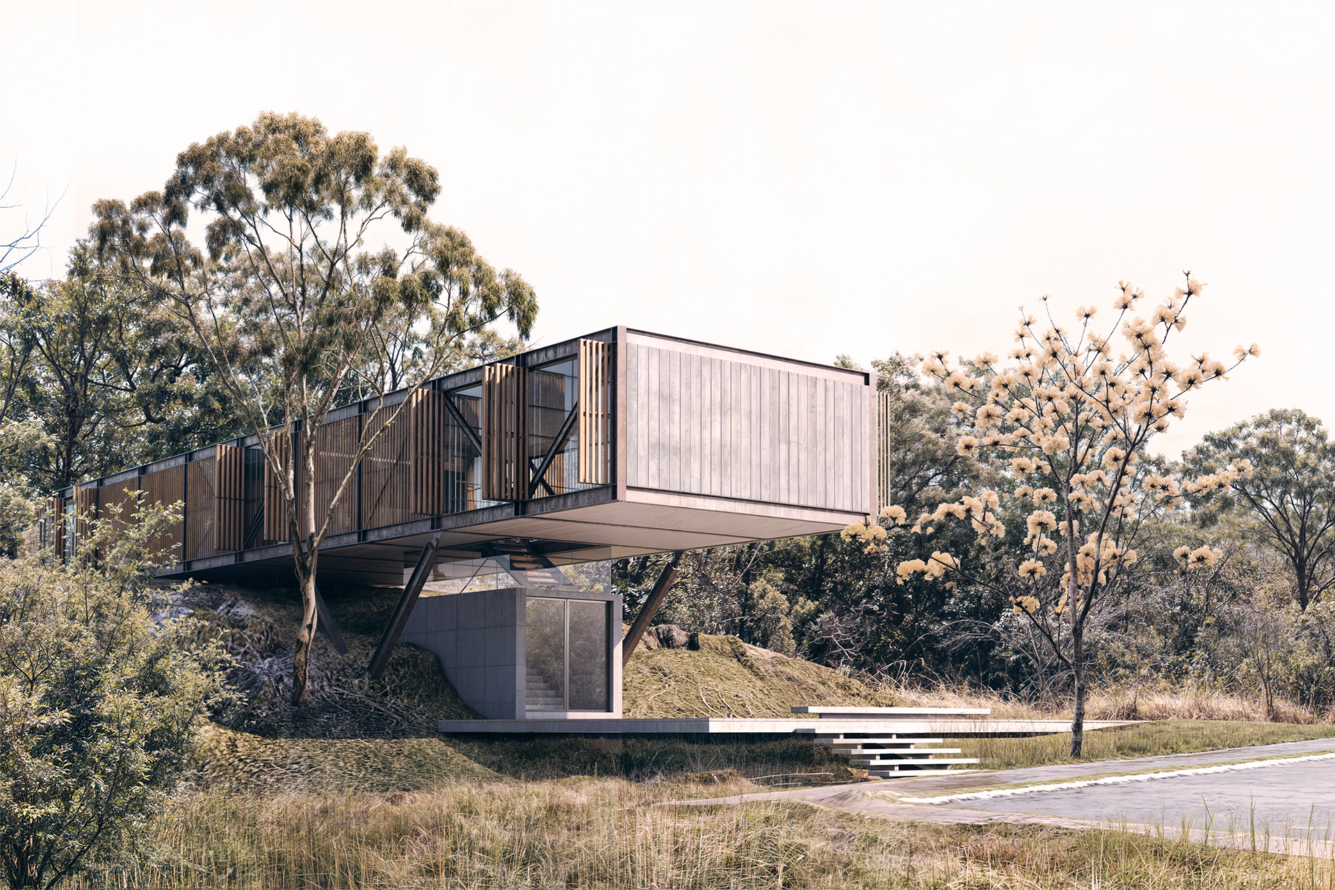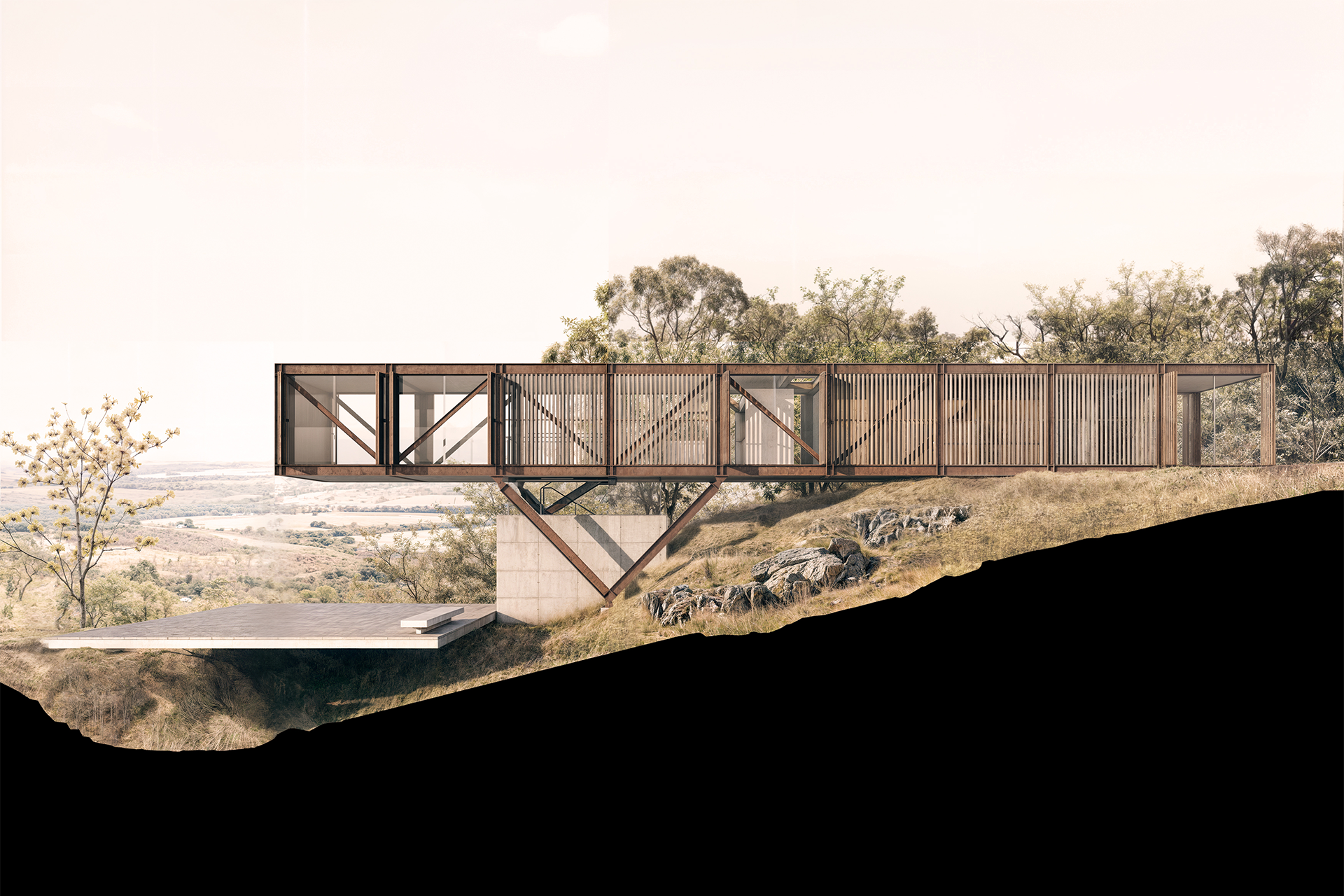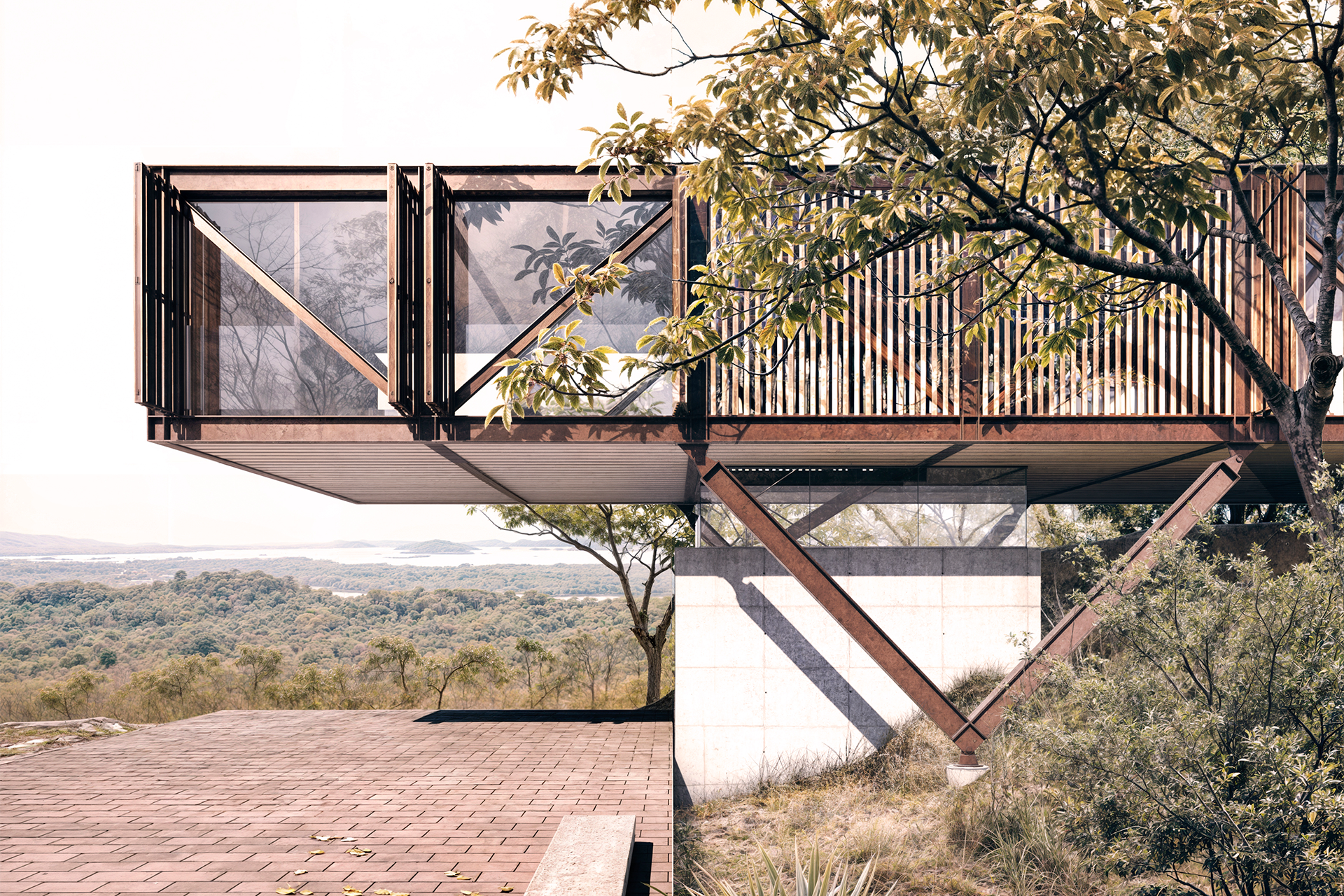 A estrutura da casa é composta por um par de treliças metálicas de 3,25m de altura apoiadas, no lado mais elevado, em dois pilares em “V” e, no lado mais próximo ao terreno, em pequenos pilares de concreto armado, como se pousado sobre a topografia. Ripas de madeira sombreiam a fachada e intermediam a relação interna e externa dos ambientes. A estrutura em aço cortén, junto com o amadeirado das ripas e armários, propõem um diálogo com o cerrado circundante, fazendo o projeto compor visualmente com o lote.