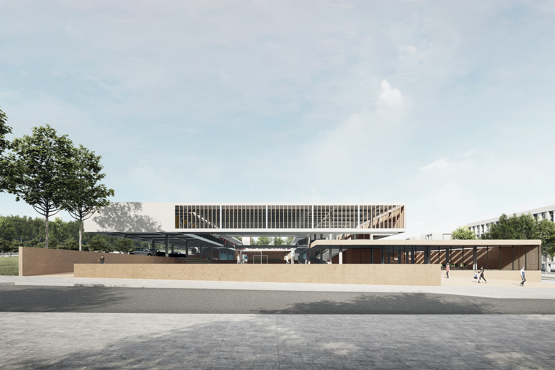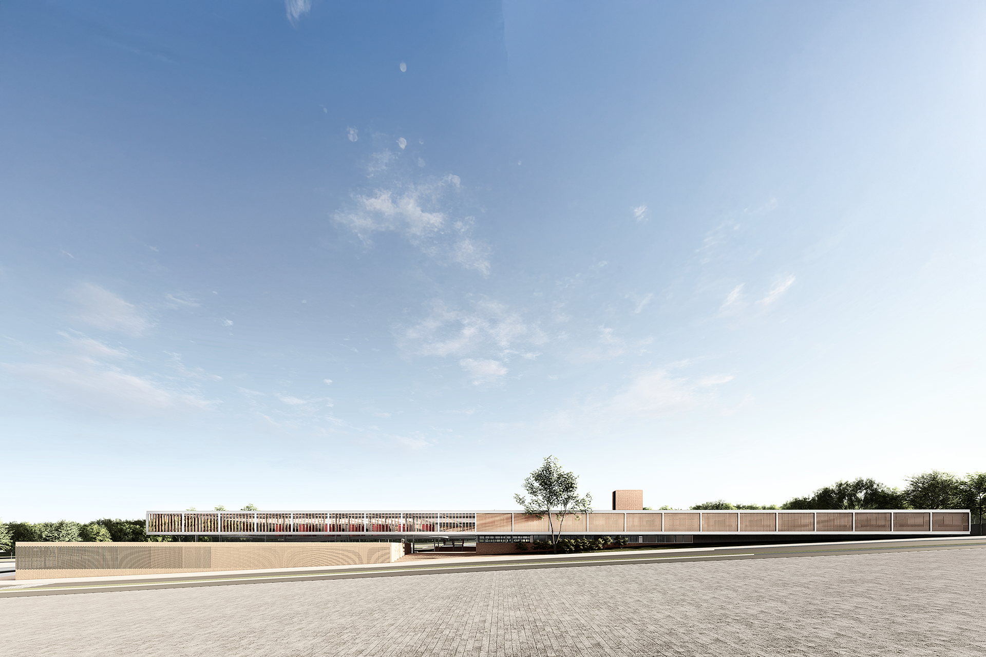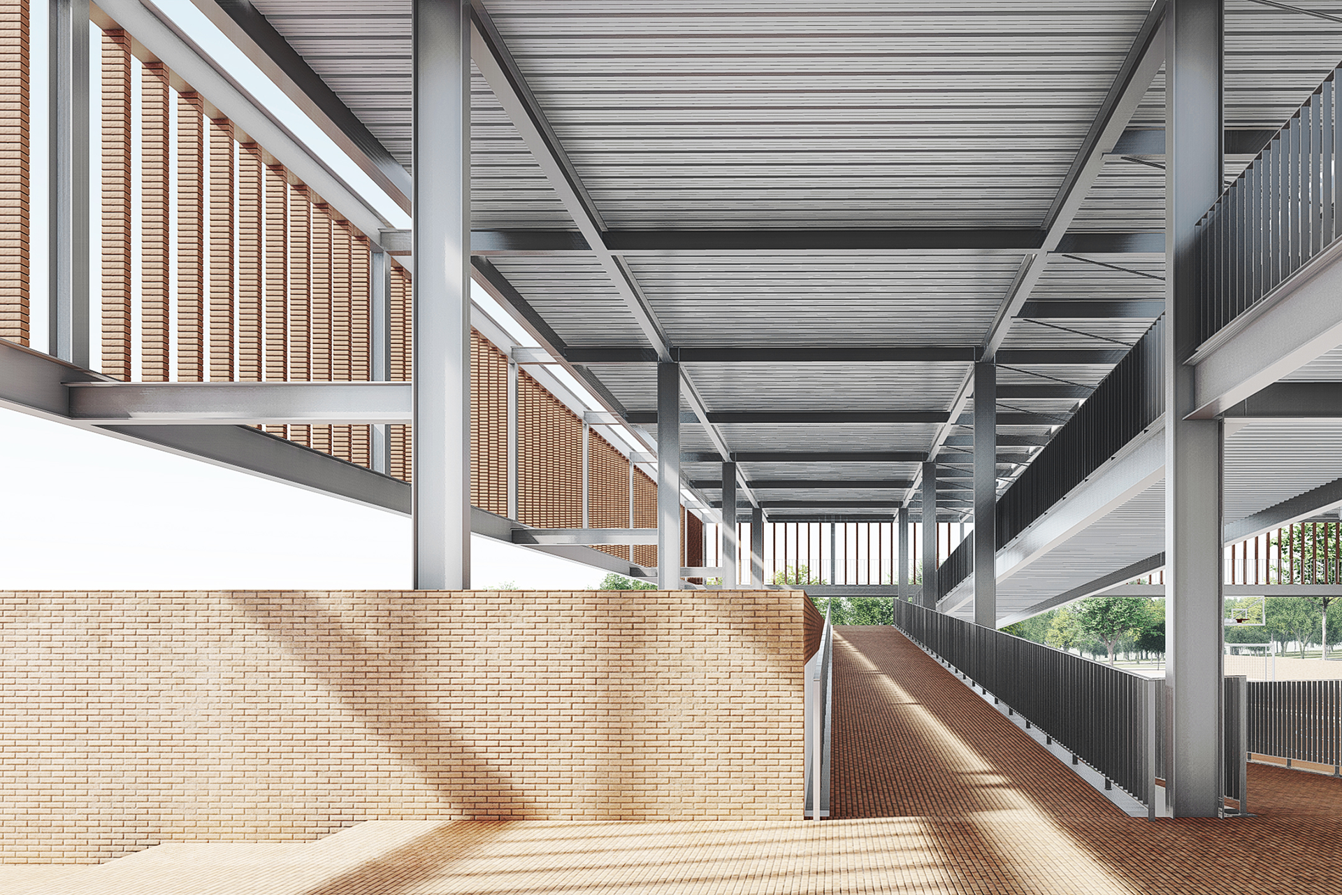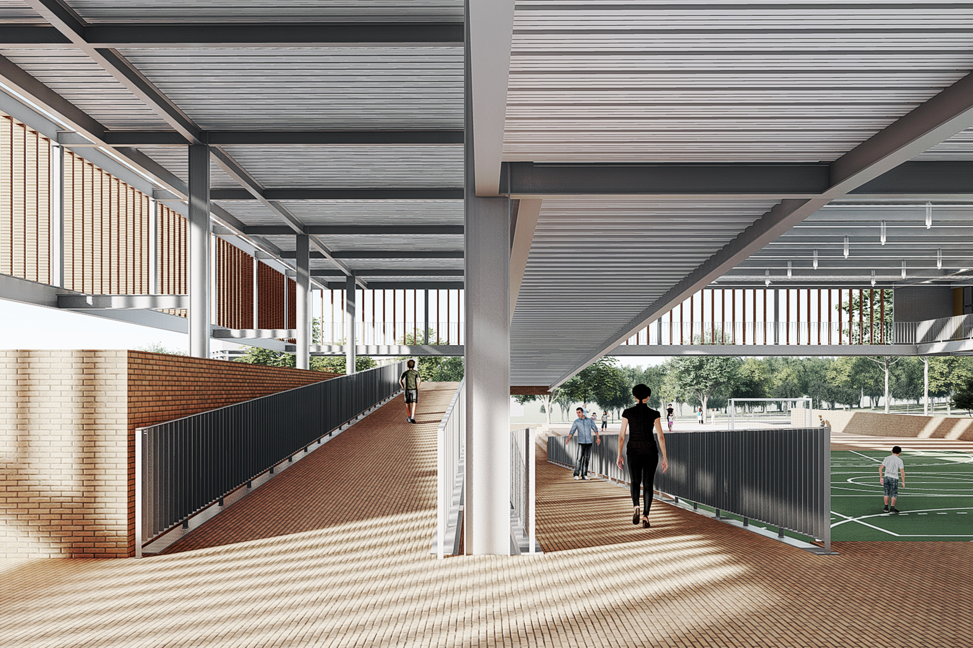 Por fim, o projeto propõe que a entrada da escola seja permeável ao bairro a partir de sua esquina principal, oposta à praça da Avenida Crixá. Nesse ponto, o edifício se apresenta de maneira convidativa, garantindo acesso às funções de caráter público e lúdico da escola — como o restaurante, a quadra e o auditório — sem comprometer seu funcionamento cotidiano. Uma pequena praça de acesso facilita a recepção da comunidade, funcionando como uma transição suave entre a rua e o edifício. Assim, a escola se abre de forma franca para a cidade.