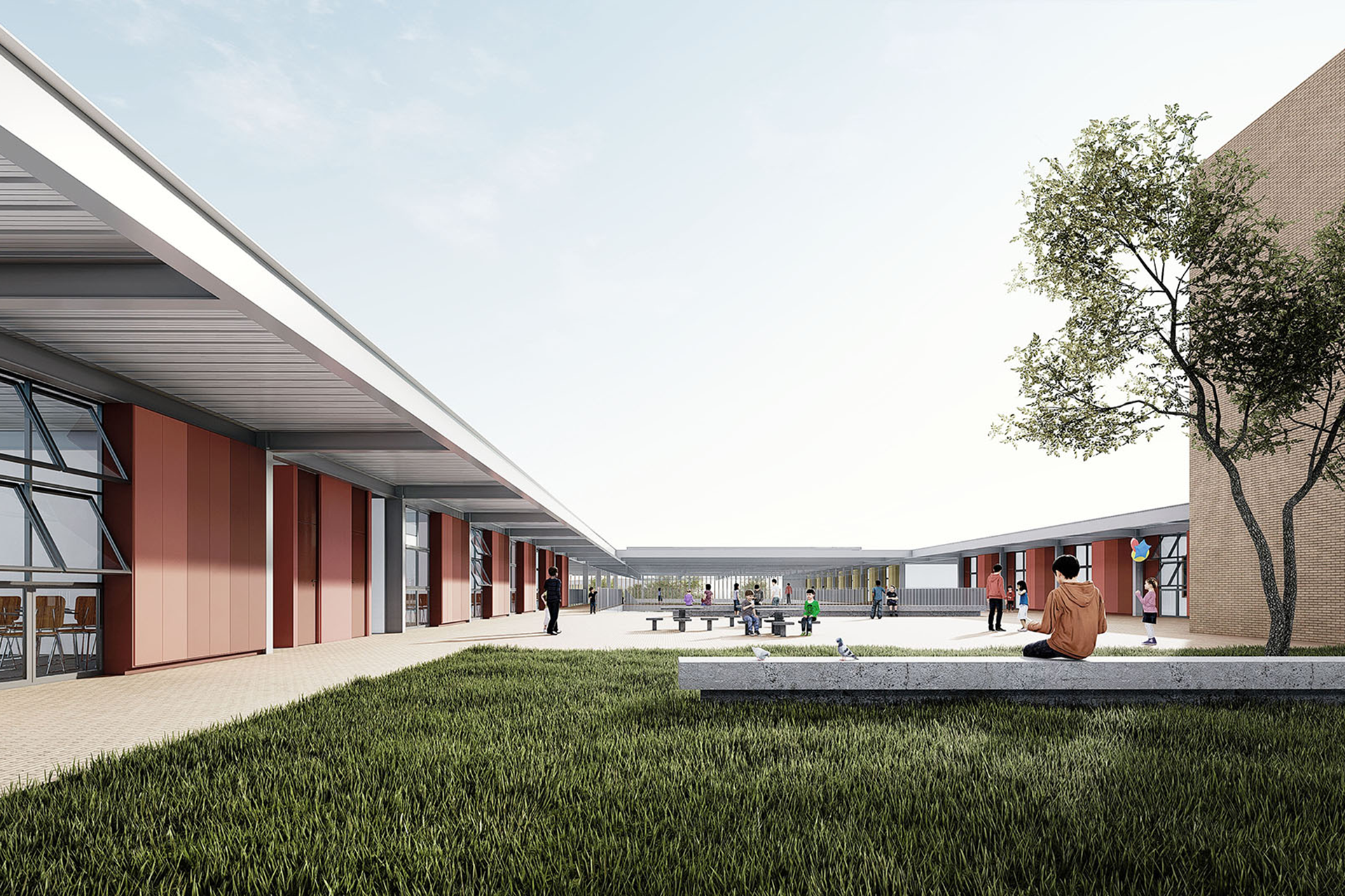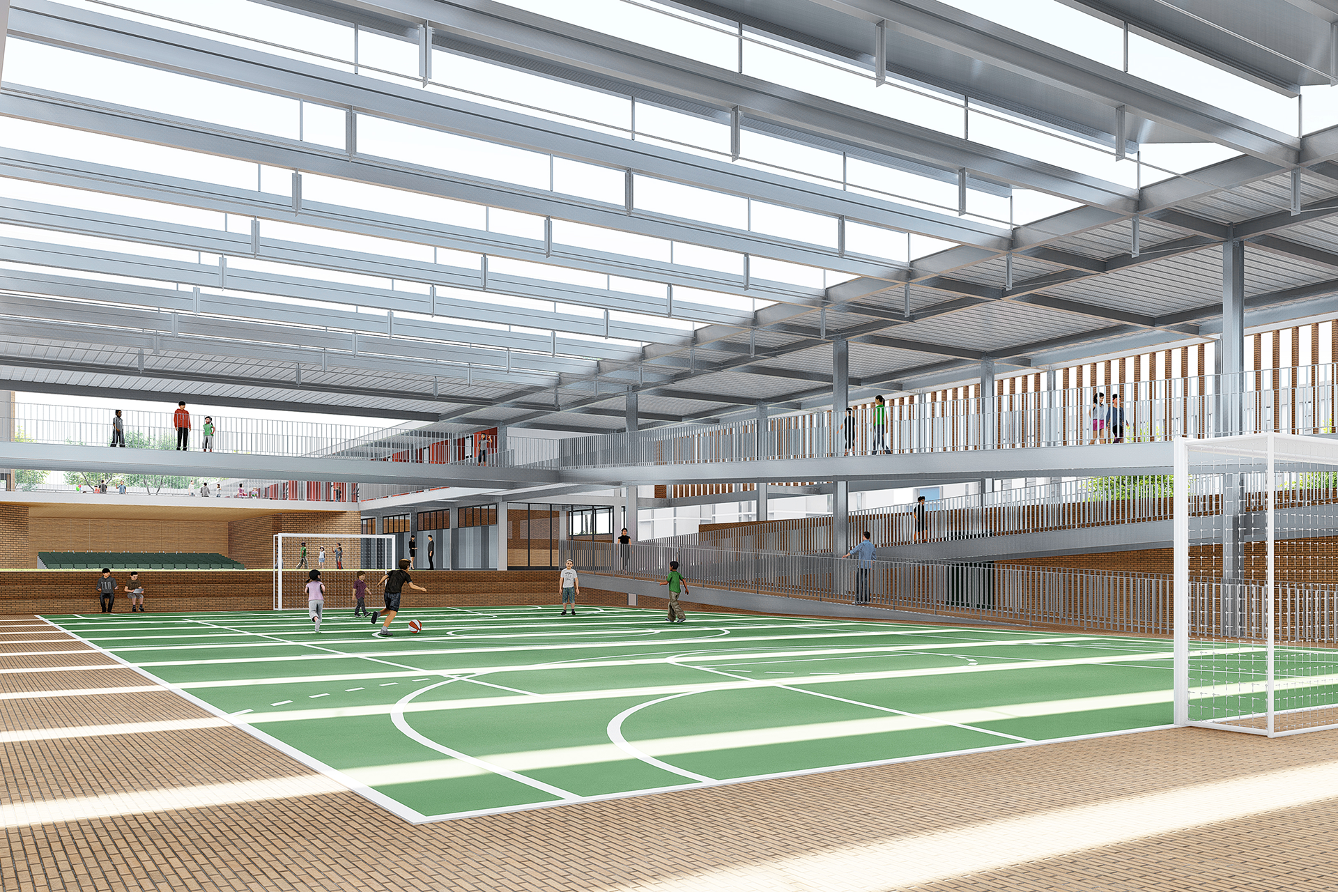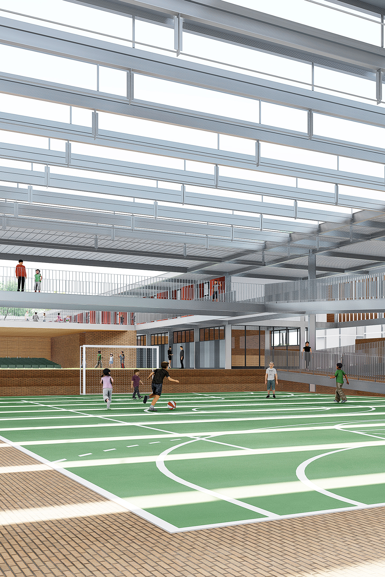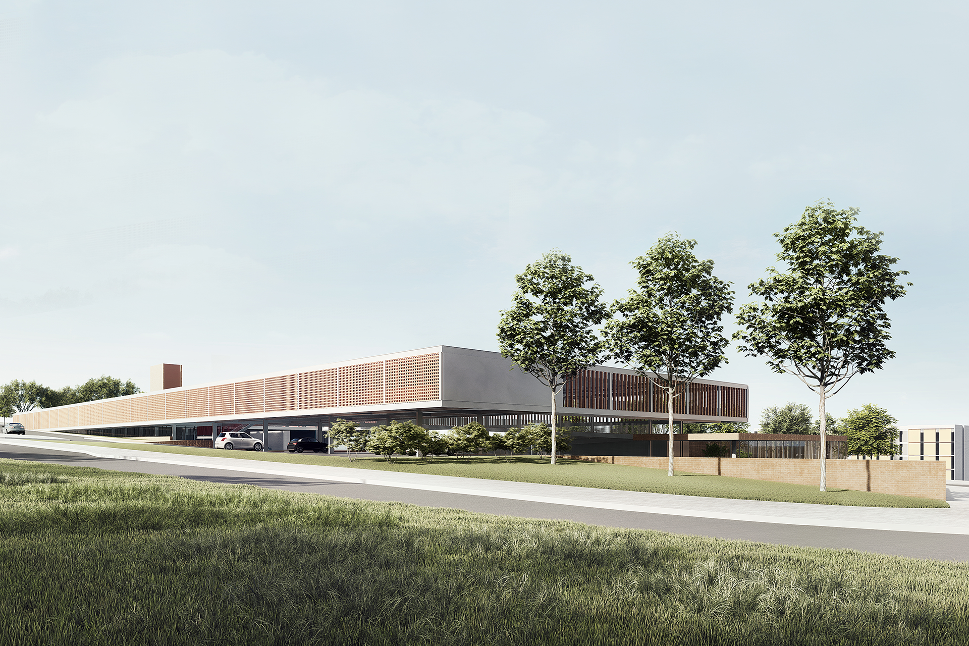 Por fim, o projeto propõe que a entrada da escola seja permeável ao bairro a partir de sua esquina principal, oposta à praça da Avenida Crixá. Nesse ponto, o edifício se apresenta de maneira convidativa, garantindo acesso às funções de caráter público e lúdico da escola — como o restaurante, a quadra e o auditório — sem comprometer seu funcionamento cotidiano. Uma pequena praça de acesso facilita a recepção da comunidade, funcionando como uma transição suave entre a rua e o edifício. Assim, a escola se abre de forma franca para a cidade.