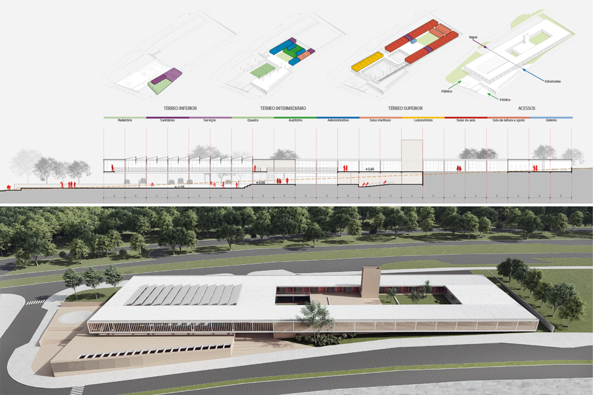 A partir dos platôs criados, o programa de necessidades da escola foi distribuído conforme os graus de intimidade necessários. Assim, a parte pública da escola é disposta nos níveis inferiores juntamente com as funções administrativas e de apoio. Voltada para um pátio interno, a parte superior fica reservada para as funções pedagógicas, de forma a se obter a intimidade e concentração favoráveis ao processo de ensino-aprendizagem. Essa gradação entre público e privado é também expressa nas fachadas, tratadas de modo a garantir (ou evitar) a visibilidade da rua.
