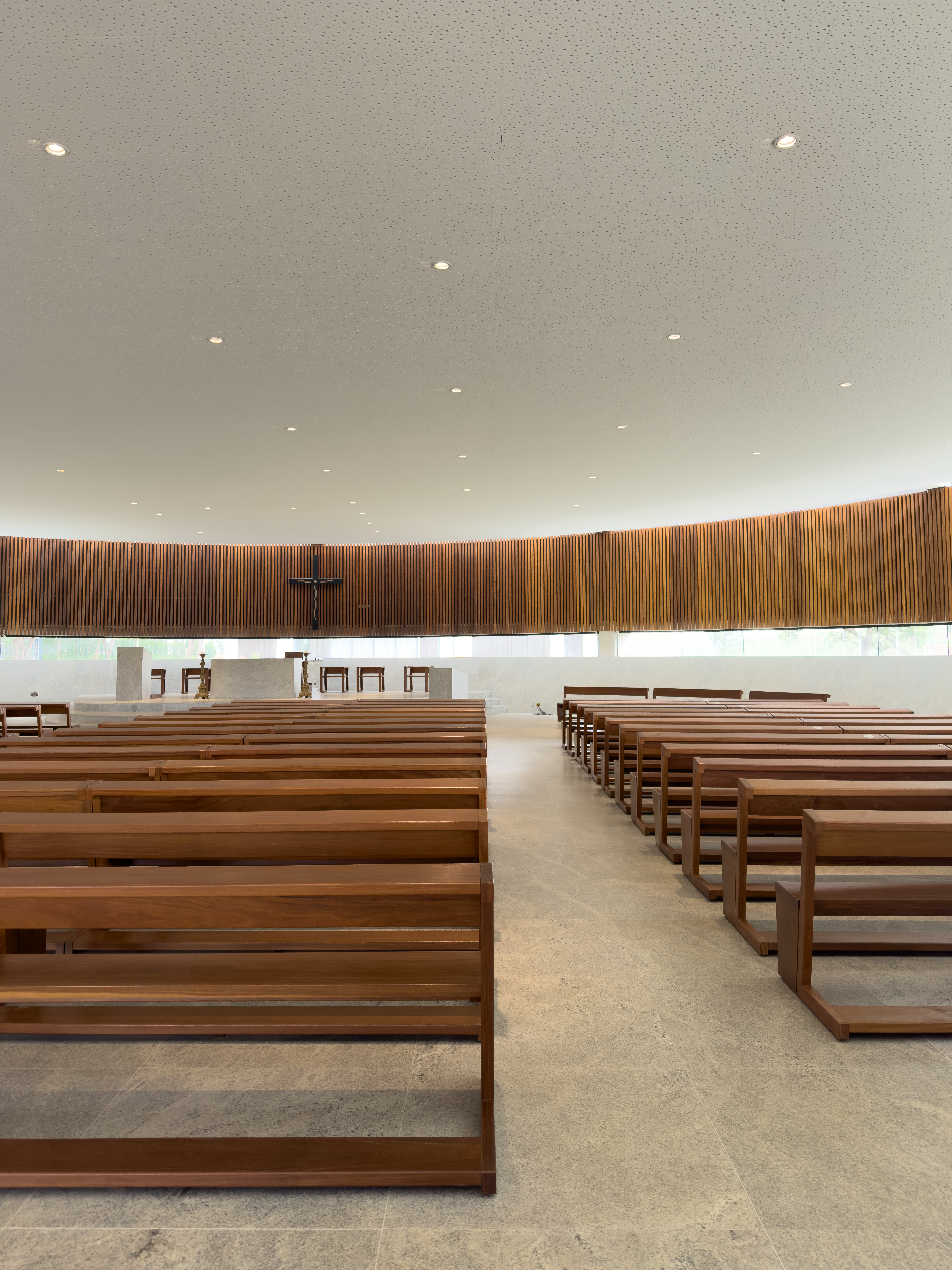 The architectural concept adopted unfolds itself from the relationship between spirituality, nature, and community. Spirituality communicates itself in the Catholic religion through its rites, celebrations, and sacred symbols. The sacred sense stands and renovates itself through the sensitive contact of nature, which evokes the divine presence and the integration with the cosmos. Architecture, on its turn, has been the privileged space of manifestation of the sacred by the person who occupies it, where the light penetrates delicately or where the silence of the stone manifests itself in the murmur of the prayers. The circular nave brings as a concept this gesture of welcoming, as it approximates the altar to the congregation.