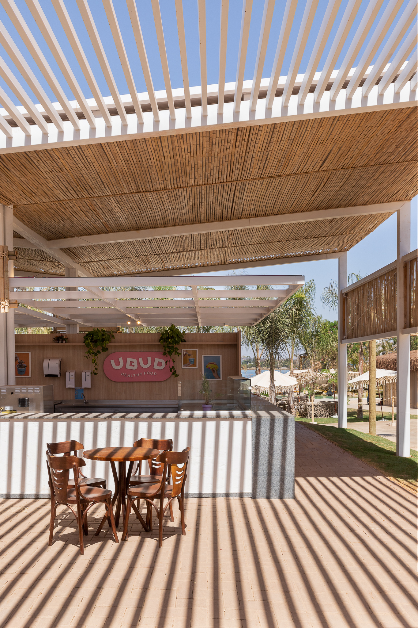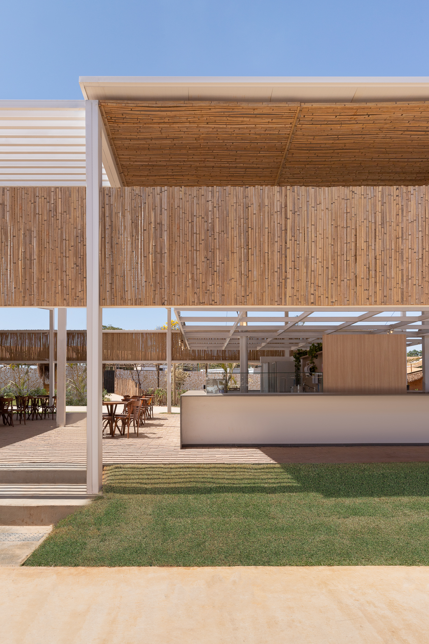 The building housing the store and cafés features a metal structure. In plan, seven 5-meter spans run longitudinally, while two 6.5-meter spans define the transversal direction, resulting in a 5×6.5-meter grid that guides spatial organization. The steel framework, painted white, creates a striking contrast with the natural bamboo, which is incorporated into the ceiling, access doors, and sunshading elements (brises), reinforcing the project’s material identity and environmental responsiveness.