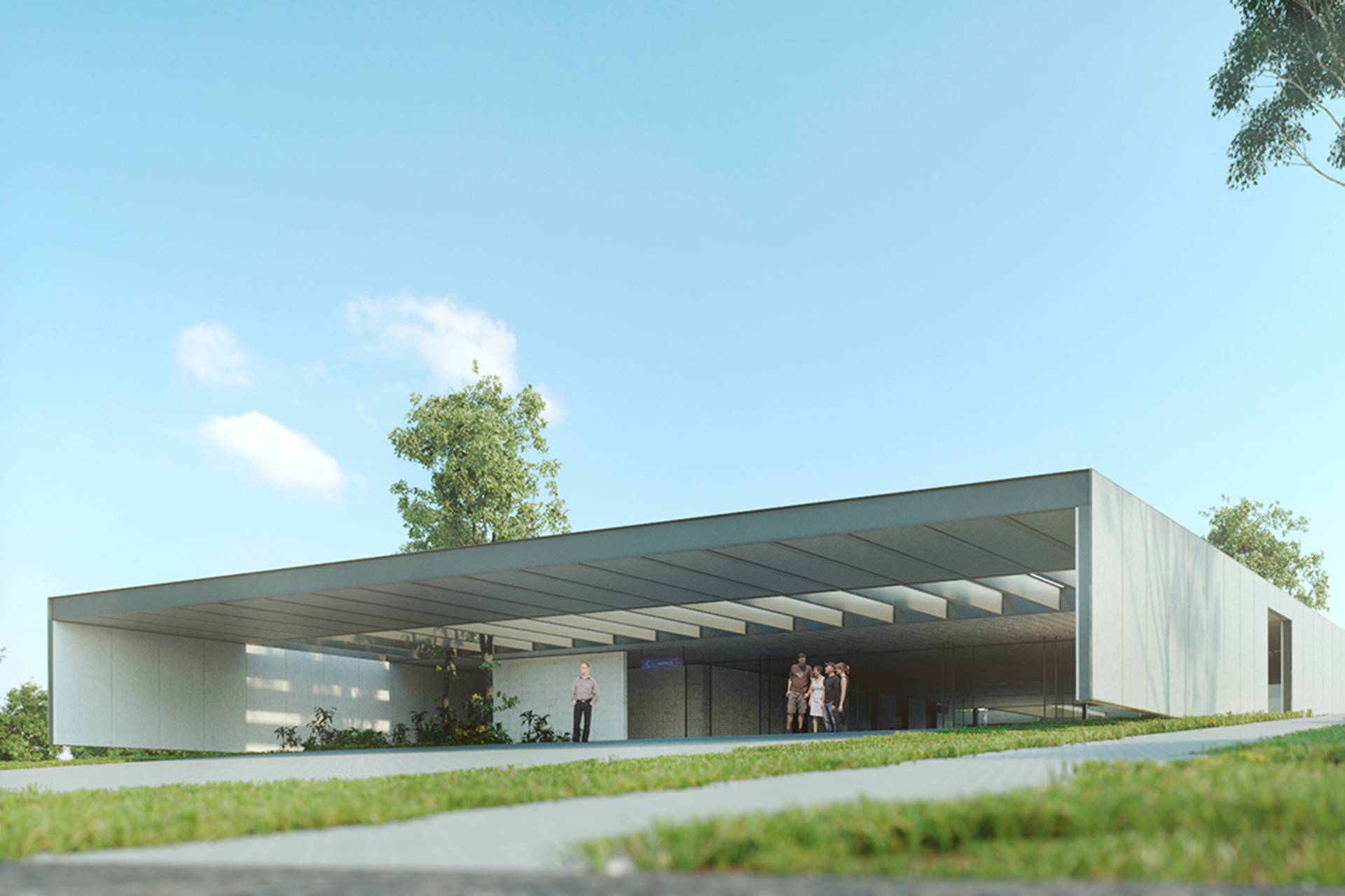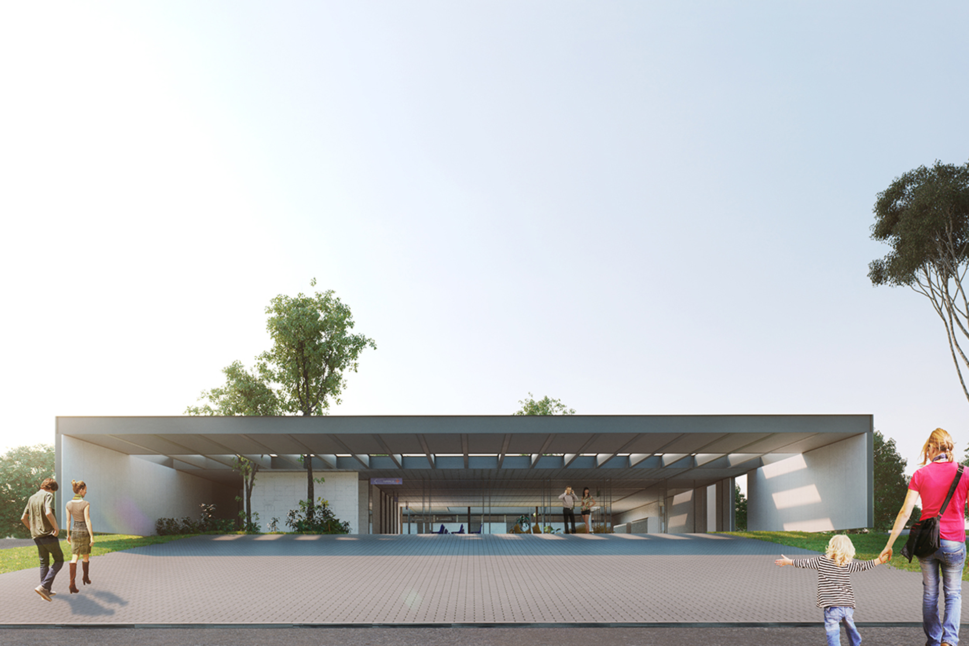 The design follows a linear pavilion structure, stretching across the site. Two circulation axes serve as the organizing elements of the composition, articulating the extensive program requirements while structuring the interior flow of the building.