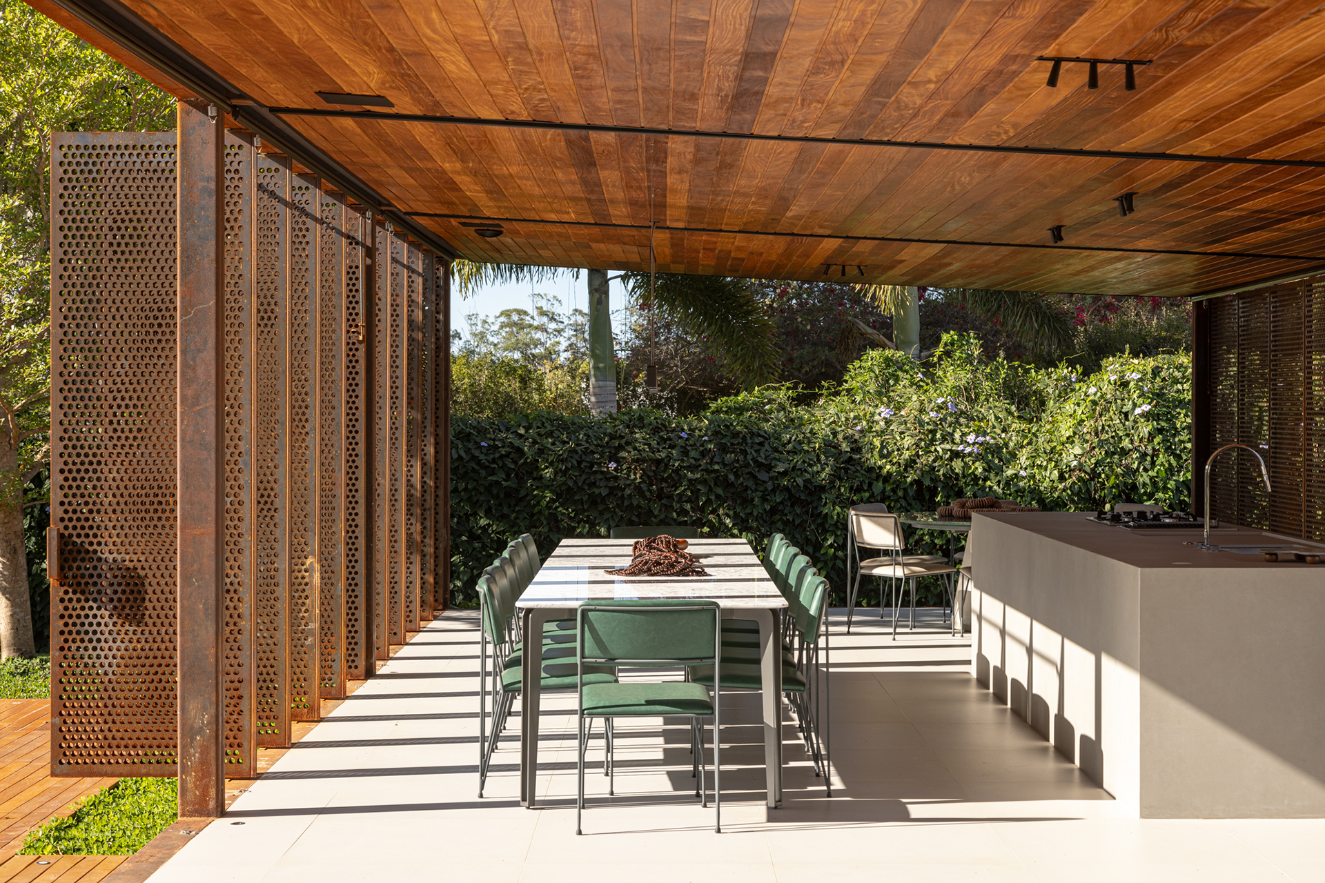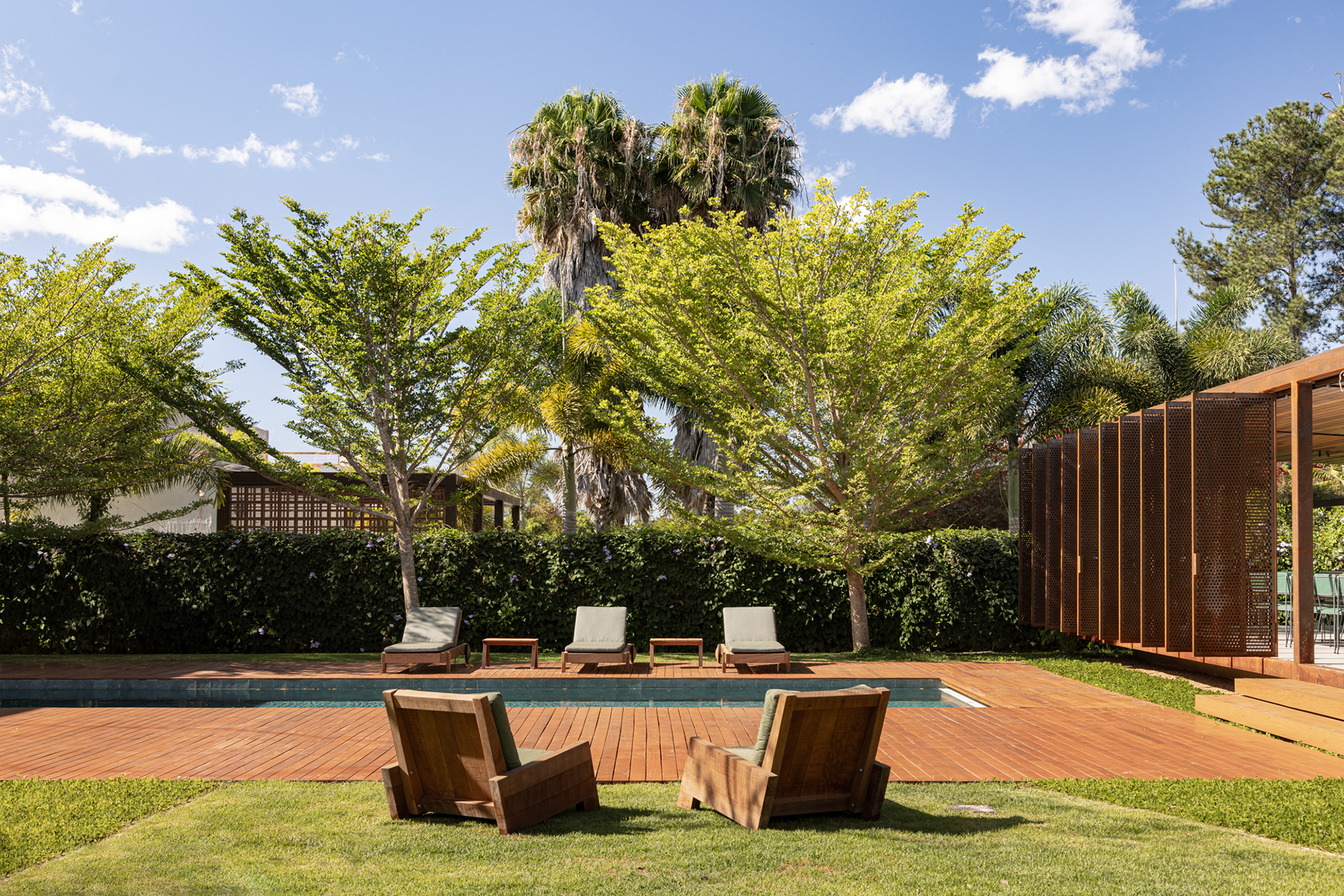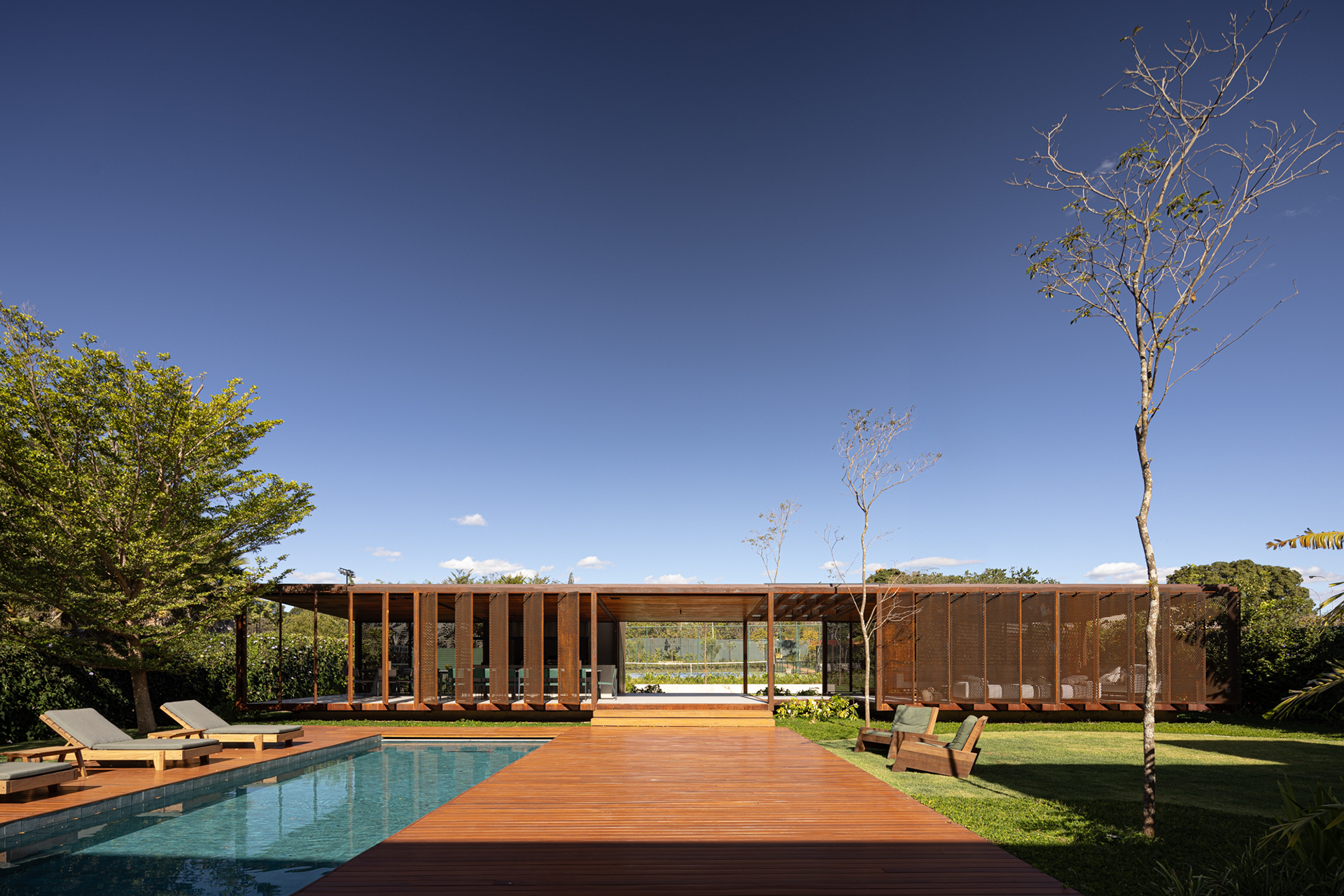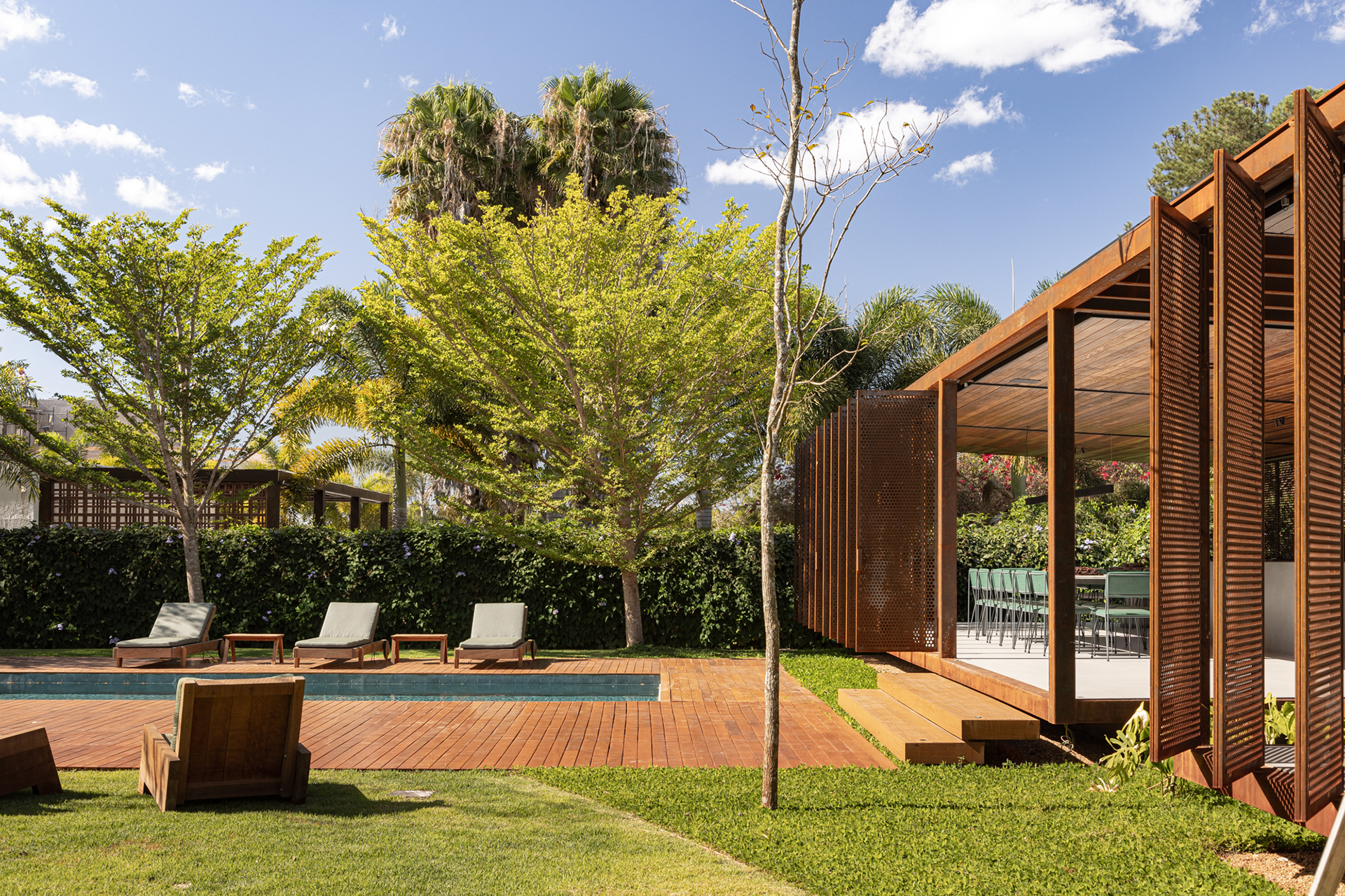 The building was named “Pavilhão Varanda” (Porch Pavilion), referencing a space commonly found in Brazilian homes, whether vernacular, colonial, or modern. In this context, the porch—a pleasant, open, and shaded area ideal for gatherings and leisure—was conceived as an autonomous structure. Positioned centrally on the property, the pavilion serves as a transition between the existing house, to which it connects via an expansive wooden deck with a swimming pool, and the large garden at the back.