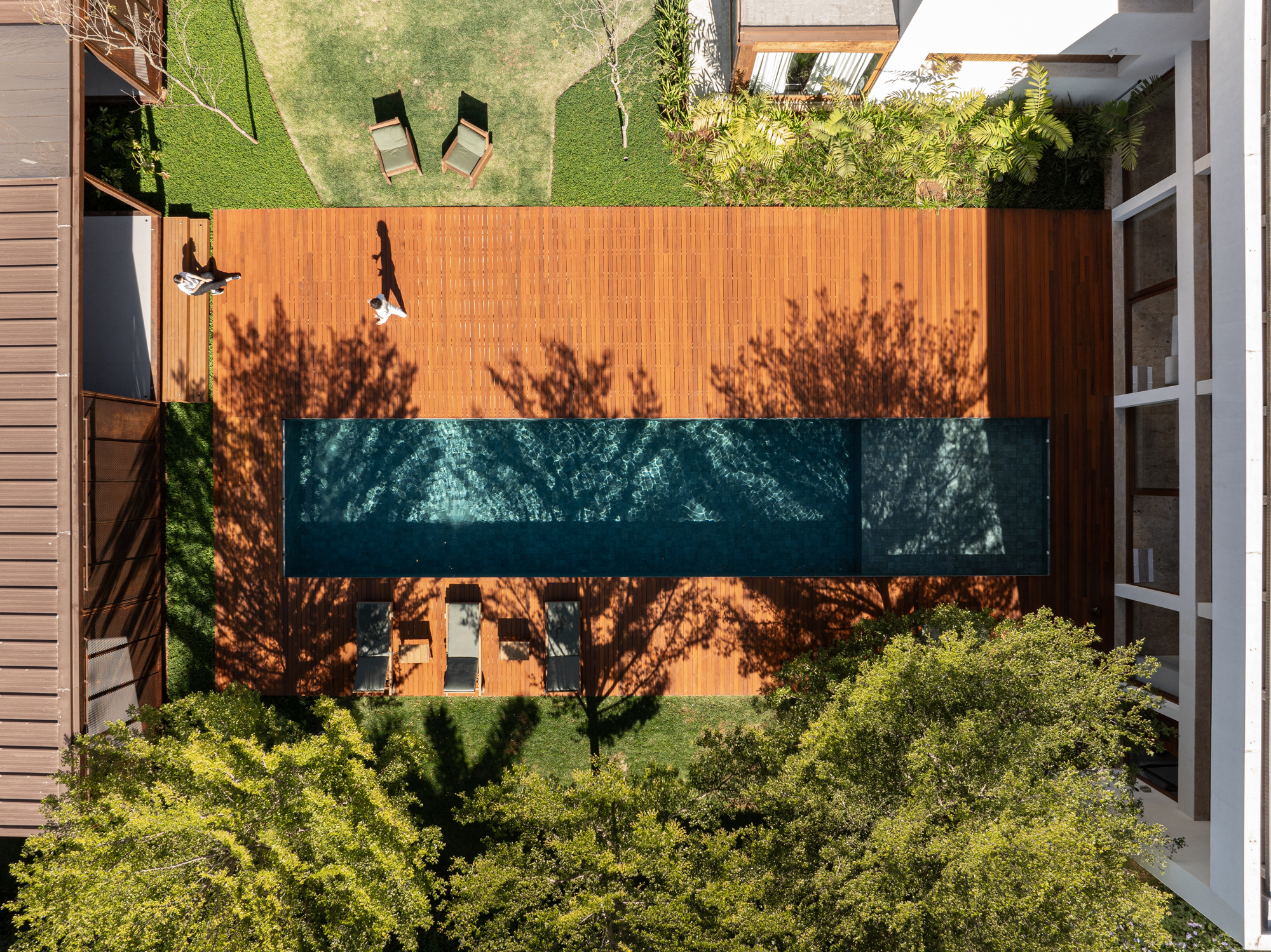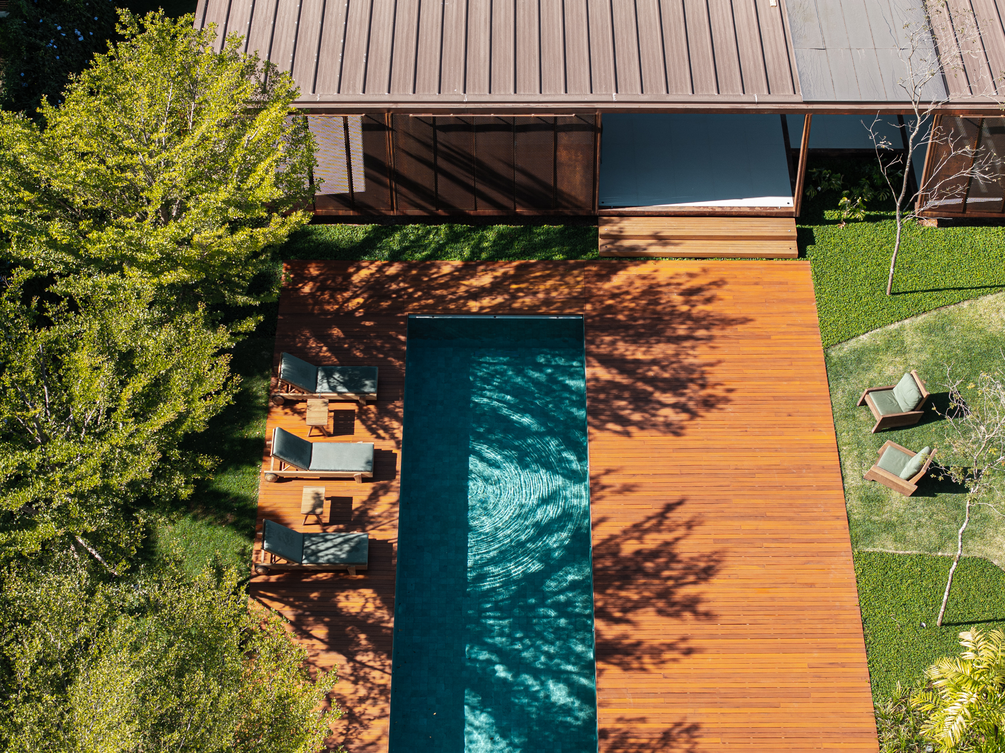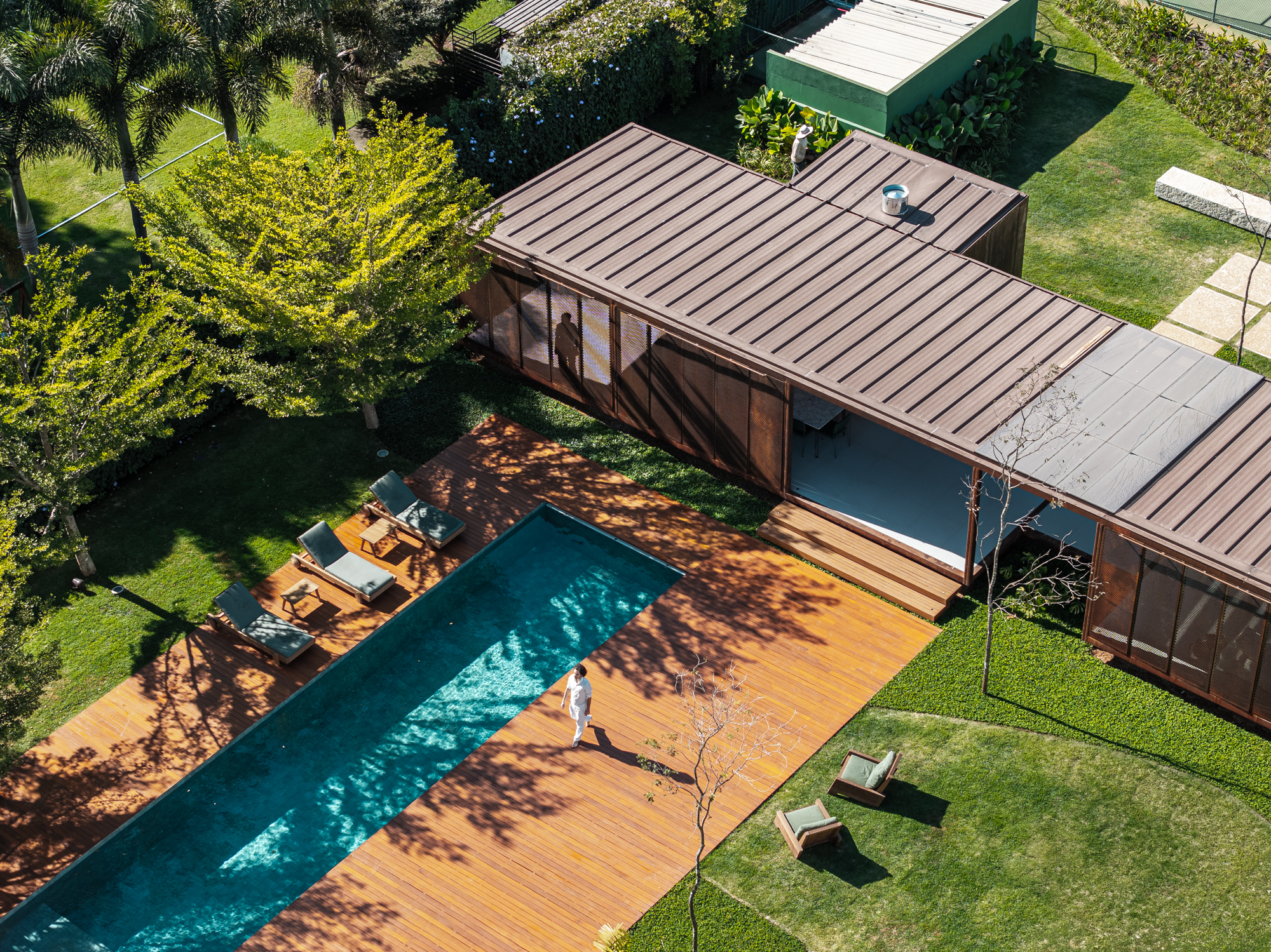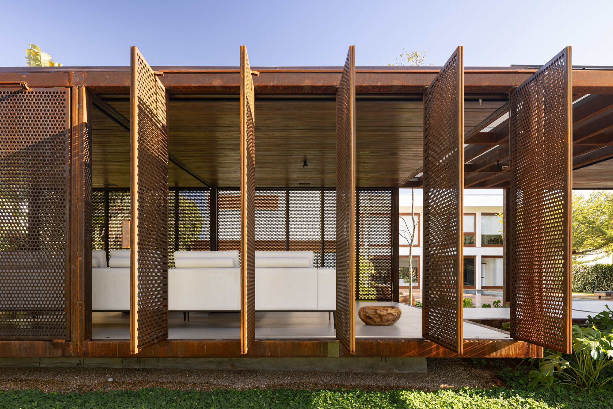 The building was named “Pavilhão Varanda” (Porch Pavilion), referencing a space commonly found in Brazilian homes, whether vernacular, colonial, or modern. In this context, the porch—a pleasant, open, and shaded area ideal for gatherings and leisure—was conceived as an autonomous structure. Positioned centrally on the property, the pavilion serves as a transition between the existing house, to which it connects via an expansive wooden deck with a swimming pool, and the large garden at the back.