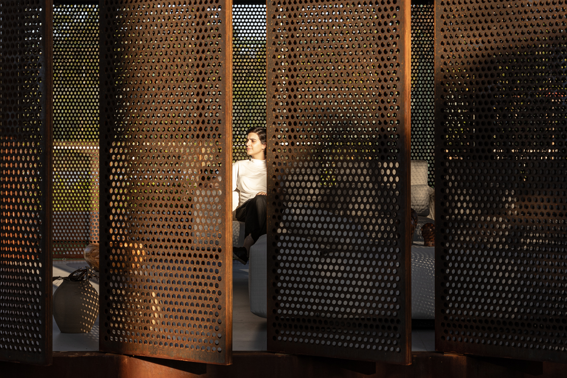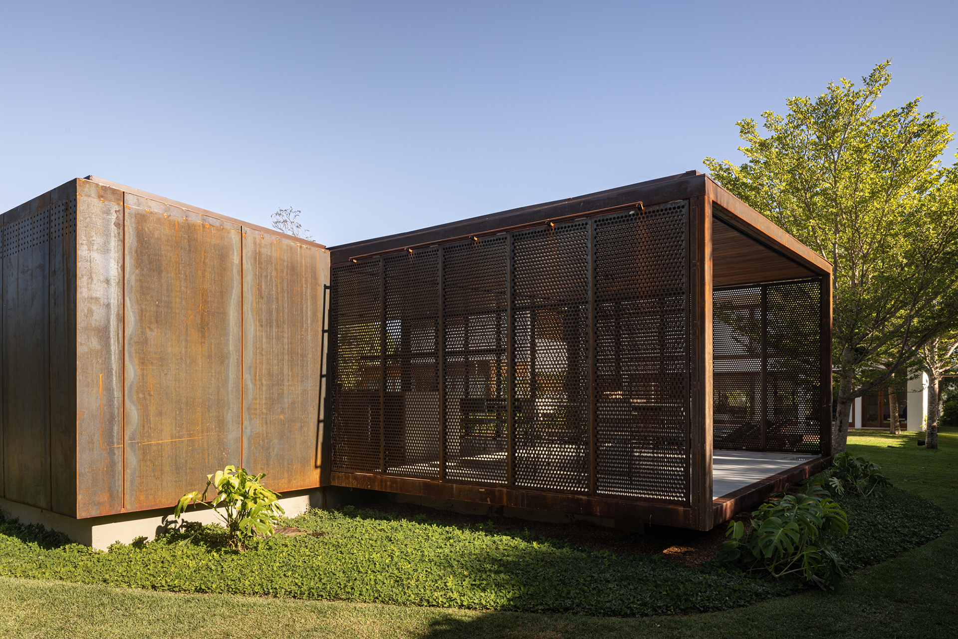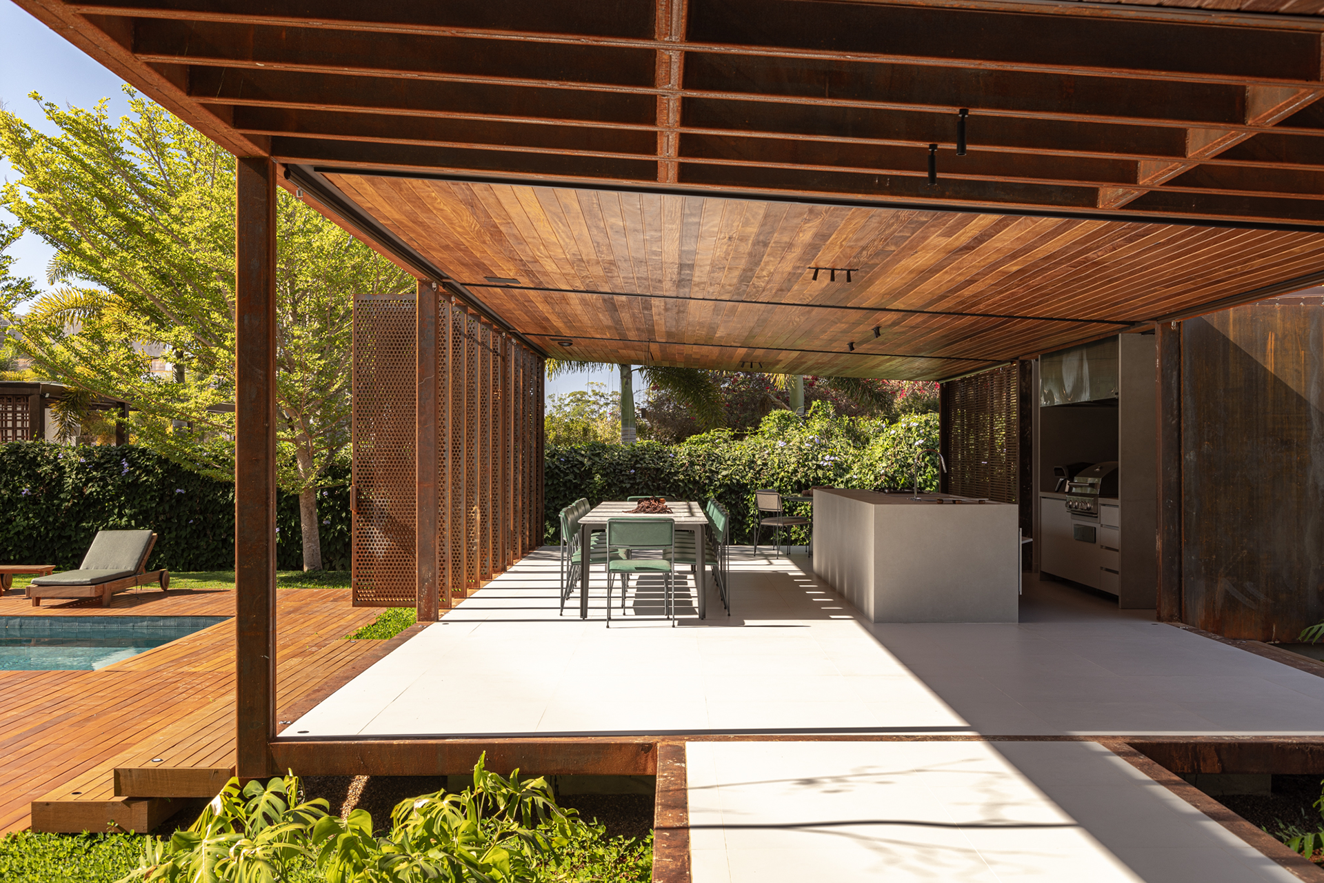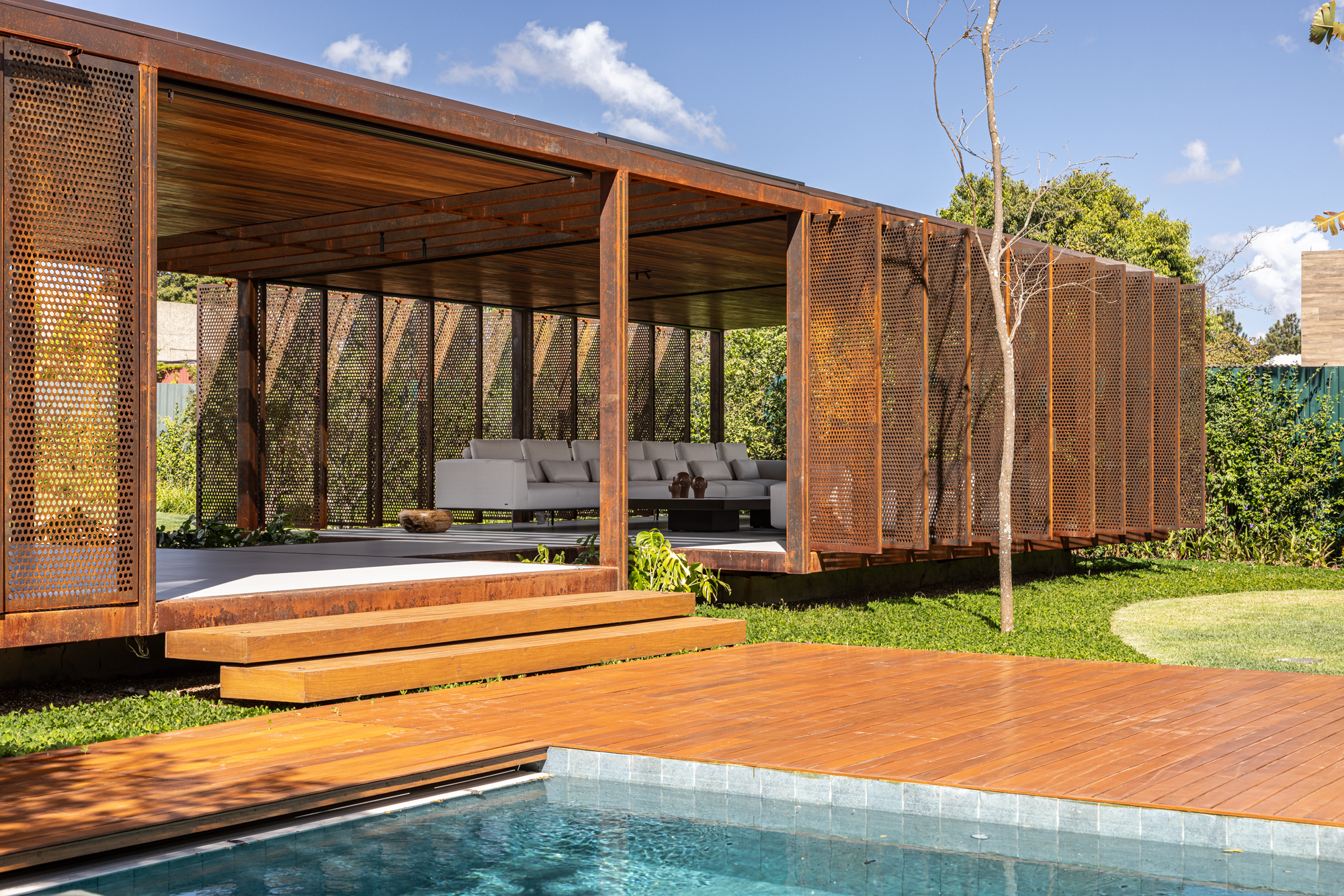 The pavilion’s structure is made of SAC 300 steel, initially installed without patina, allowing the characteristic “corten” coloring to develop naturally over the construction period. Raised on a concrete foundation to protect against moisture, the structure ensures durability. The project includes a barbecue area, a bathroom, a storage room, and a spacious social area, providing functionality and comfort in a single integrated space.