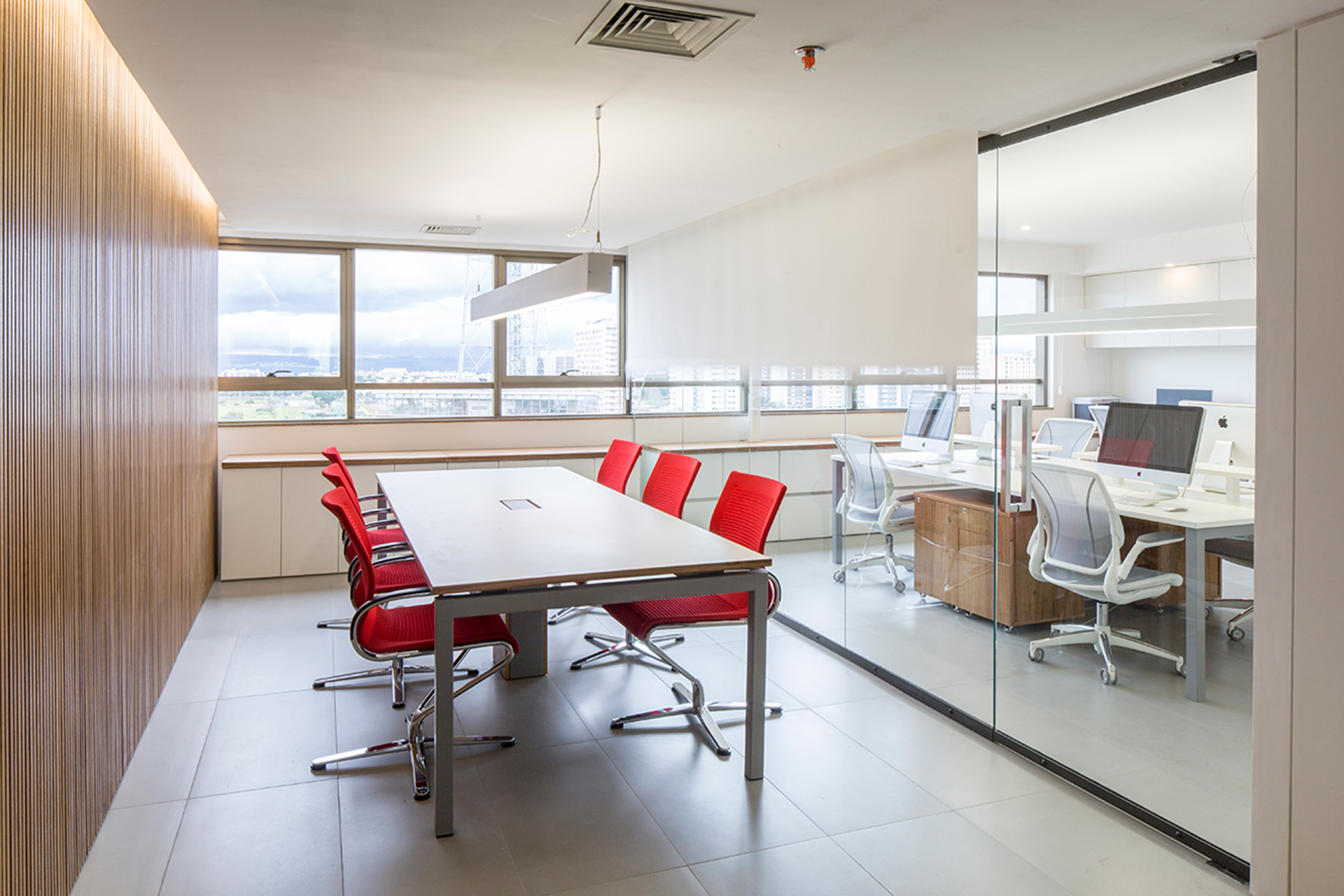 O ambiente de trabalho, com 60m², foi cuidadosamente projetado para um escritório de advocacia localizado em um edifício comercial próximo ao eixo monumental de Brasília. O espaço é dividido em dois ambientes principais por um plano de vidro, criando uma clara separação entre a área de trabalho e a sala de reuniões.
