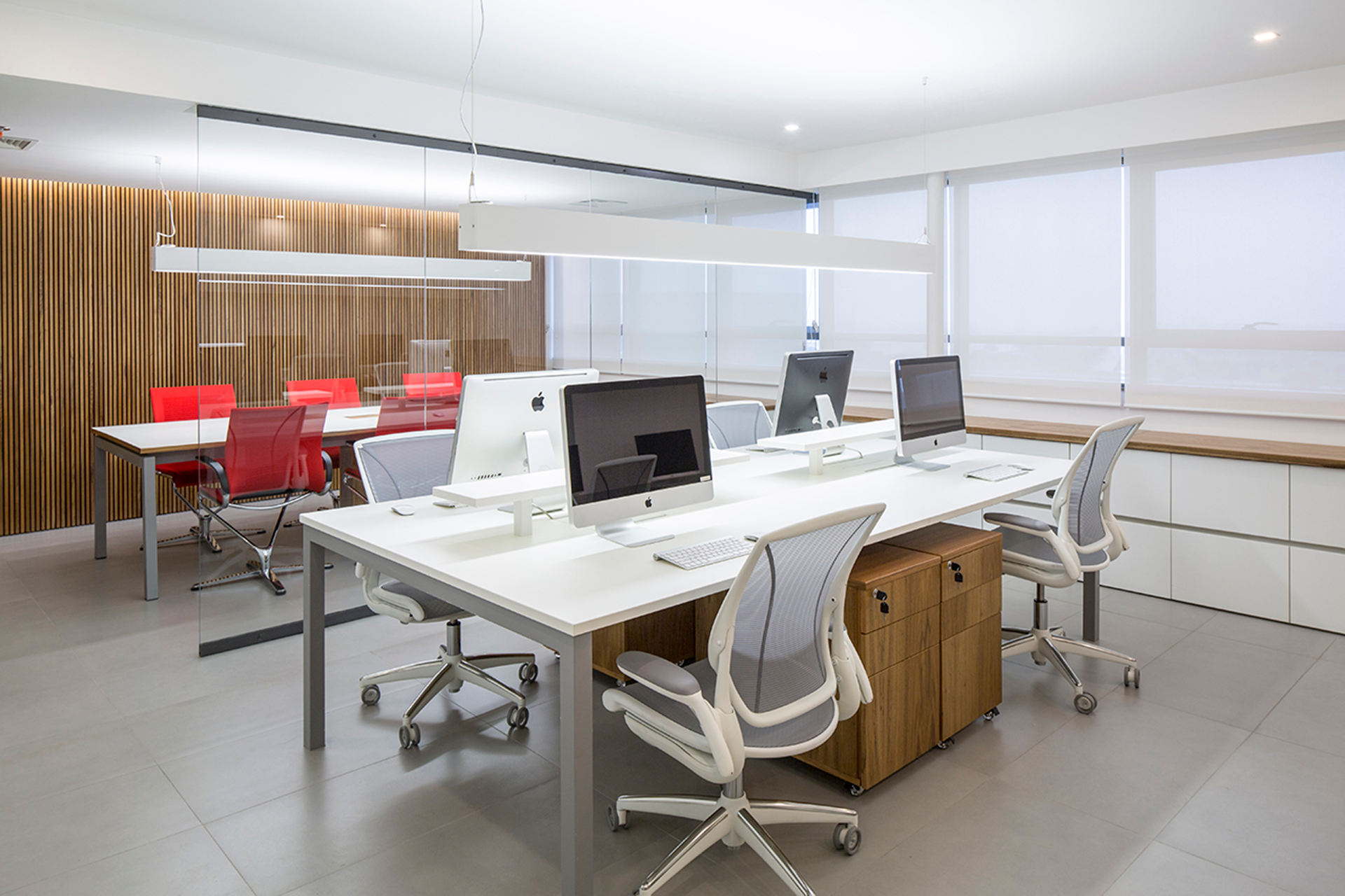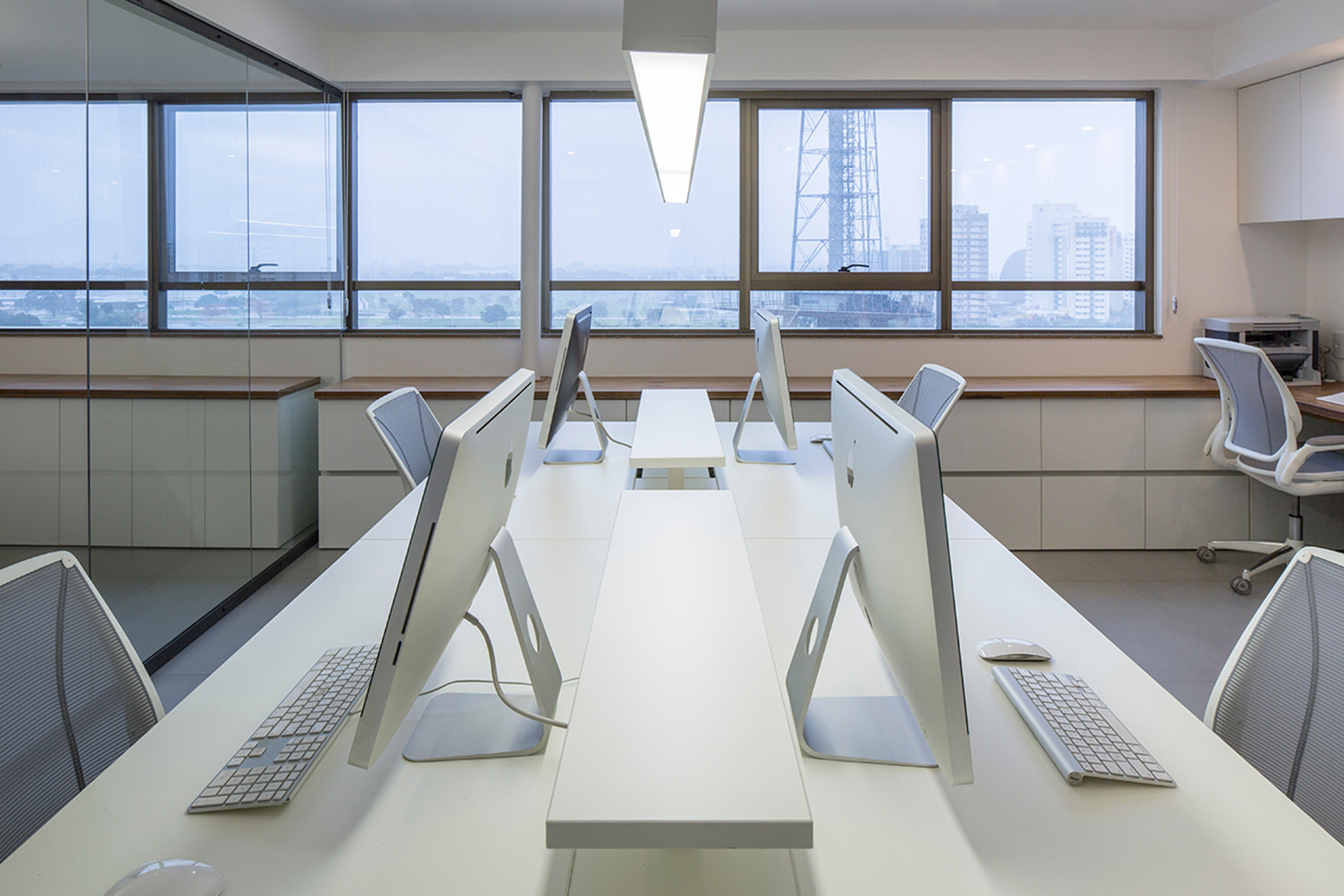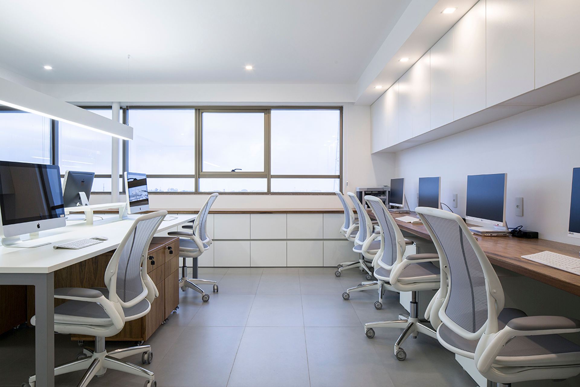 O mobiliário e a marcenaria desempenham um papel central na definição do ambiente, com uma composição harmônica de superfícies brancas e madeira clara. As mesas de trabalho, posicionadas perpendicularmente às janelas, são realçadas por luminárias lineares suspensas, proporcionando uma iluminação precisa e funcional. Armários baixos, dispostos ao longo do peitoril das janelas, oferecem soluções práticas de armazenamento para o dia a dia.