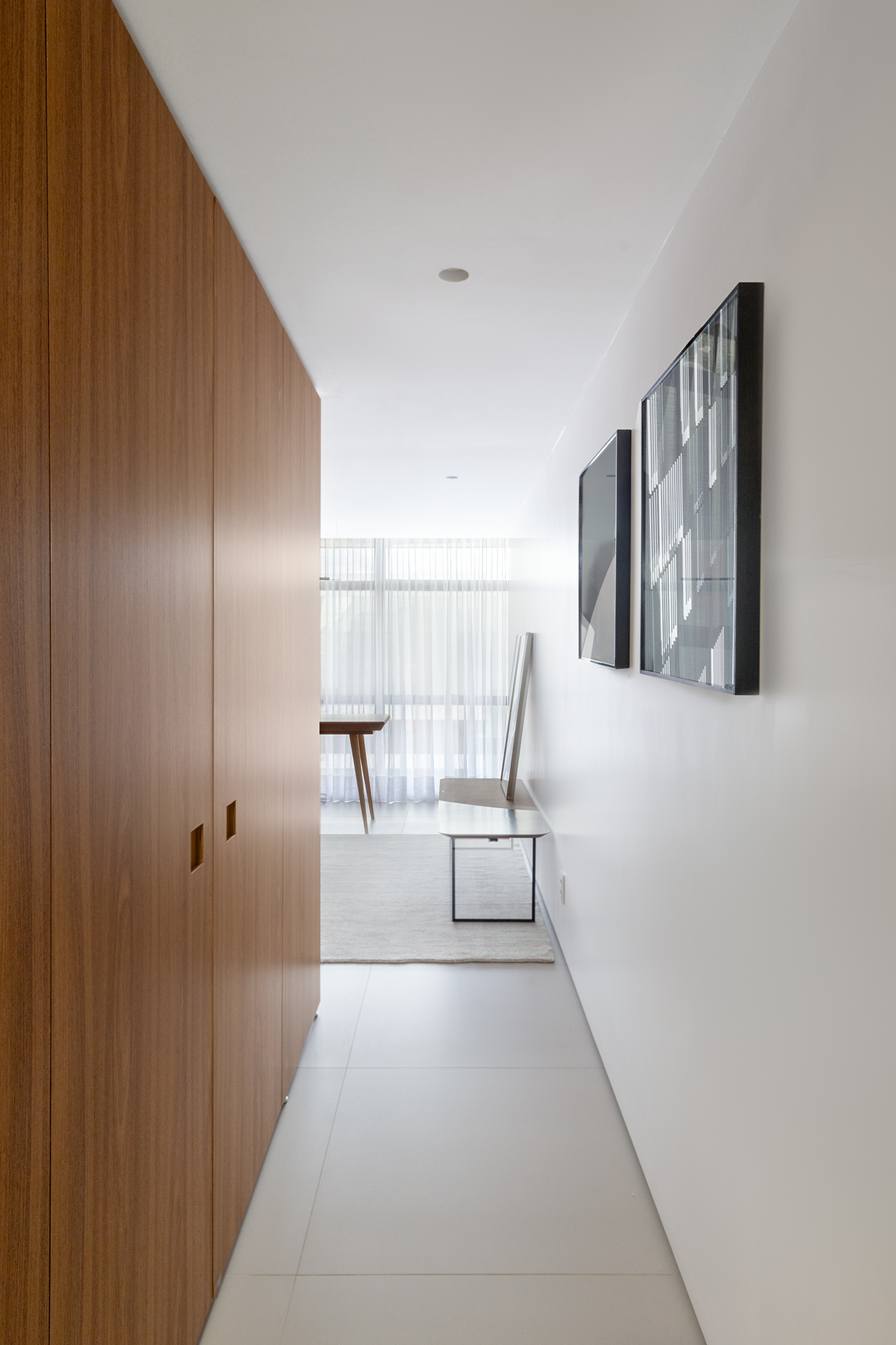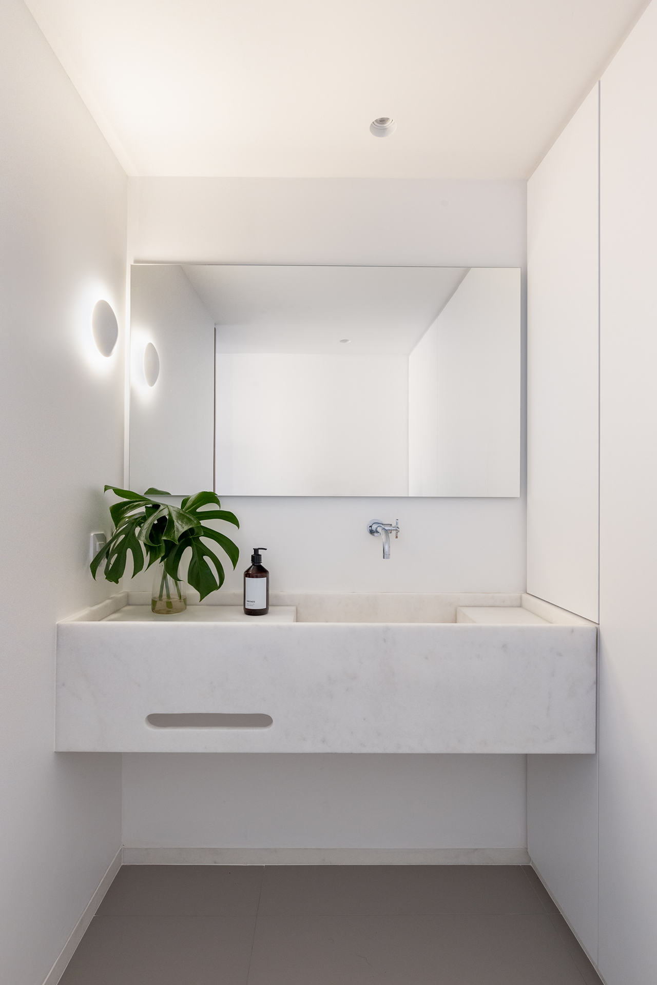 No banheiro, a marcenaria desempenha um papel duplo, atuando como painel e também como armário funcional. Esse design permite o aproveitamento inteligente do espaço, mantendo a harmonia visual e a praticidade.