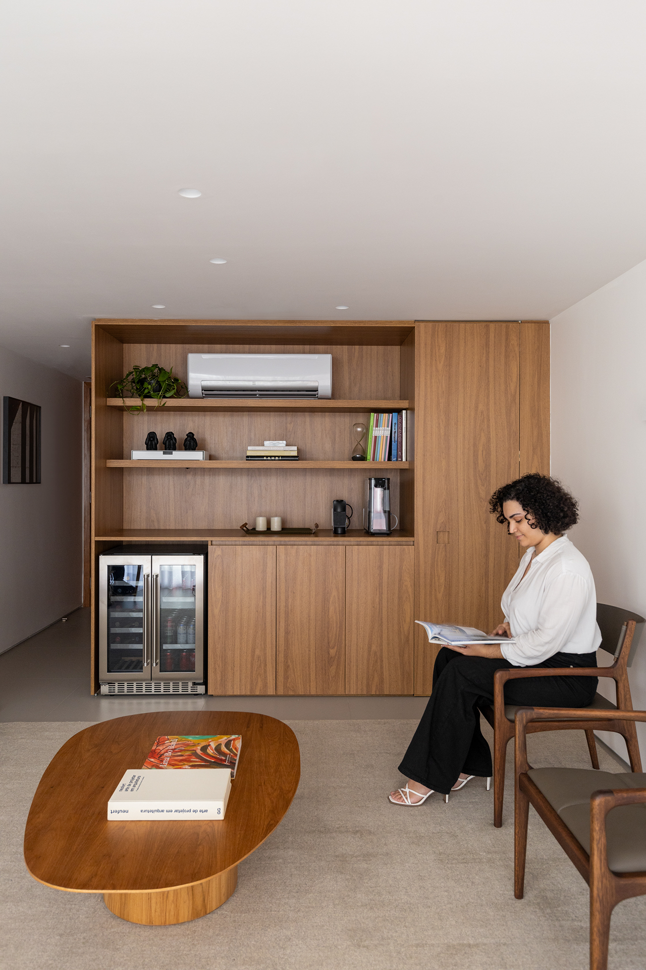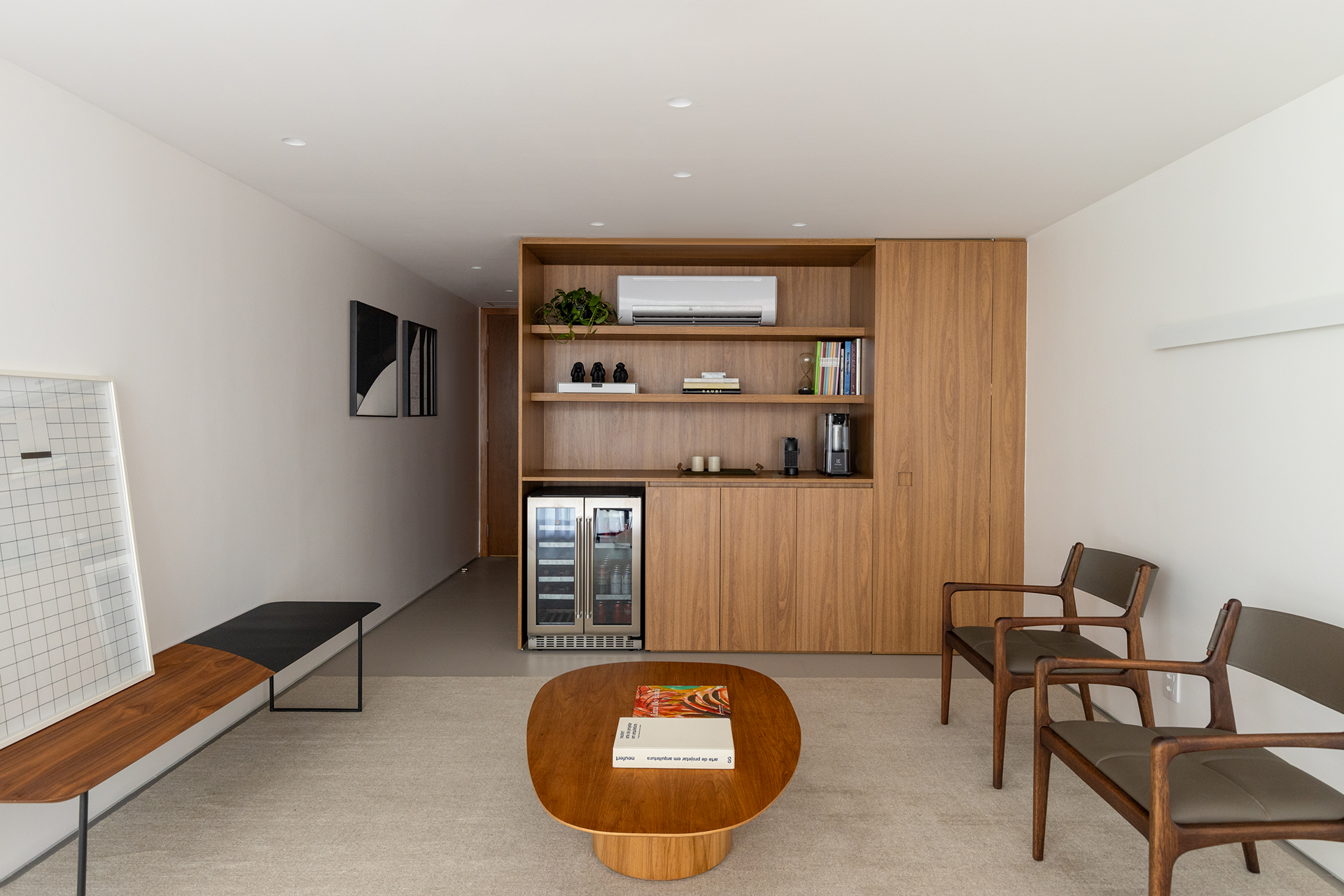 Localizado no Setor Comercial Norte, o escritório de advocacia de 23m² foi projetado com foco na funcionalidade. A sala possui uma mesa central para o proprietário, acompanhada de um espaço de estar integrado que permite a realização de pequenas reuniões e oferece um ambiente mais informal para interações.