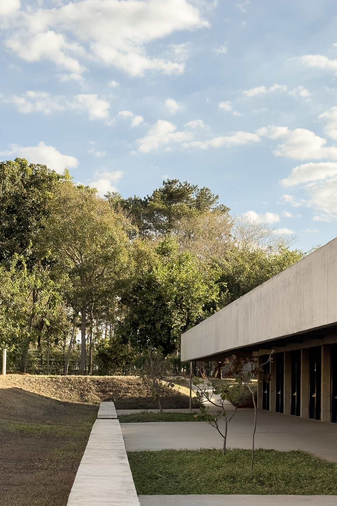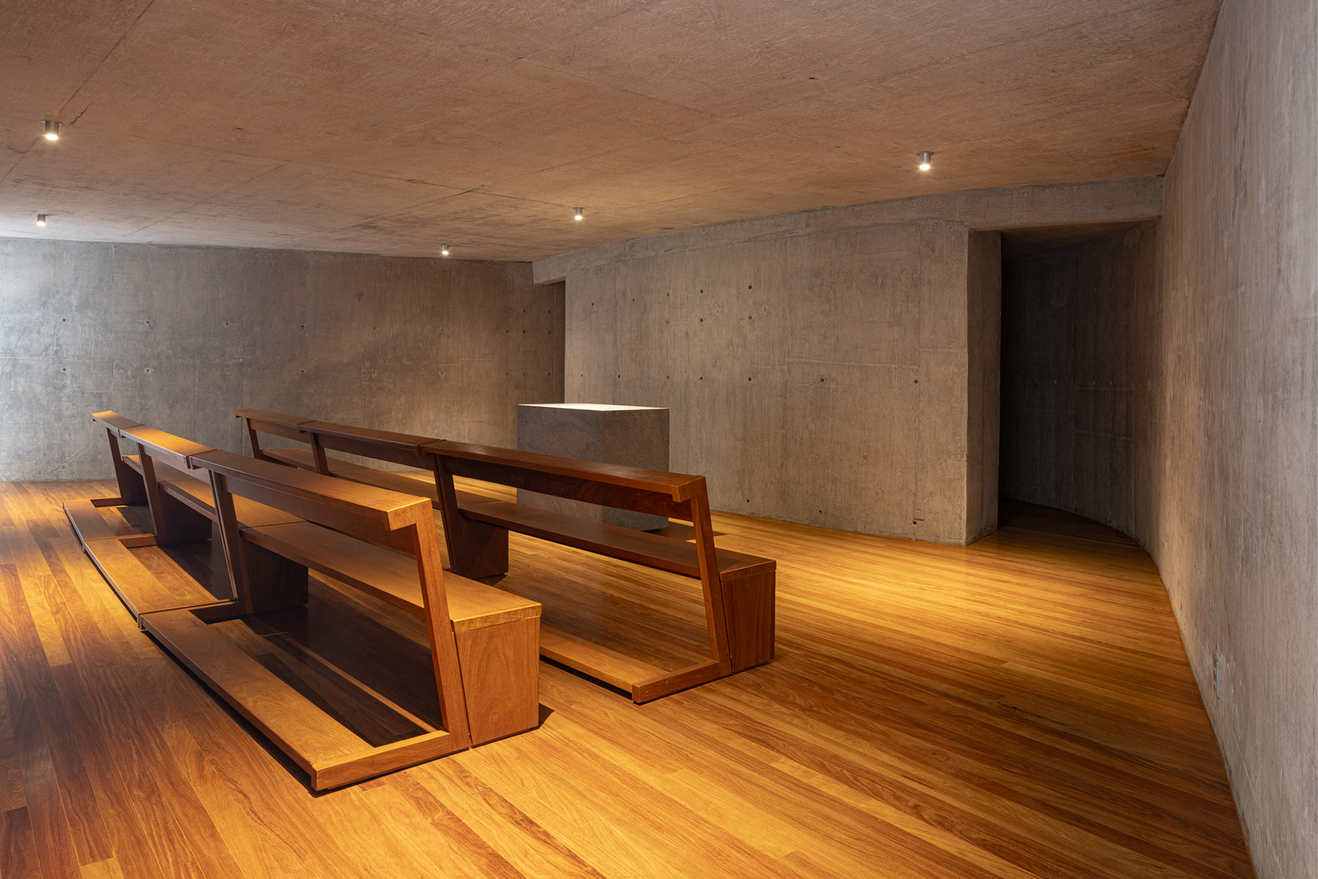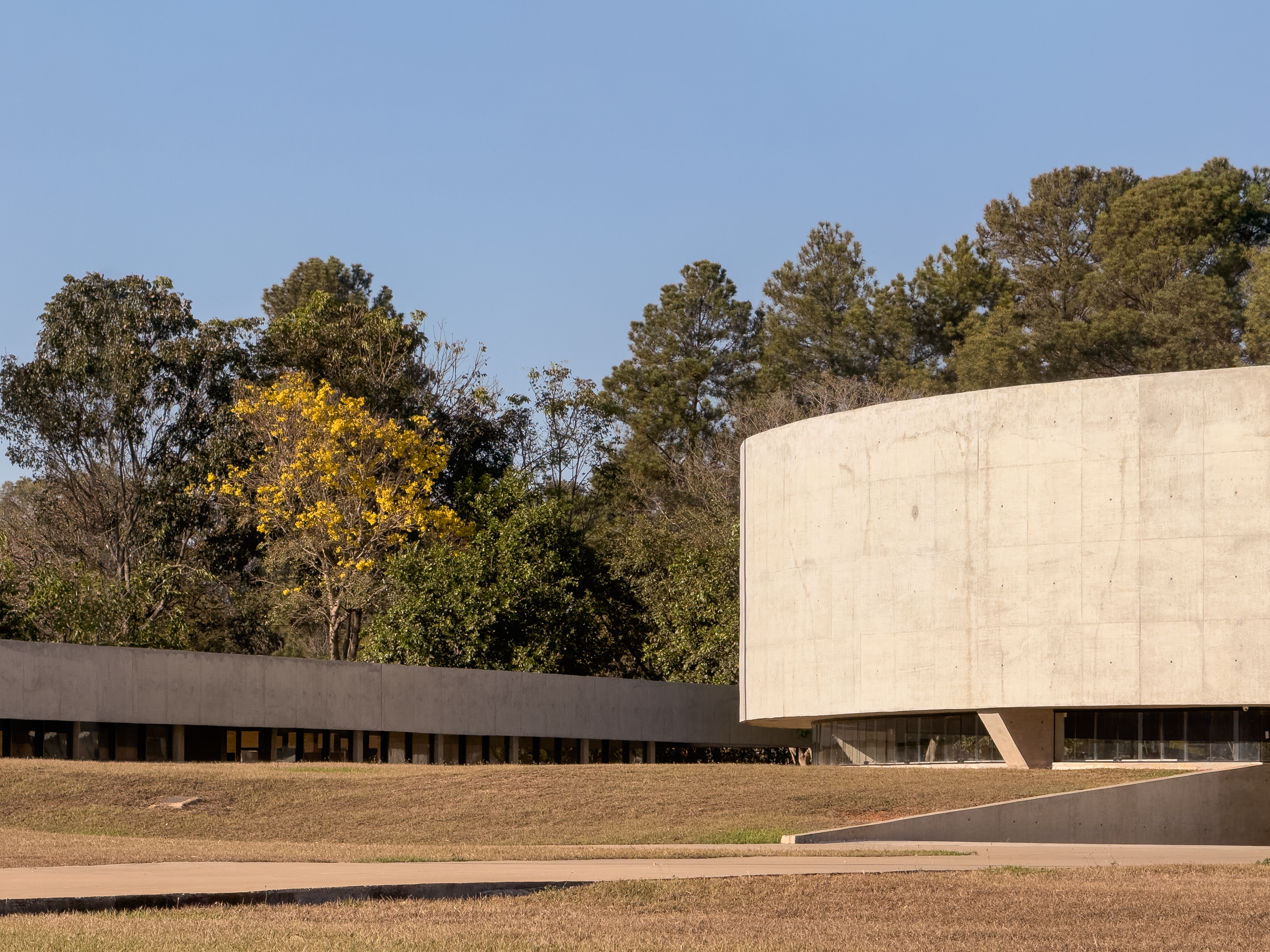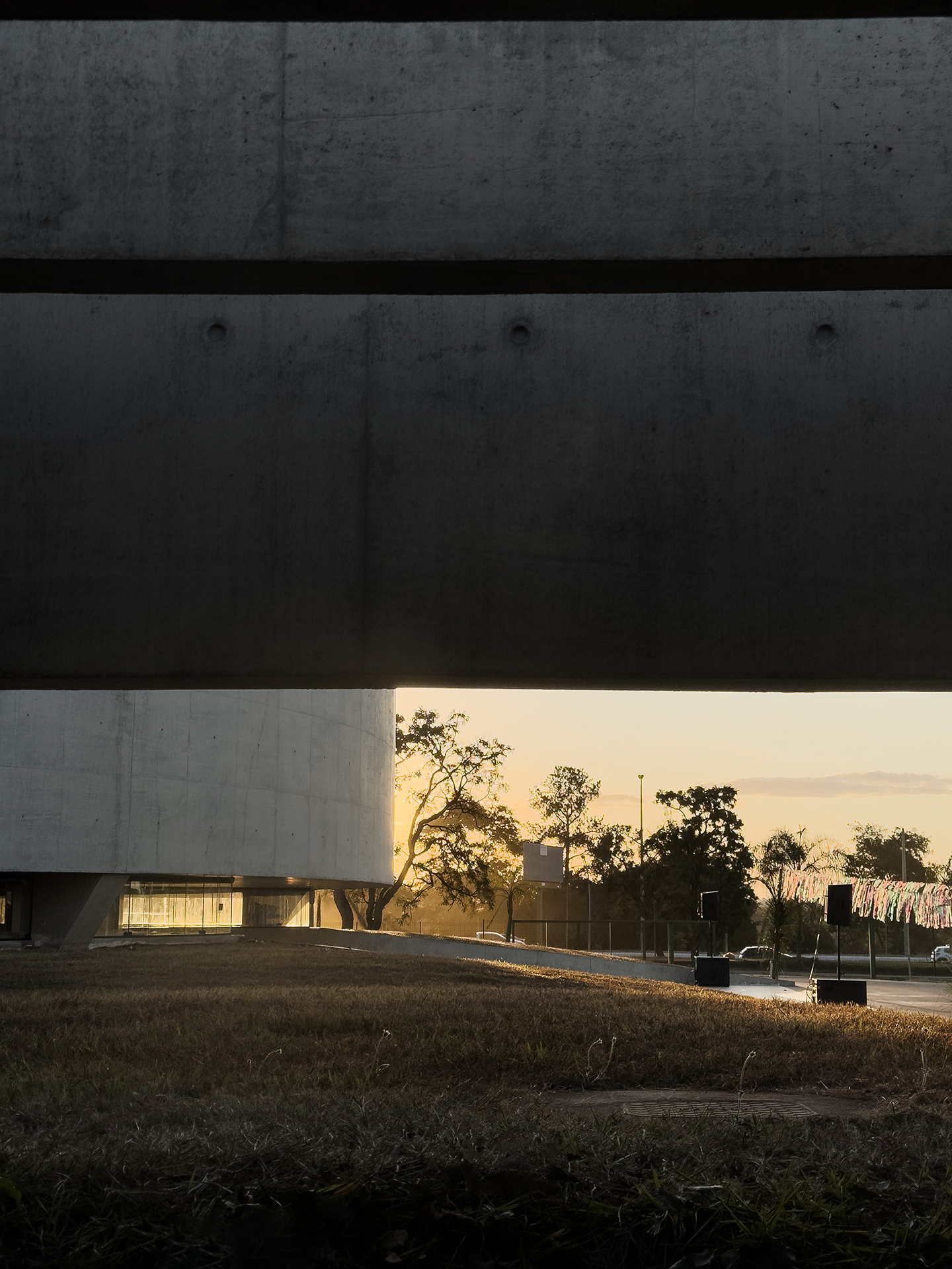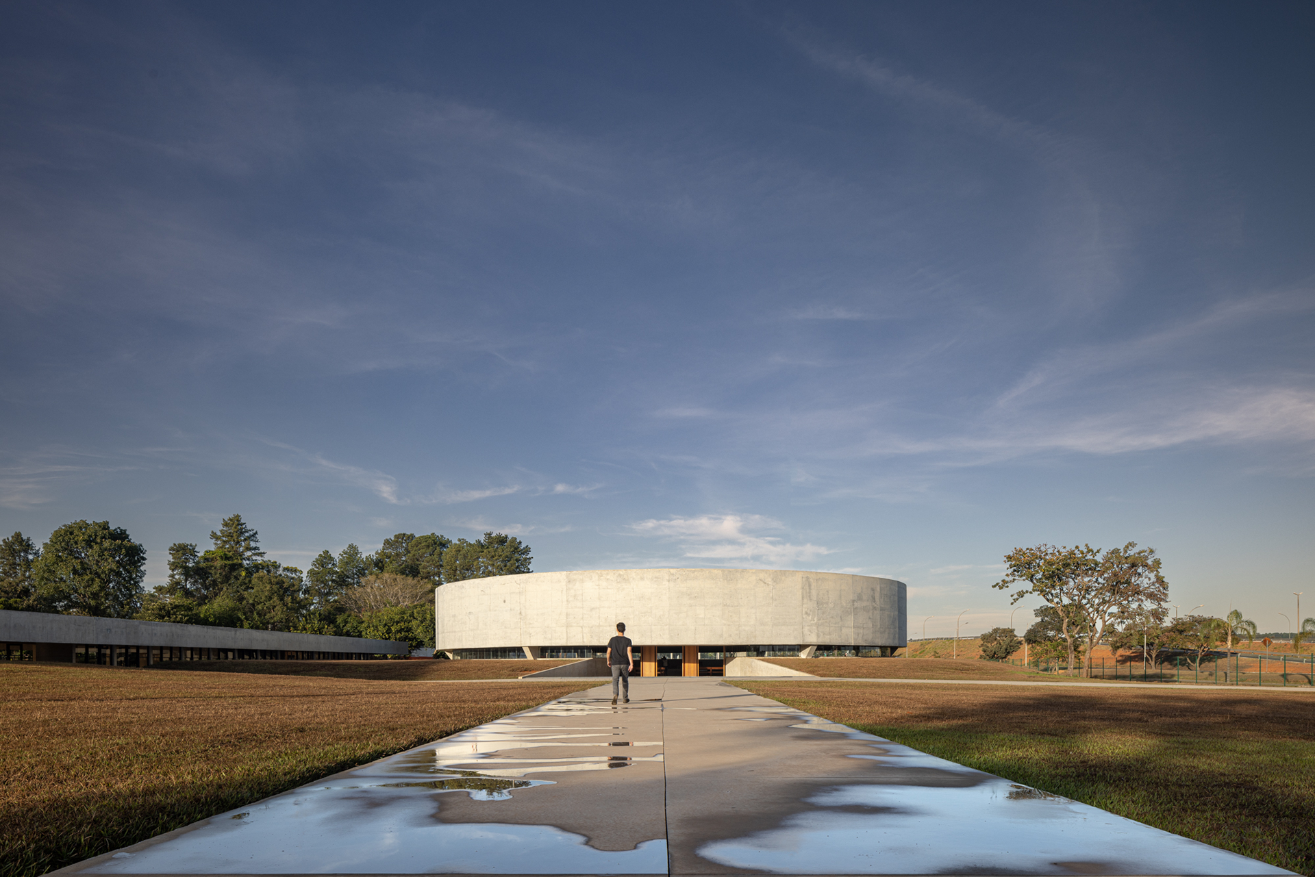 A luz natural penetra pelo anel circular da cobertura, transformando a espacialidade interna da nave, disposta meio nível abaixo da cota natural do terreno, o que permite o transbordamento da paisagem através de uma pequena abertura rente a rés-do-chão à medida que preserva a intimidade do espaço interno. Tal visada só é possível pela elevação do volume circular de concreto aparente suspenso por seis pilares integrantes da estrutura de fundação encaixada na topografia. Ao revelar a presença do horizonte, a arquitetura torna-se elemento constitutivo da paisagem, uma abertura para a dimensão poética do mundo, entrelaçando a realidade material ao olhar de seu espectador.