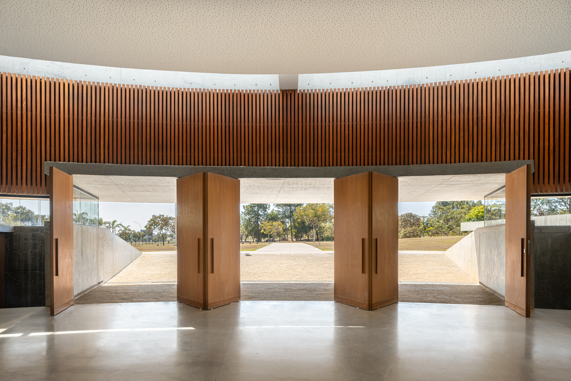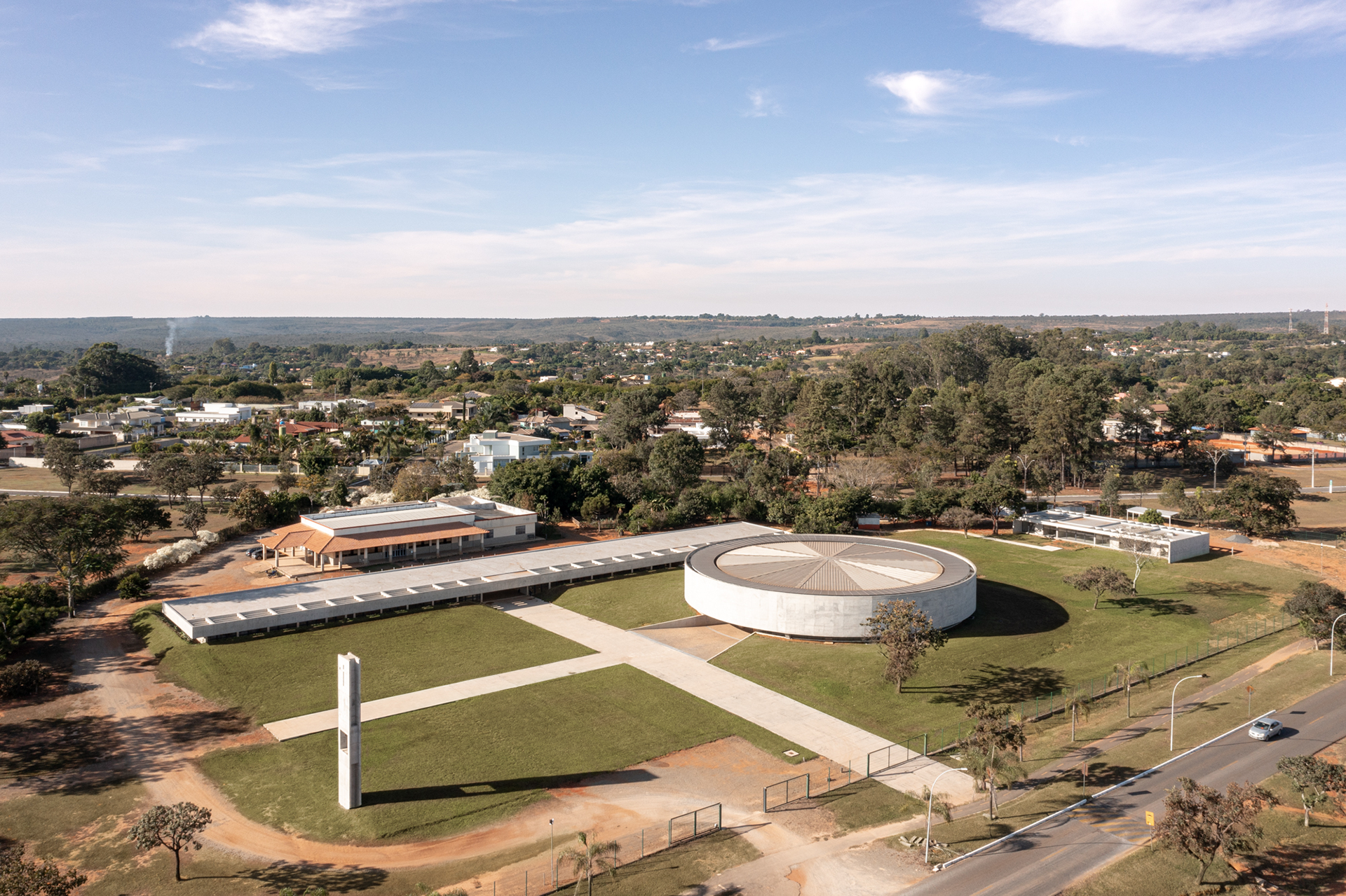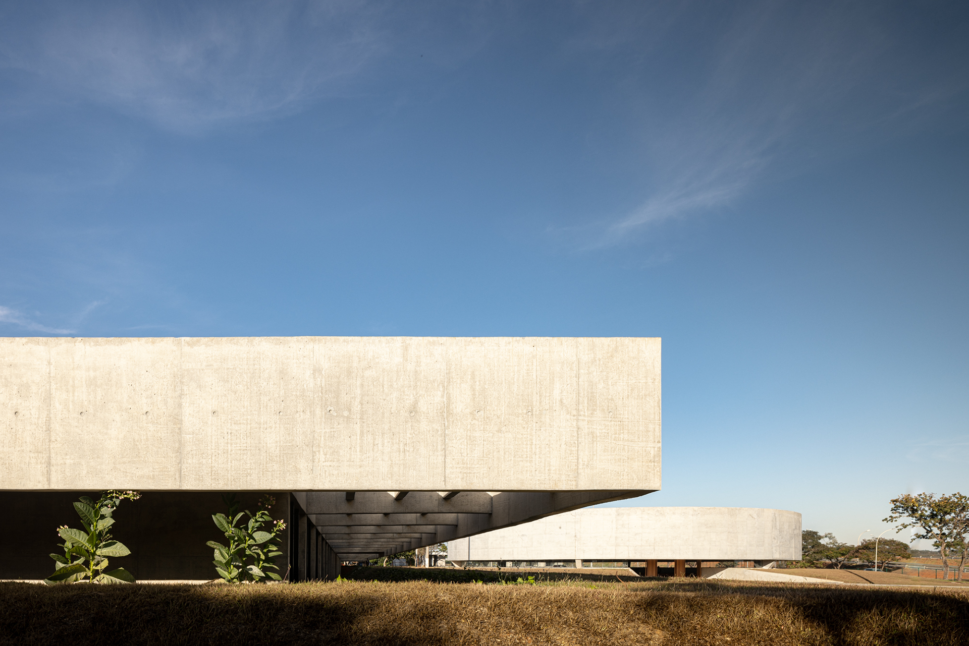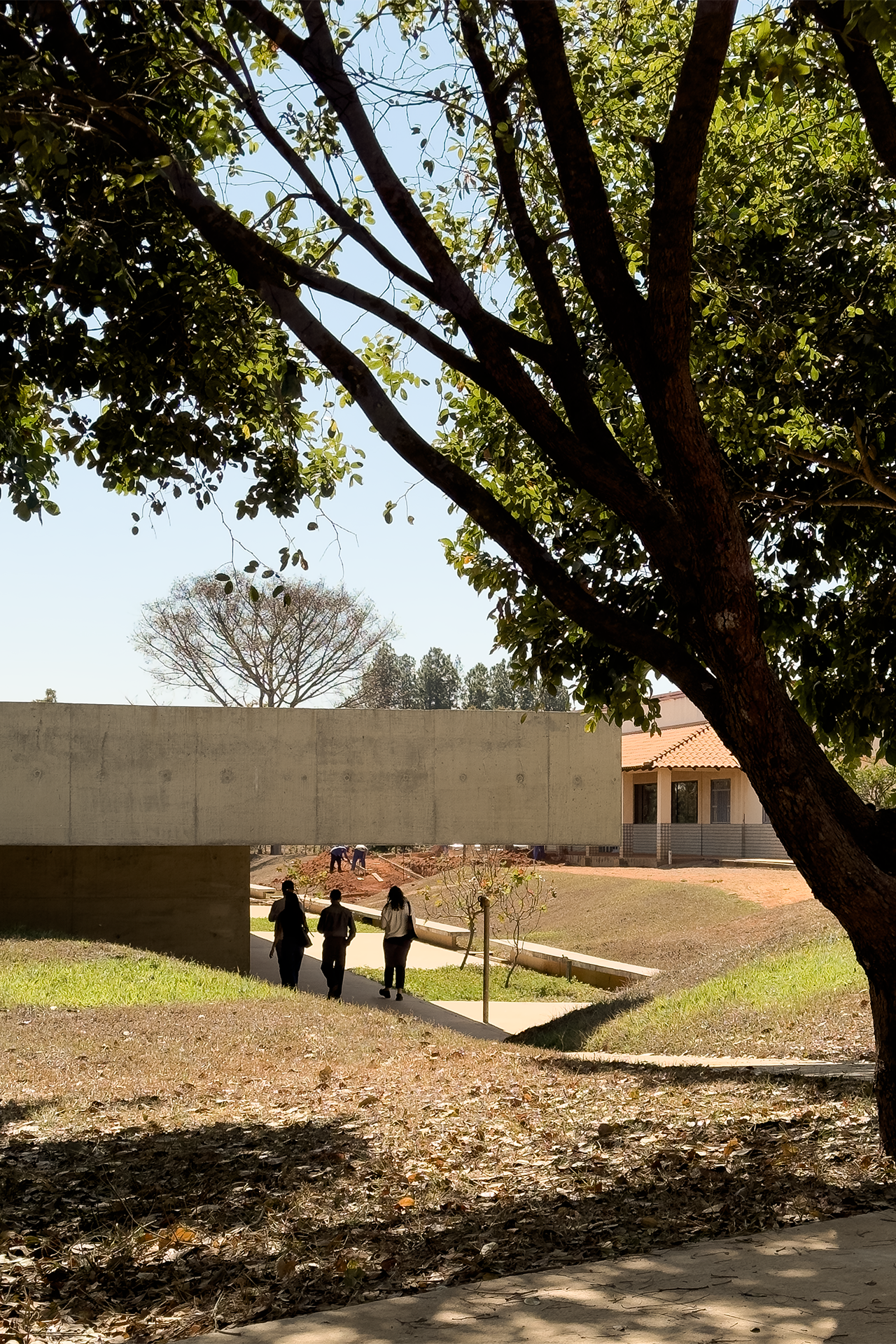 A luz natural penetra pelo anel circular da cobertura, transformando a espacialidade interna da nave, disposta meio nível abaixo da cota natural do terreno, o que permite o transbordamento da paisagem através de uma pequena abertura rente a rés-do-chão à medida que preserva a intimidade do espaço interno. Tal visada só é possível pela elevação do volume circular de concreto aparente suspenso por seis pilares integrantes da estrutura de fundação encaixada na topografia. Ao revelar a presença do horizonte, a arquitetura torna-se elemento constitutivo da paisagem, uma abertura para a dimensão poética do mundo, entrelaçando a realidade material ao olhar de seu espectador.