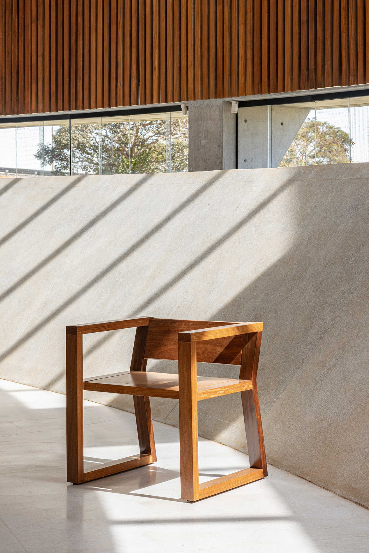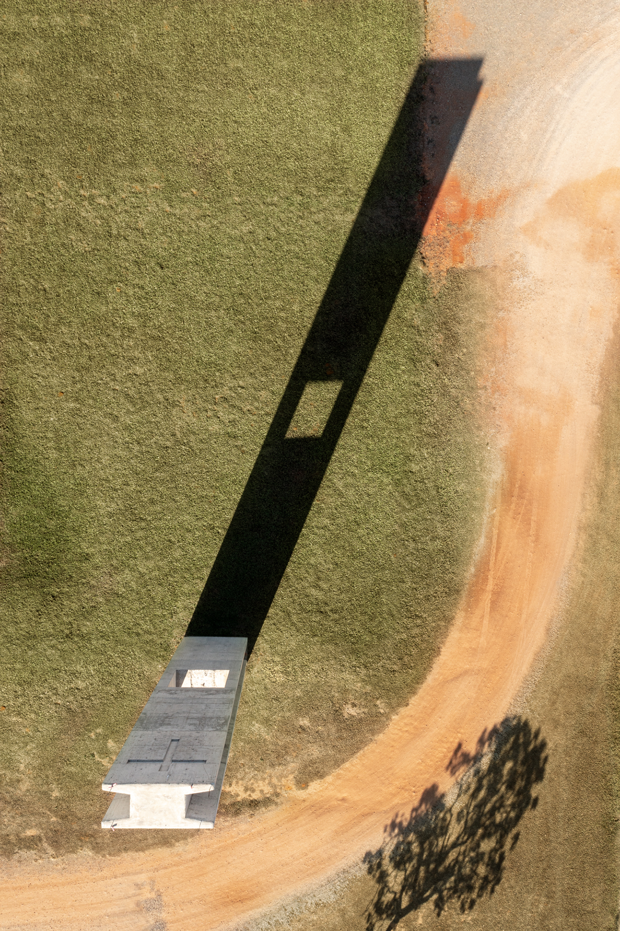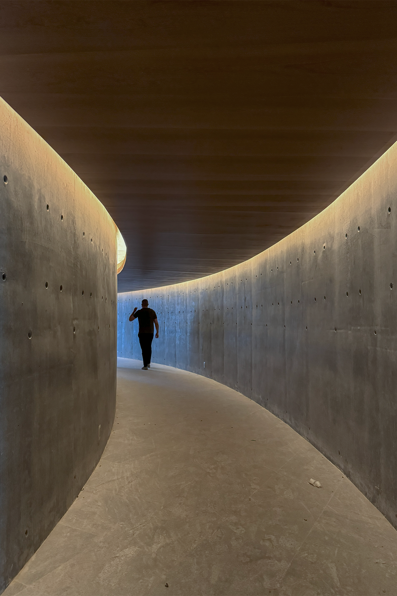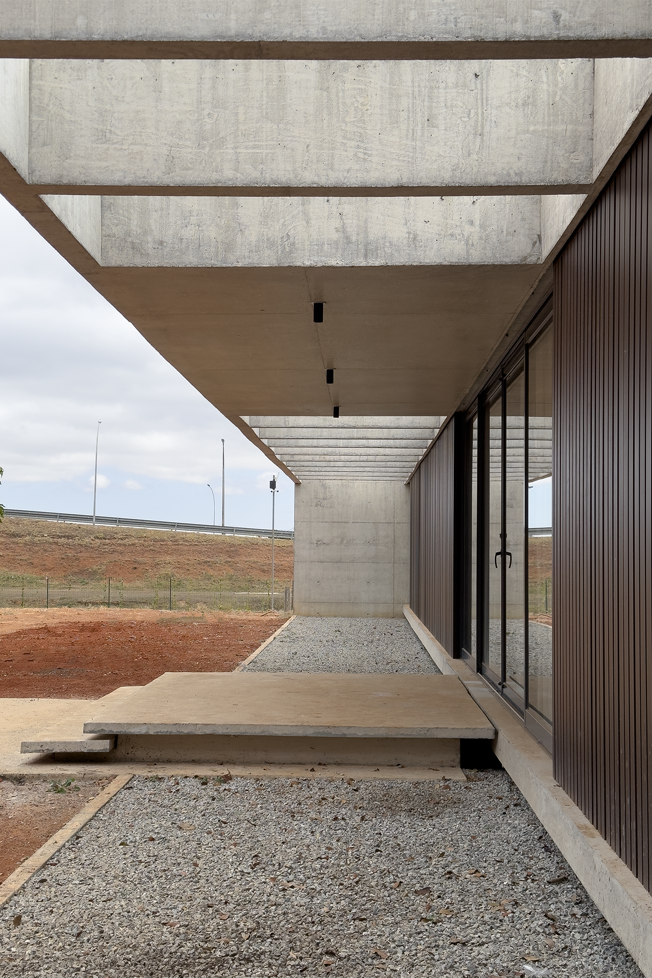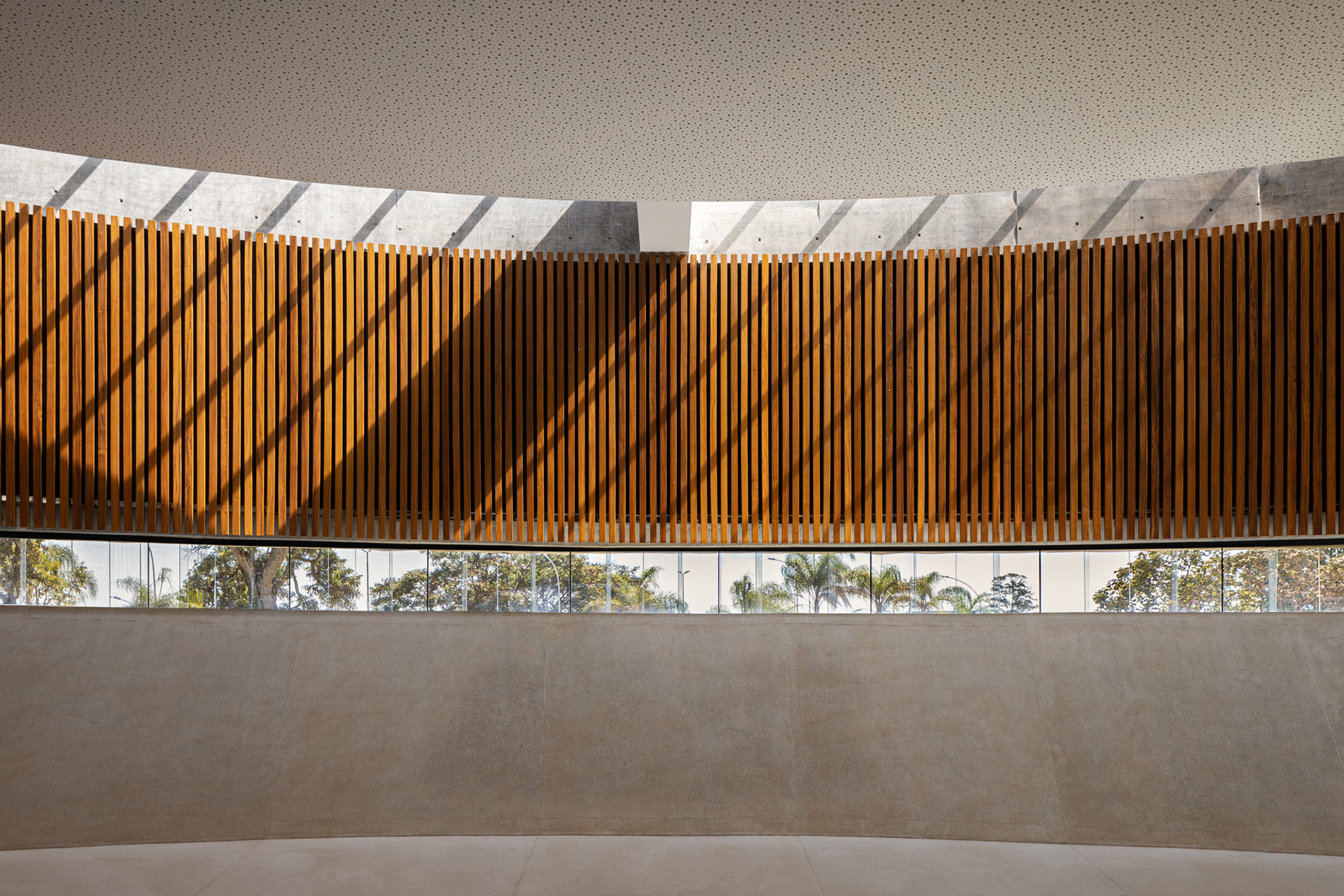 A luz natural penetra pelo anel circular da cobertura, transformando a espacialidade interna da nave, disposta meio nível abaixo da cota natural do terreno, o que permite o transbordamento da paisagem através de uma pequena abertura rente a rés-do-chão à medida que preserva a intimidade do espaço interno. Tal visada só é possível pela elevação do volume circular de concreto aparente suspenso por seis pilares integrantes da estrutura de fundação encaixada na topografia. Ao revelar a presença do horizonte, a arquitetura torna-se elemento constitutivo da paisagem, uma abertura para a dimensão poética do mundo, entrelaçando a realidade material ao olhar de seu espectador.