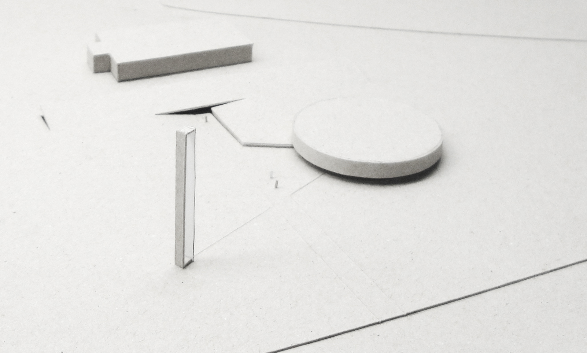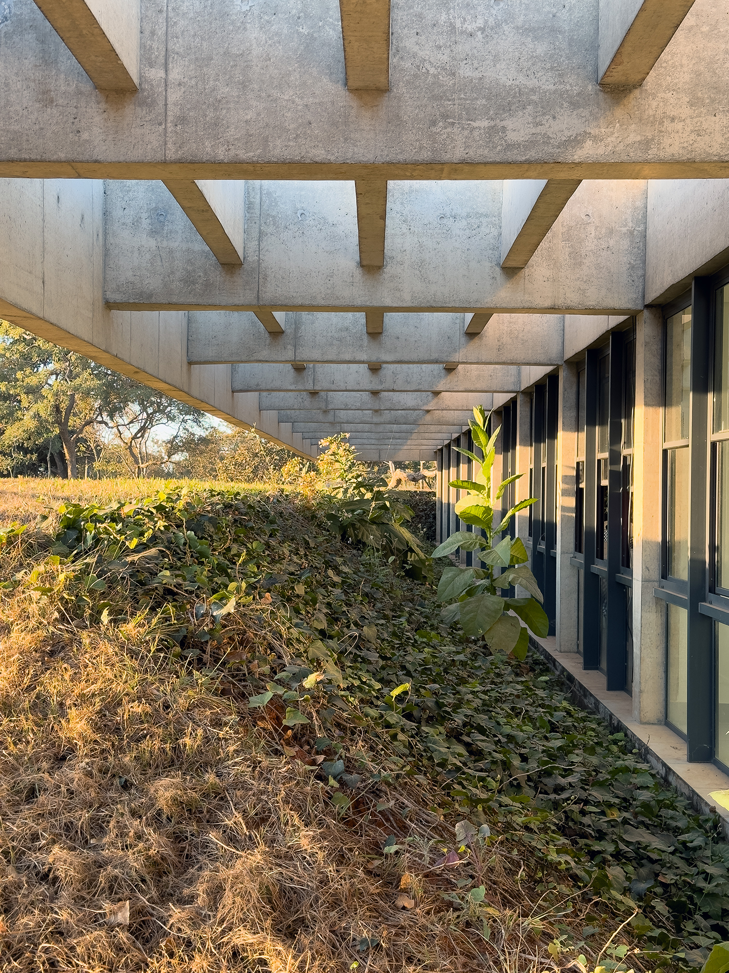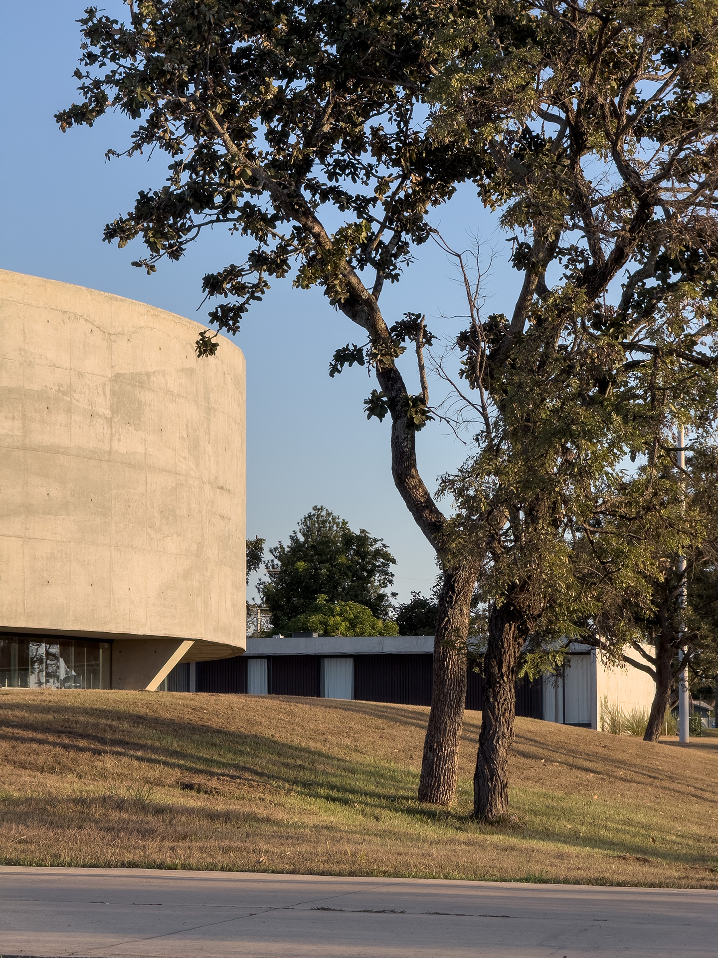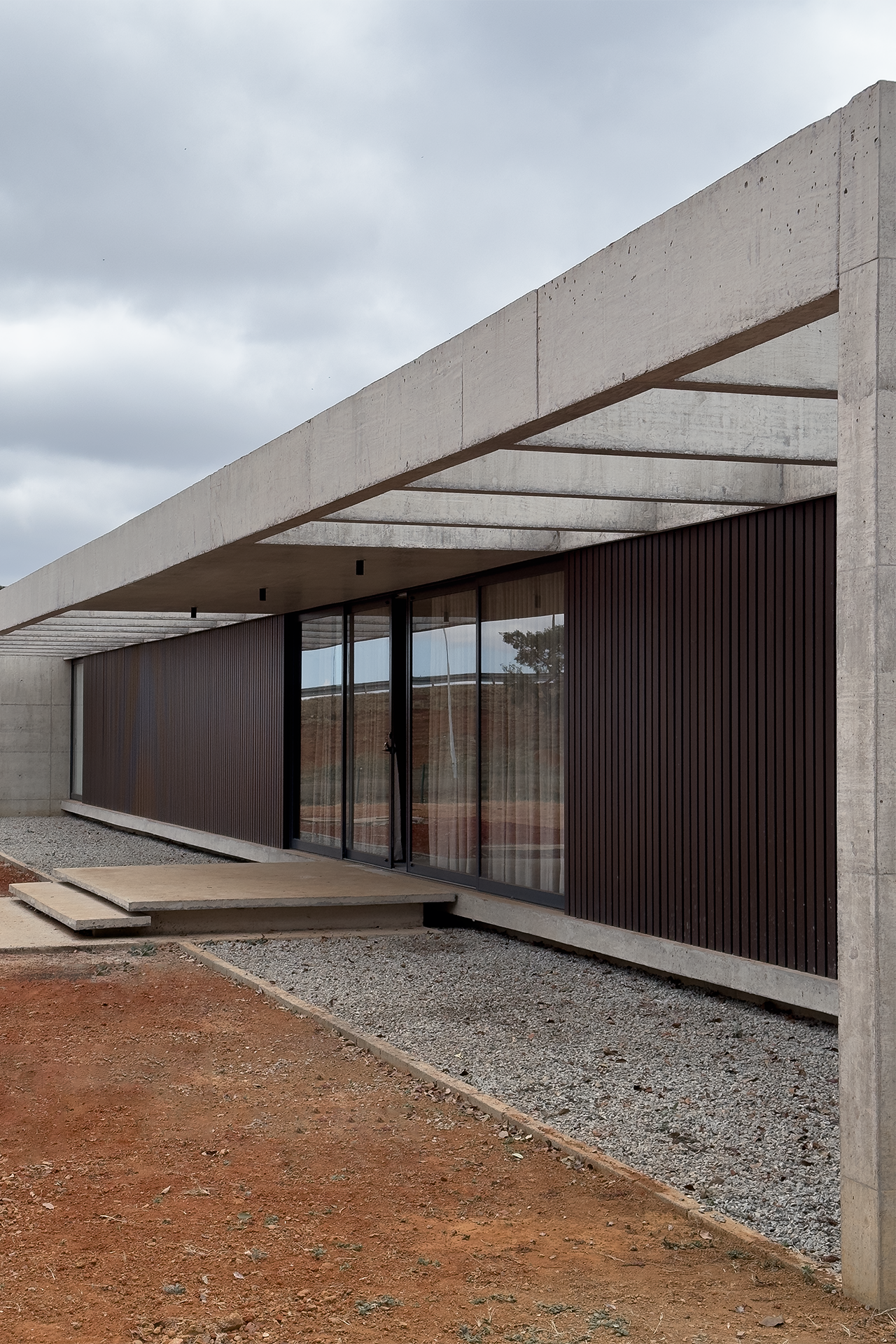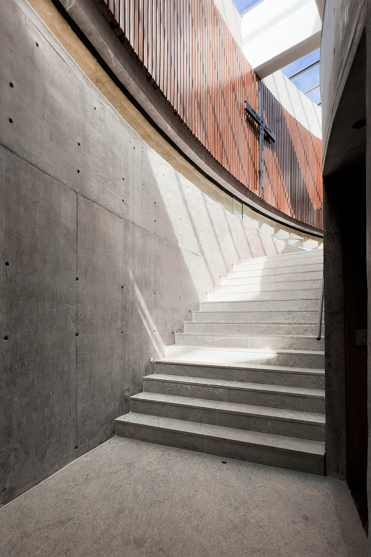 A luz natural penetra pelo anel circular da cobertura, transformando a espacialidade interna da nave, disposta meio nível abaixo da cota natural do terreno, o que permite o transbordamento da paisagem através de uma pequena abertura rente a rés-do-chão à medida que preserva a intimidade do espaço interno. Tal visada só é possível pela elevação do volume circular de concreto aparente suspenso por seis pilares integrantes da estrutura de fundação encaixada na topografia. Ao revelar a presença do horizonte, a arquitetura torna-se elemento constitutivo da paisagem, uma abertura para a dimensão poética do mundo, entrelaçando a realidade material ao olhar de seu espectador.