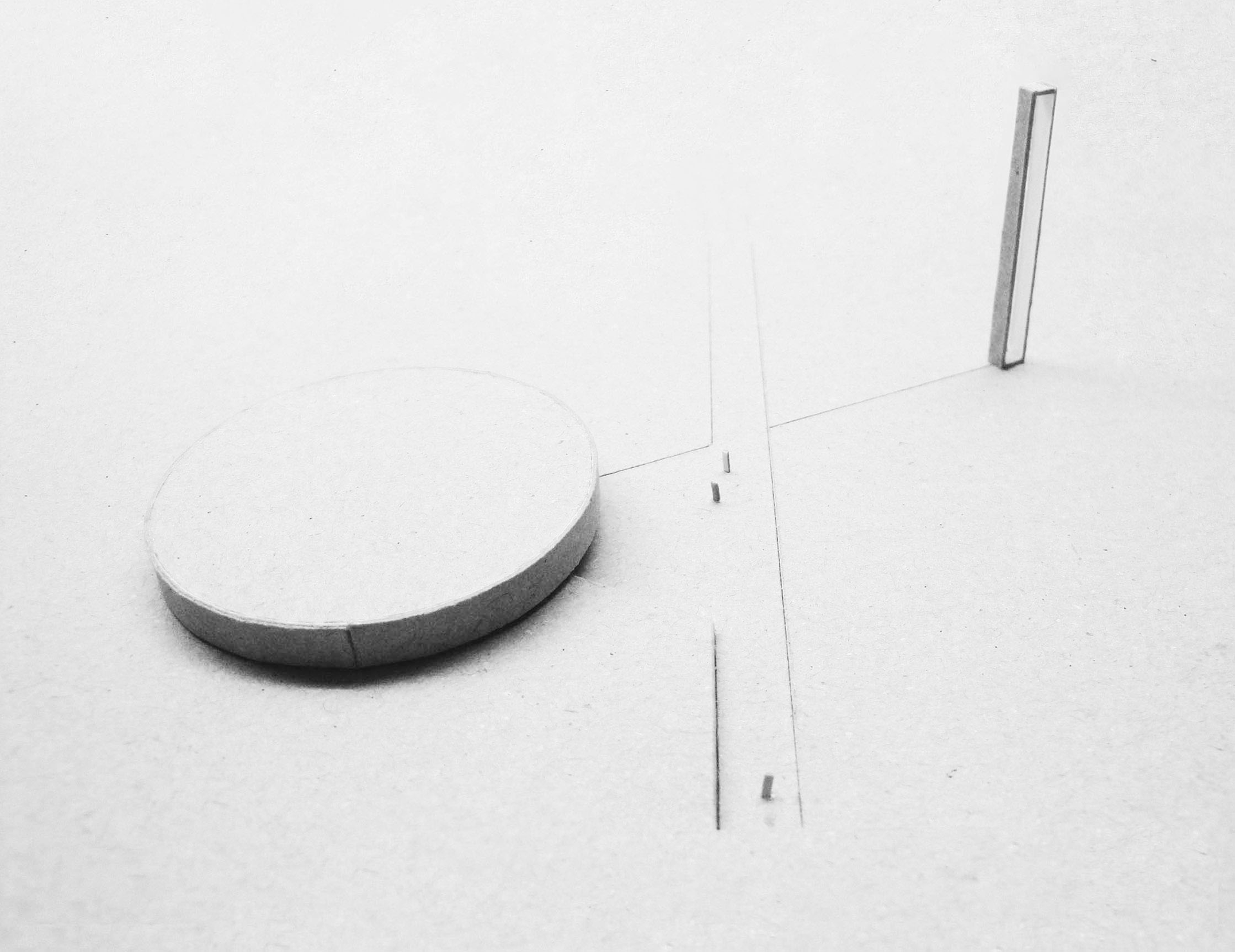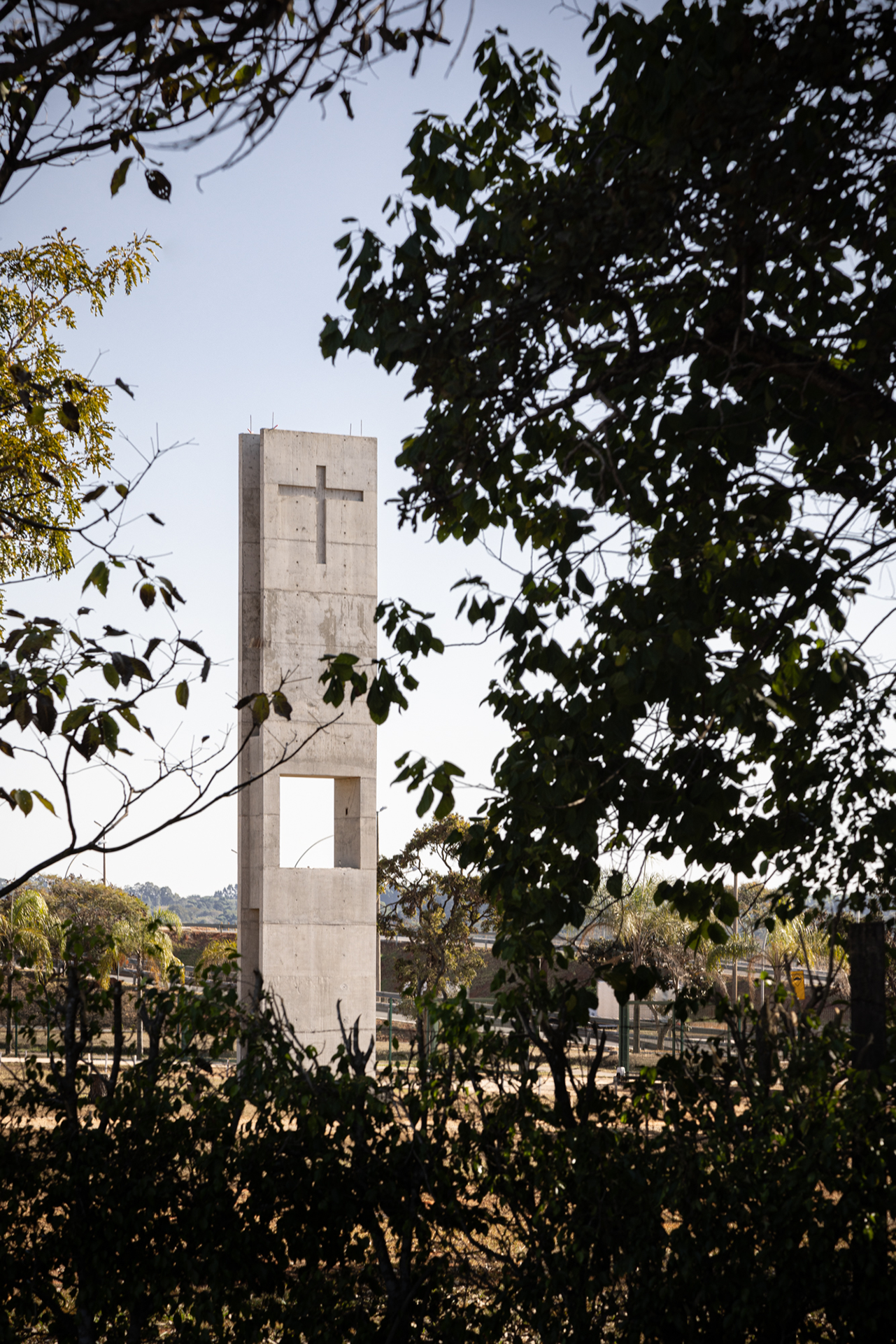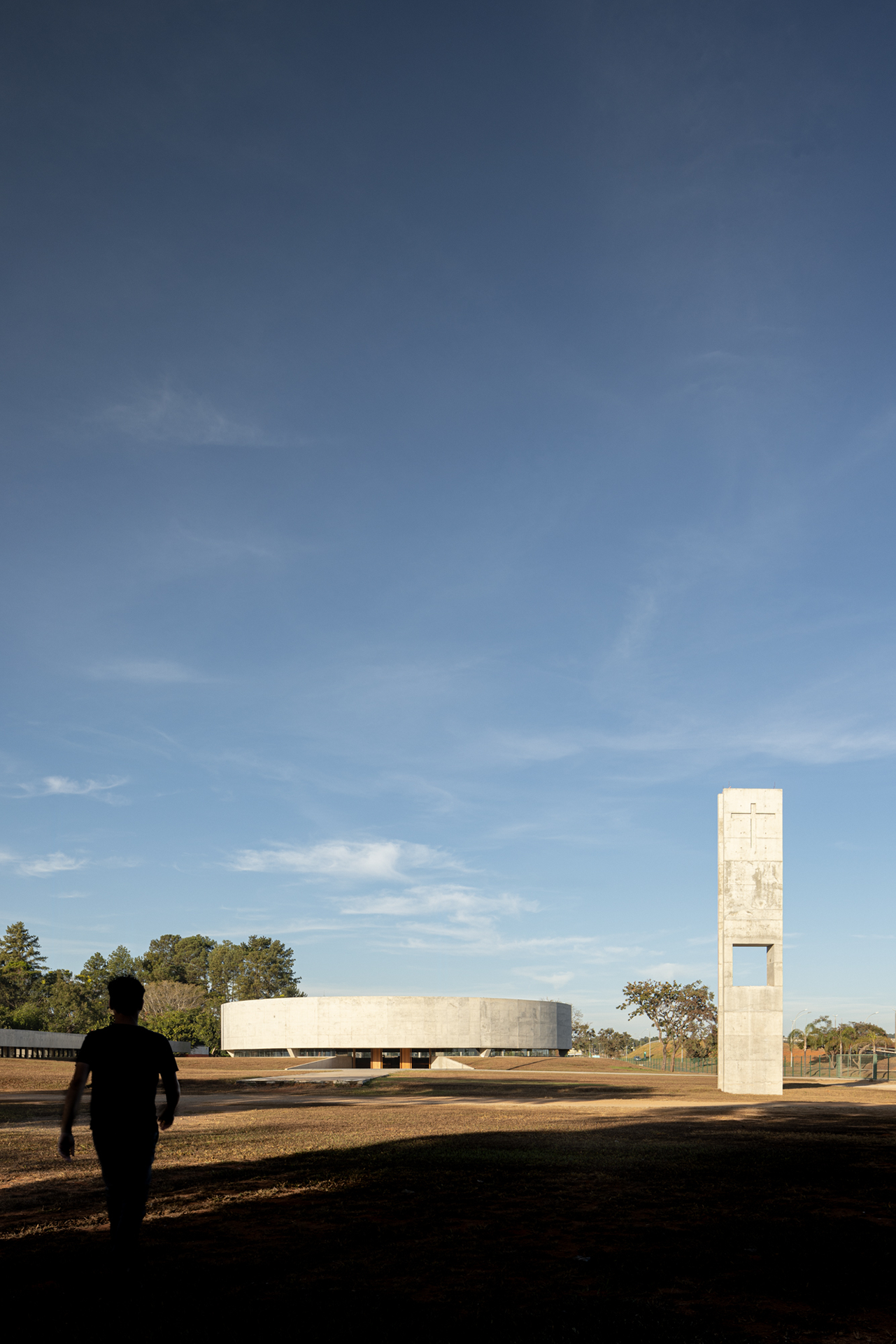 O traçado gerador do projeto é determinado por dois eixos principais. O eixo noroeste-sudeste interliga a nave circular, o anexo e a edificação existente ao fundo, onde localizam-se as atividades paroquianas. Ao longo de sua extensão, configura-se uma praça linear, um espaço de estar voltado para a cidade, que atua como suporte ao percurso errático daqueles imersos no ato ritualístico ou mesmo ao viajante da estrada, na busca pela suspensão do cotidiano ou de um refúgio dos tormentos do próprio existir. Perpendicularmente, o eixo nordeste-sudoeste preserva a visão contemplativa: o cruzamento da linha do horizonte com o volume vertical do campanário sinaliza e orienta o visitante ou àqueles que à distância passam em grande velocidade na via expressa.